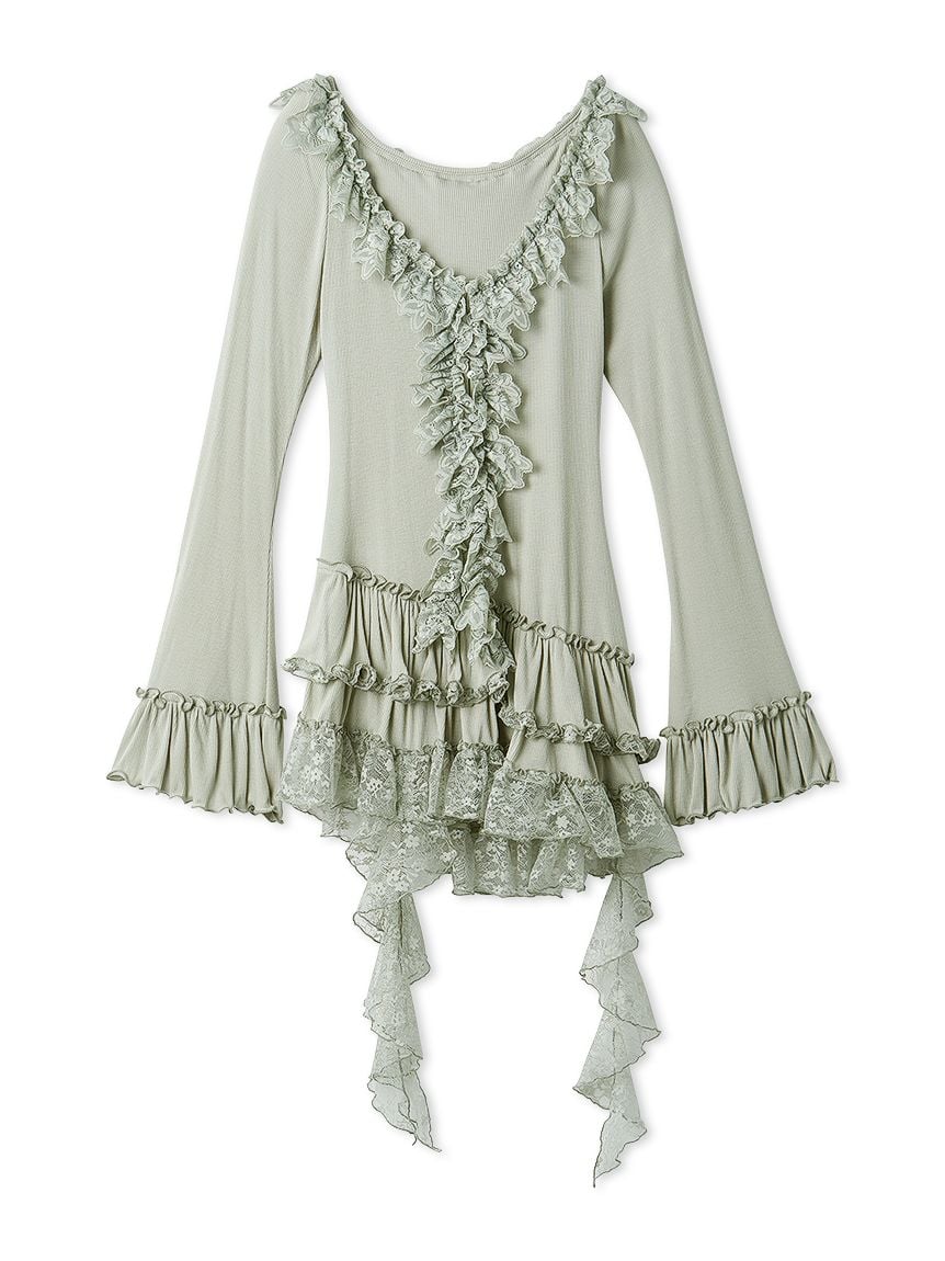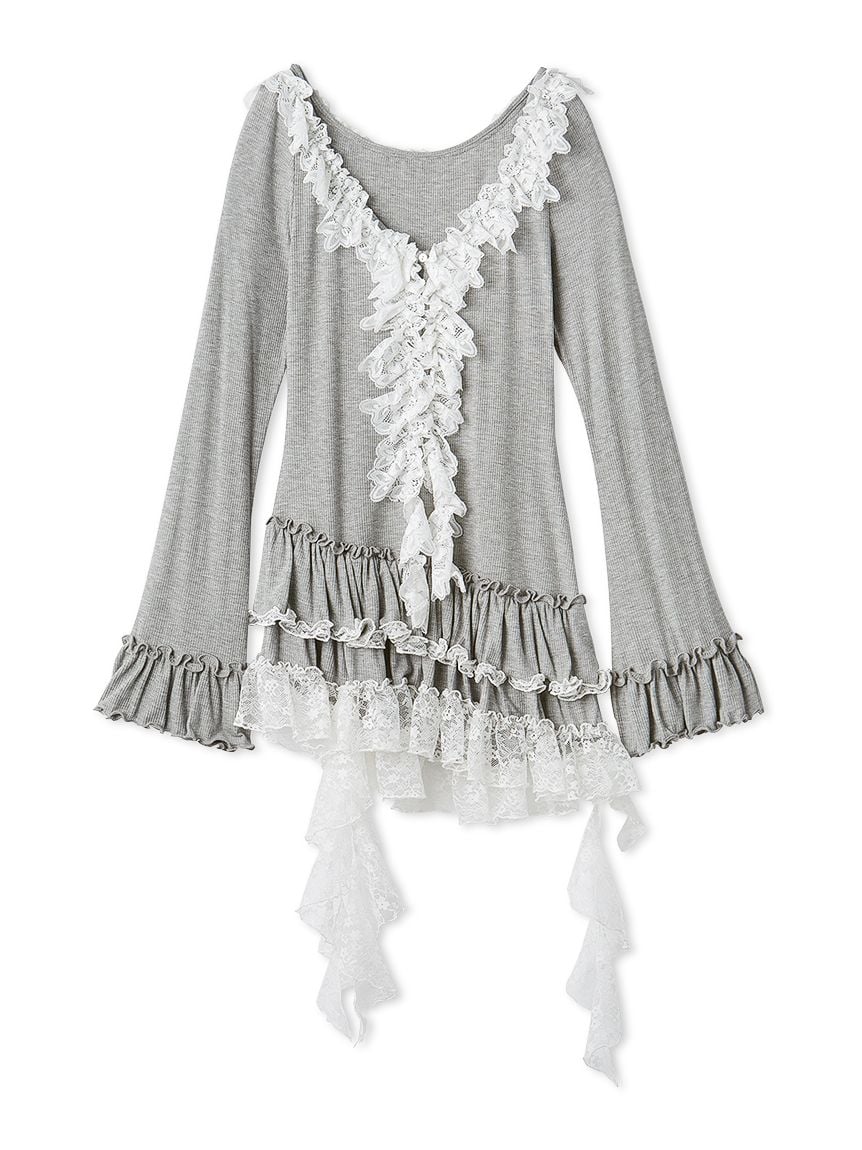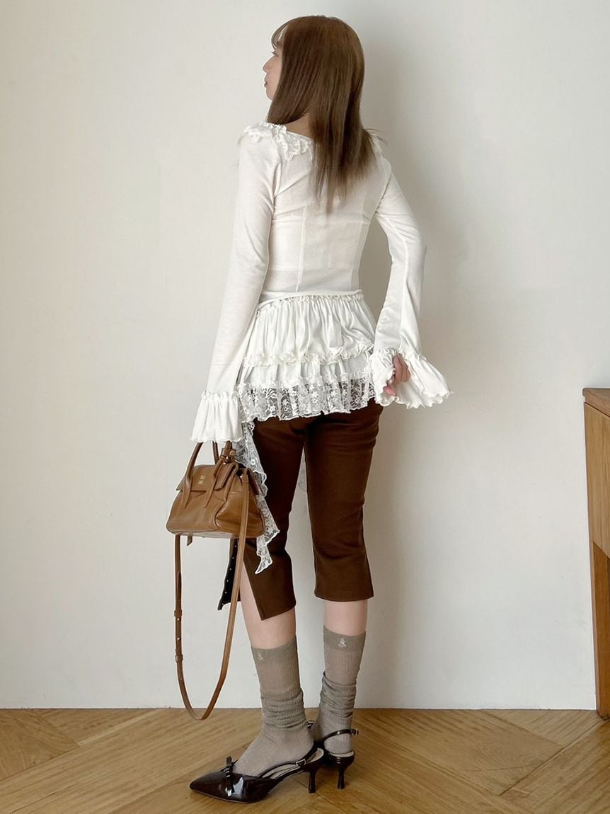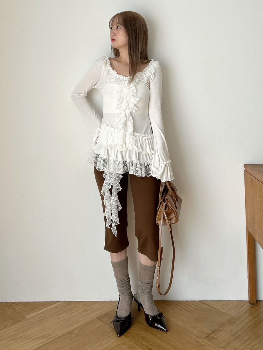 This tiered ruffled knit pullover is crafted from a soft, stretchy, lightweight knit fabric and features generous amounts of ruffled lace. The fitted silhouette minimizes bulk and creates a flattering silhouette. Ruffled lace running from the neckline down the front adds a touch of elegance and creates a delicate décolleté effect. Small buttons at the placket add an elegant touch. The tiered ruffles at the waist are also generously accented with lace, and the flowing ruffles at the hem add a trendy touch. Tiered ruffles at the cuffs add a touch of elegance to your movements. Pair this piece with casual denim or dressy pleated pants, adding a touch of elegance to a variety of bottoms.