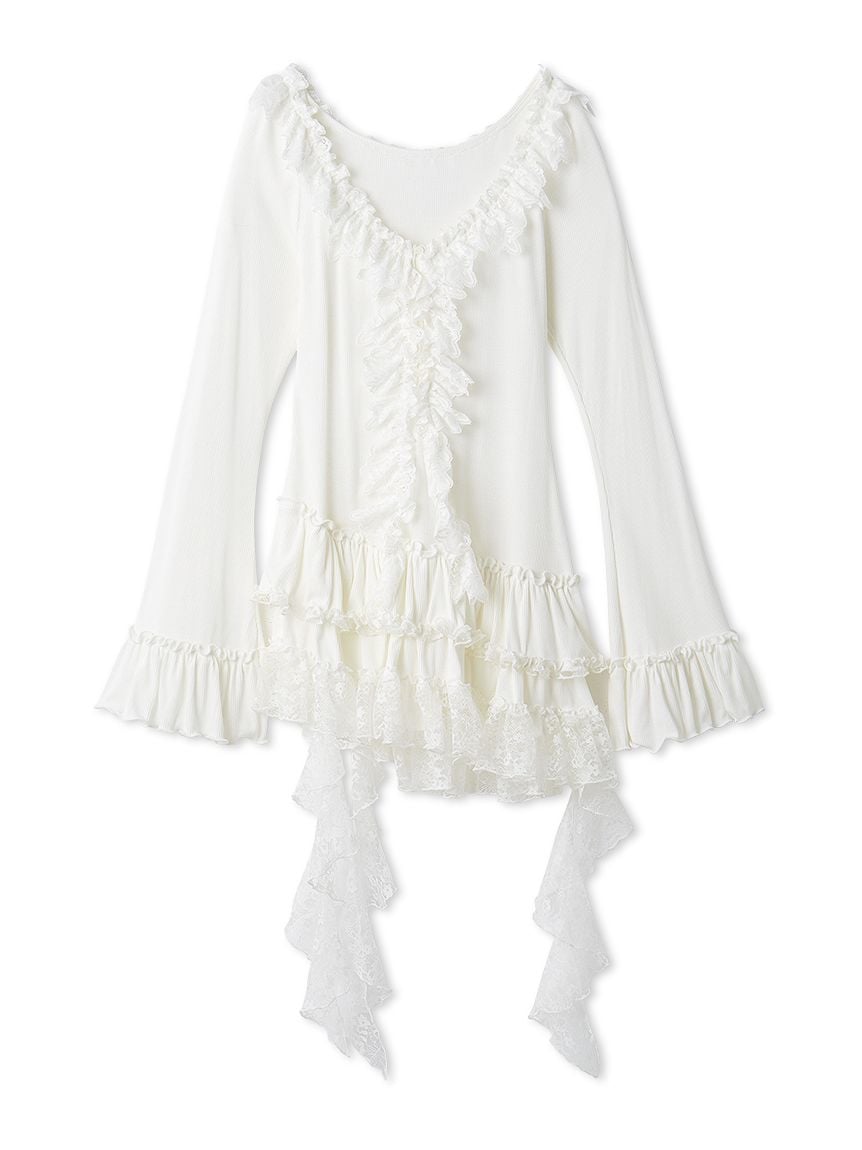 [A feminine and gorgeous pullover with generous ruffles made from a super-stretchy knit fabric]