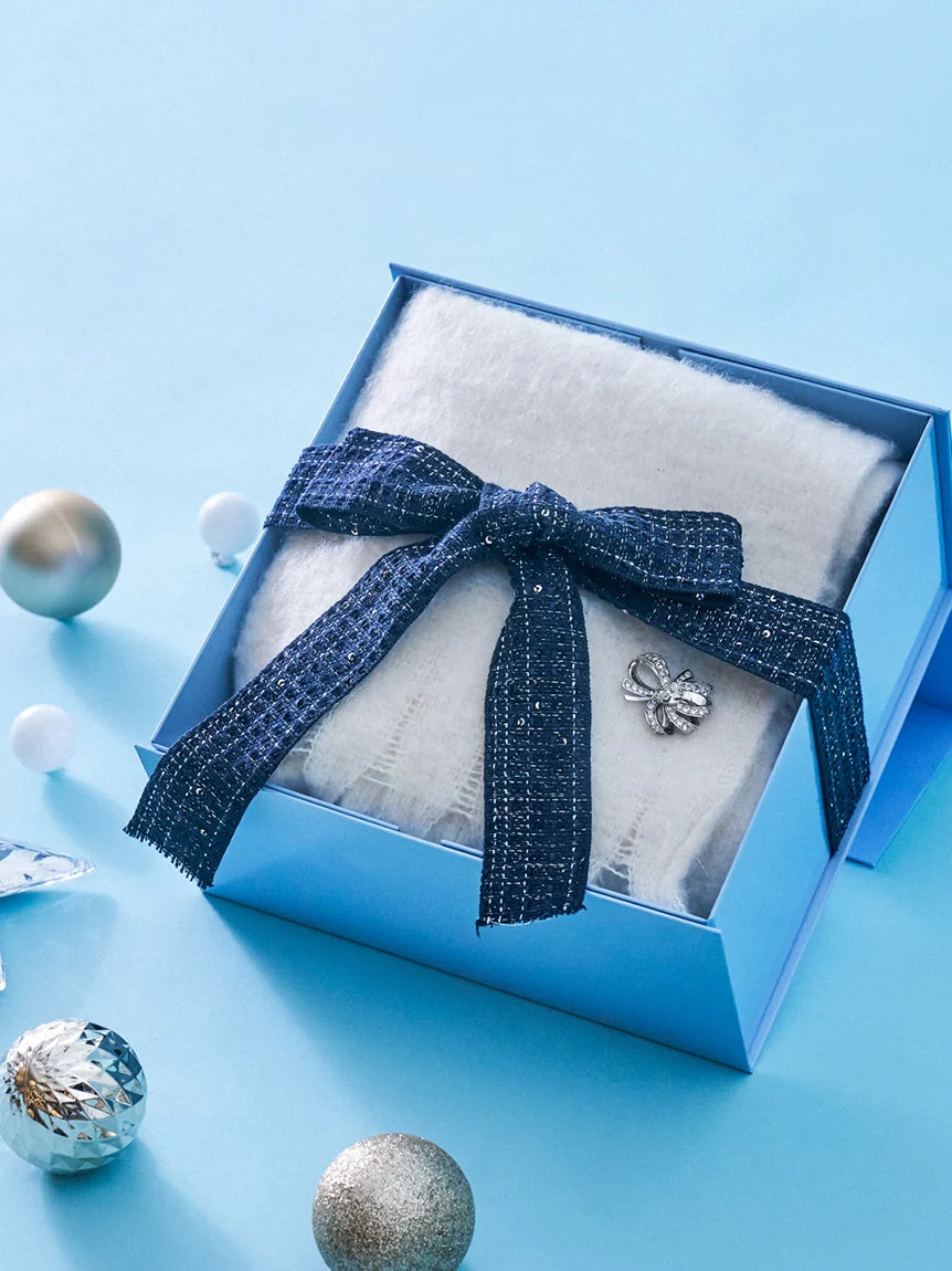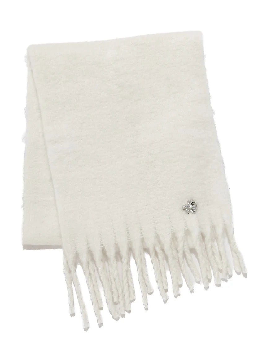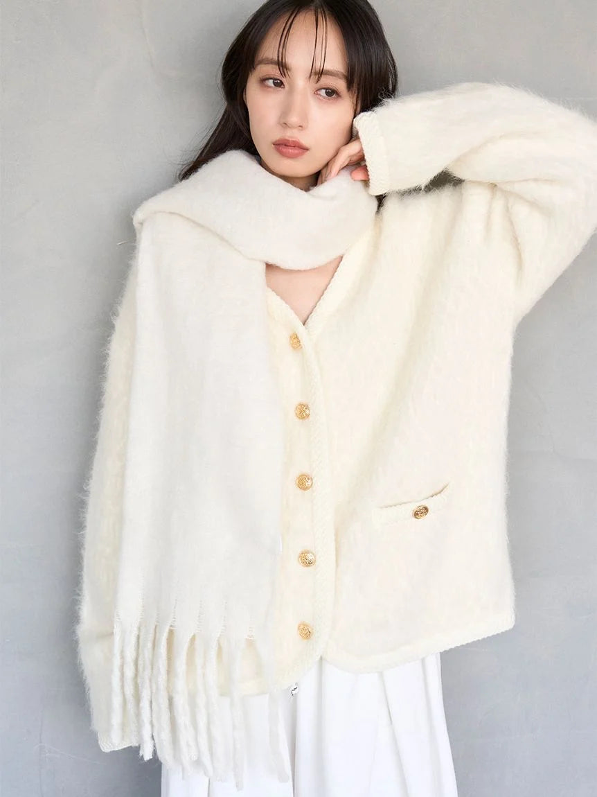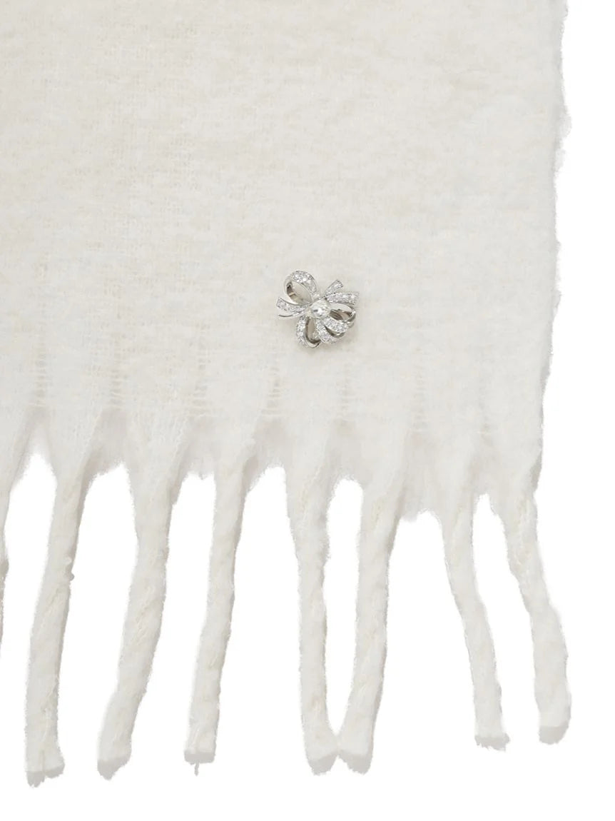This fluffy scarf with a luxurious brooch has arrived. This warm scarf features a soft, fluffy texture and a soft feel. The hem is finished with a voluminous fringe for a gorgeous look. It also comes with a removable jeweled ribbon brooch. This elegant brooch sparkles with a sparkling shine and can be used as an accent piece on coats, bags, and more. The scarf's size creates just the right amount of volume with a single wrap, allowing you to enjoy various styling options, such as draping it loosely over your shoulders. Available in three colors: a refreshing ivory, a soft beige with a sweet yet calming feel, and a smoky light blue for a sophisticated look.