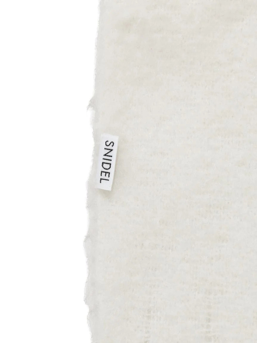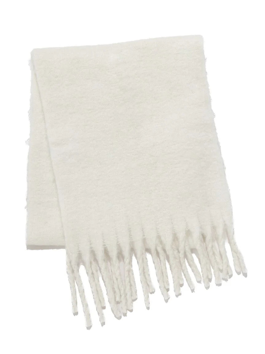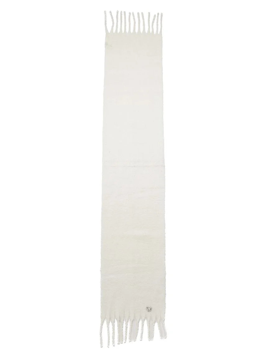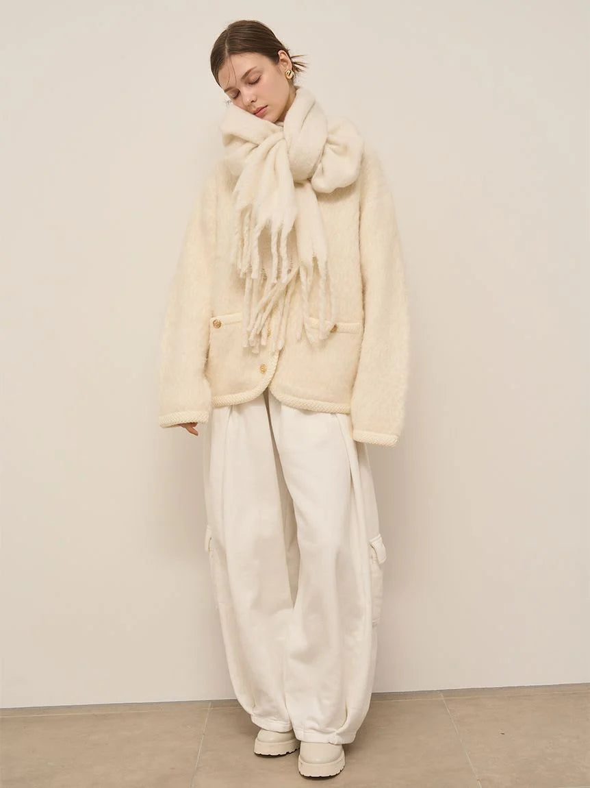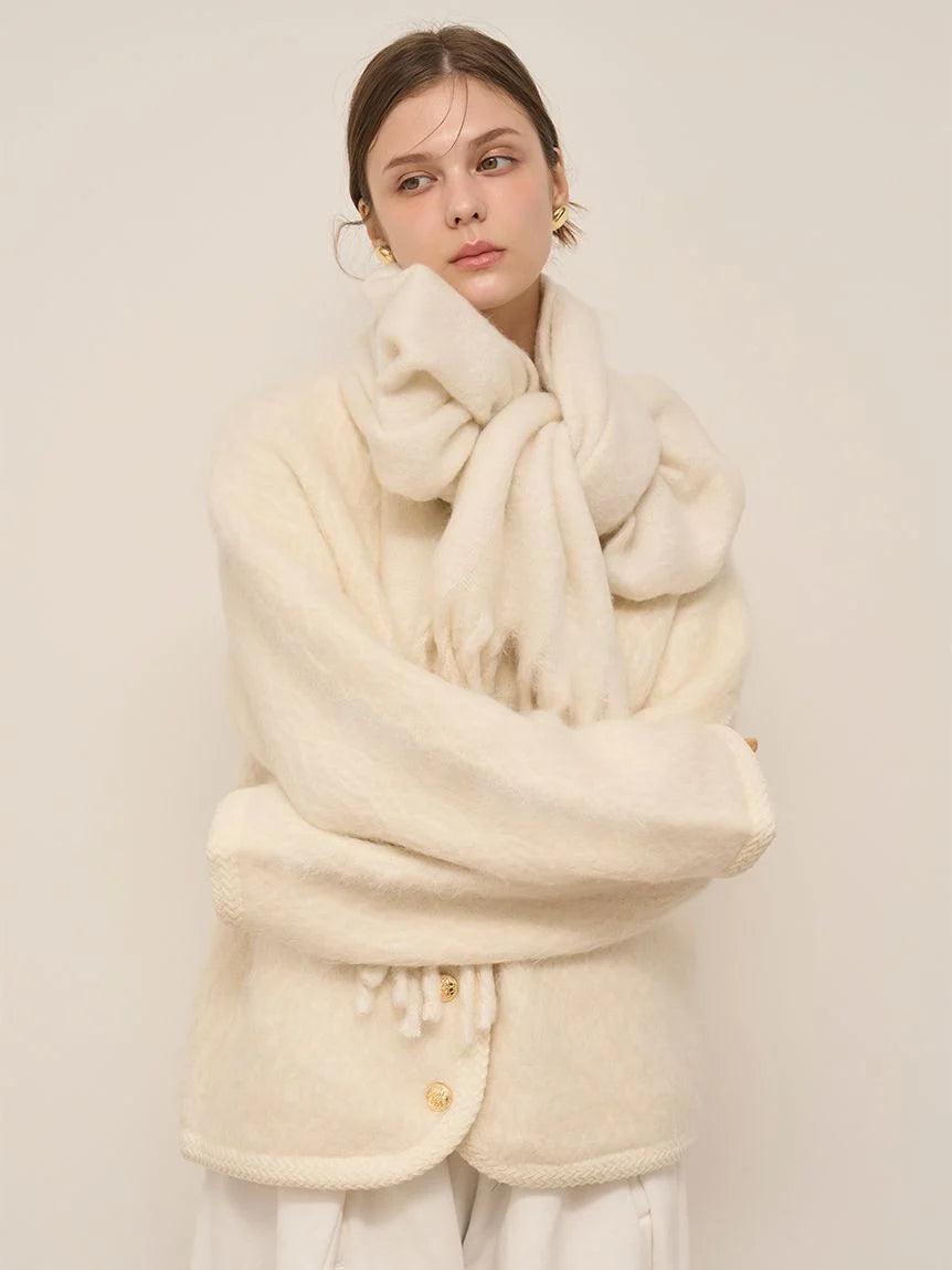 This fluffy scarf with a luxurious brooch has arrived. This warm scarf features a soft, fluffy texture and a soft feel. The hem is finished with a voluminous fringe for a gorgeous look. It also comes with a removable jeweled ribbon brooch. This elegant brooch sparkles with a sparkling shine and can be used as an accent piece on coats, bags, and more. The scarf's size creates just the right amount of volume with a single wrap, allowing you to enjoy various styling options, such as draping it loosely over your shoulders. Available in three colors: a refreshing ivory, a soft beige with a sweet yet calming feel, and a smoky light blue for a sophisticated look.