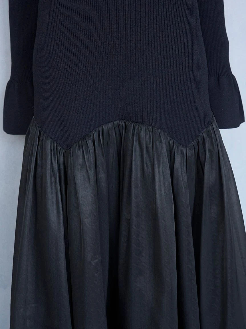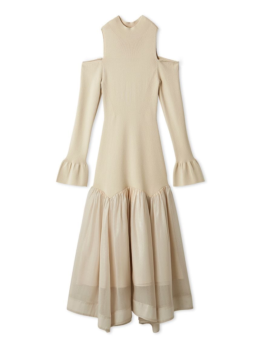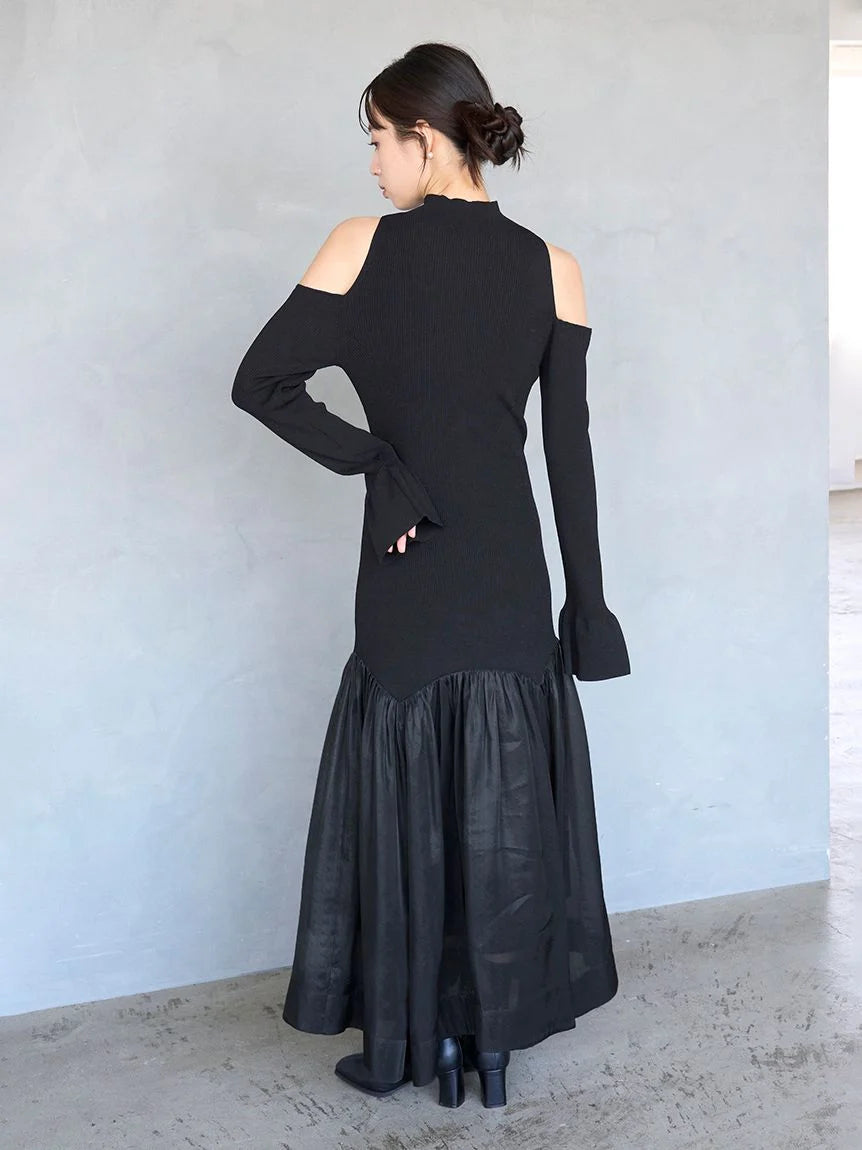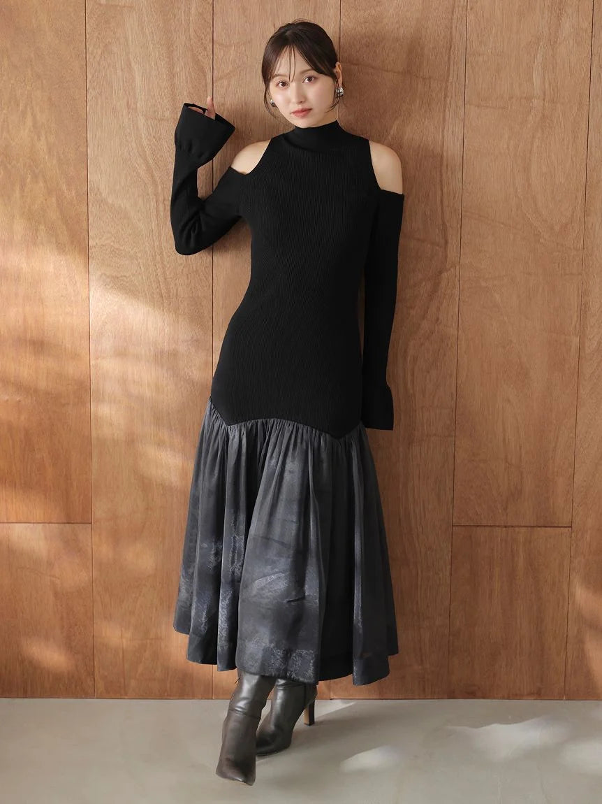 This elegant cold shoulder knit dress offers a sophisticated look. The straight mermaid silhouette with a just-right cut creates a flattering figure without showing too much of body-figure. The slightly high neckline and long hem minimize exposure, while the shoulder cutouts allow a right amount of skin exposure. The sleeves are fitted towards the cuffs for a feminine touch. The long bell sleeves that reach the fingertips create an adorable design. The generously amount of organdie material below the knee creates a fluffy, light, and trendy look, finishing the dress with style from top to bottom.