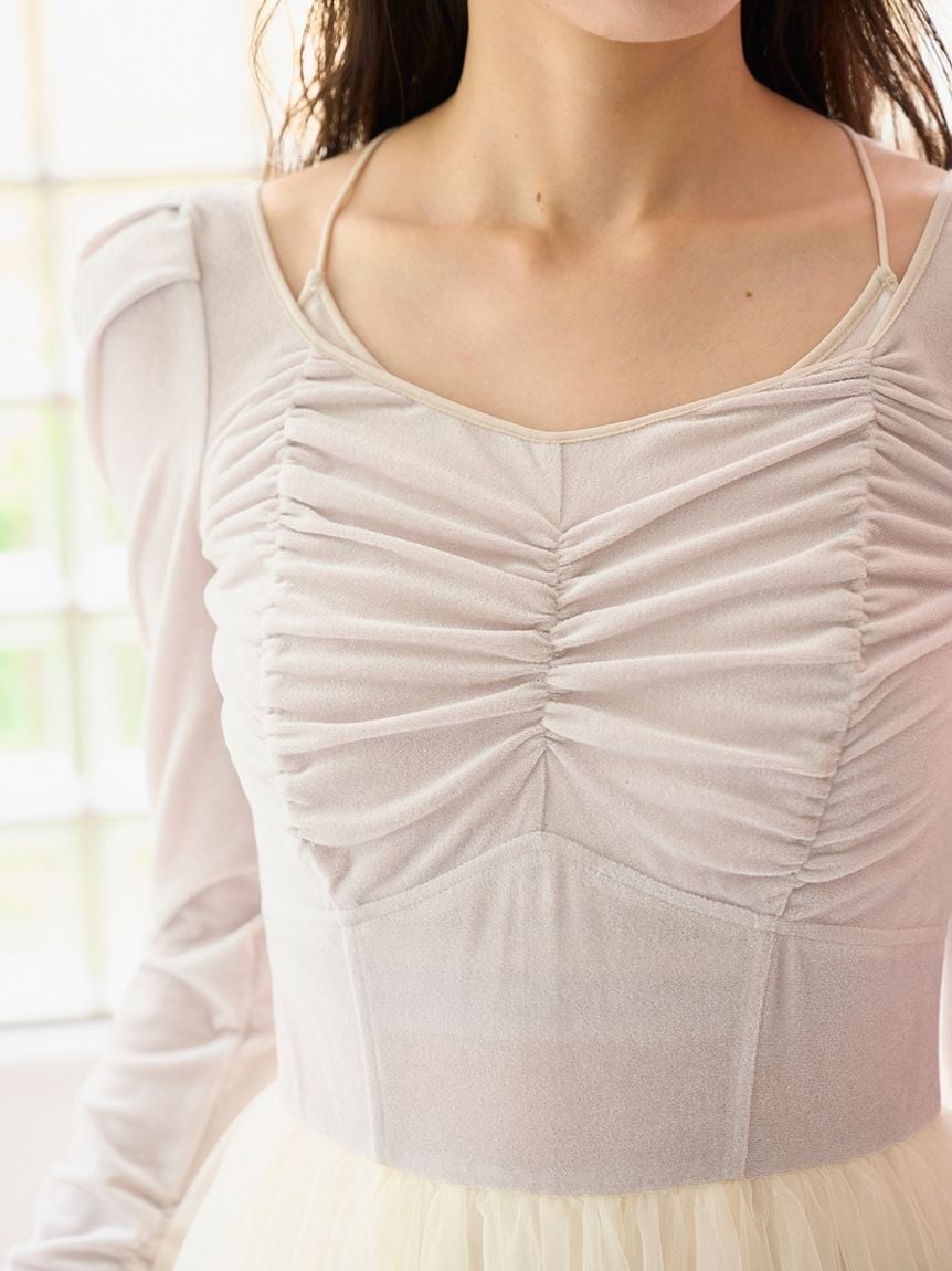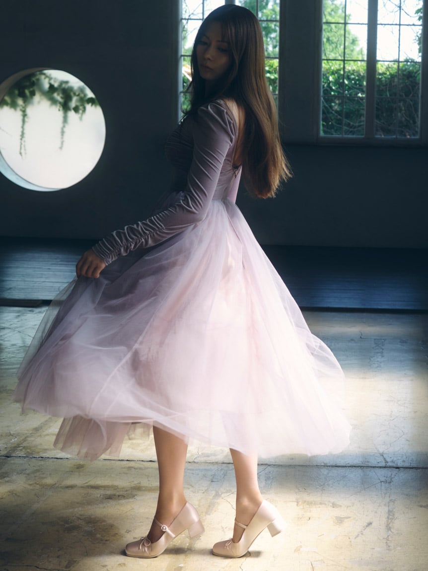 This is the second collaboration between Chacott, a brand that continues to lead the Japanese ballet industry. This long dress features a soft, lustrous velvet material docked against a fluffy tulle skirt, evoking a graceful and supple ballet vibe. The velvet top, with gathers at the chest and cuffs for a feminine finish, is fitted, yet made of a soft, stretchy fabric for exceptional comfort. The corset design at the waist and three layers of sheer tulle at the skirt create a soft, feminine look, creating a flattering figure. While the back is open like a leotard, it comes with an inner camisole in the same color and material as the top for added security. The cup-in design is convenient. The back of the camisole features elastic lace-up detailing for a ballet-enhancing vibe. The zipper at the back allows for easy on and off.