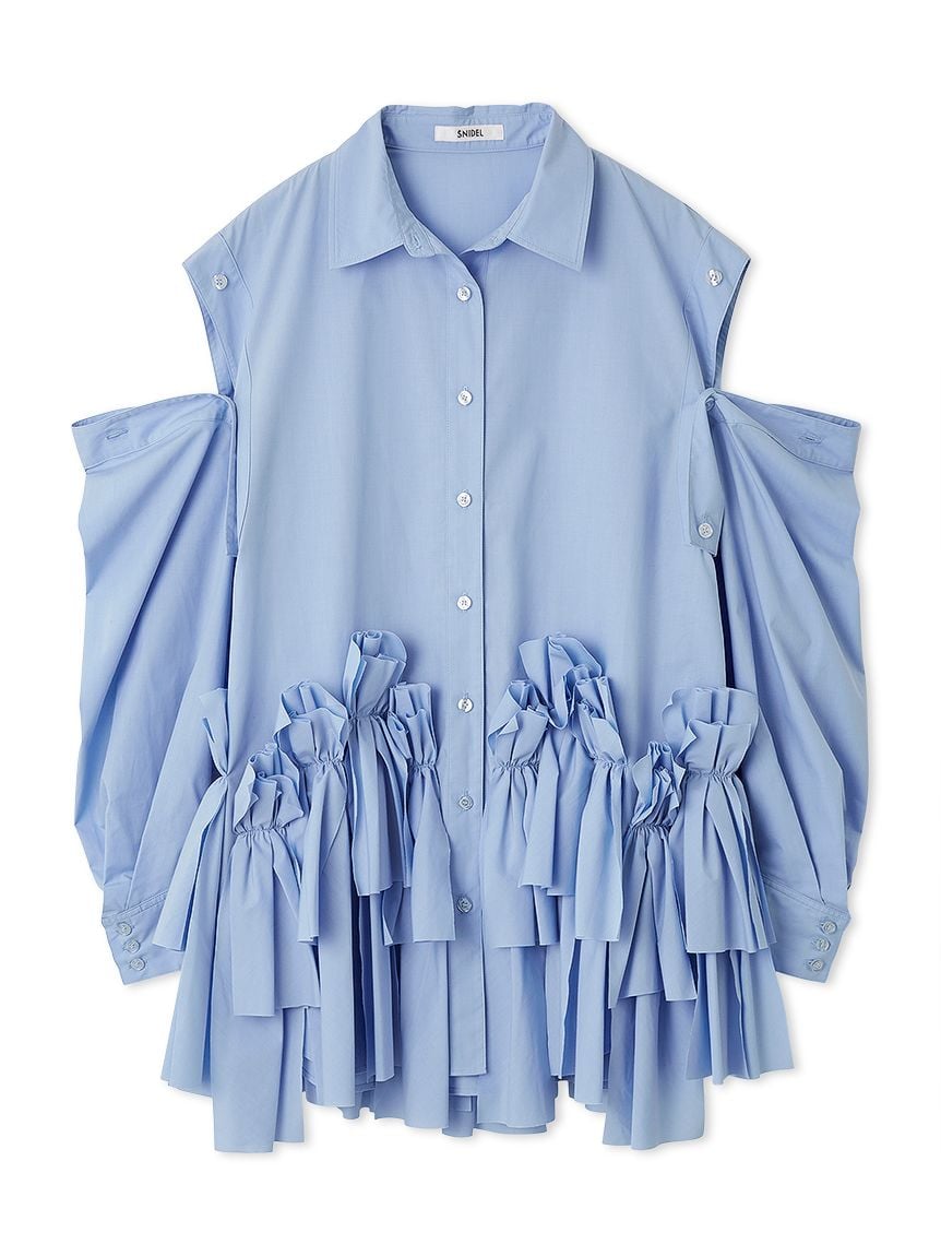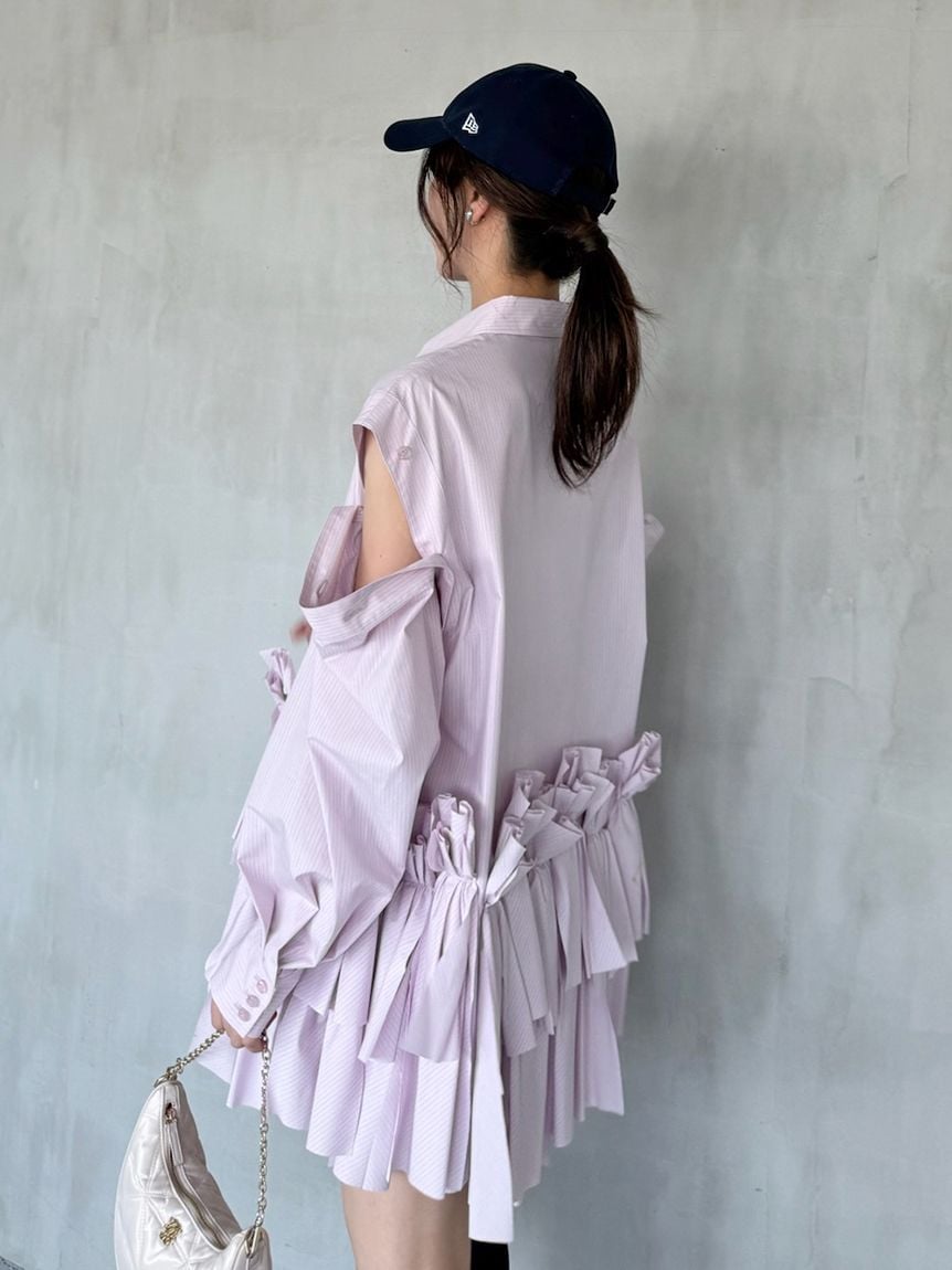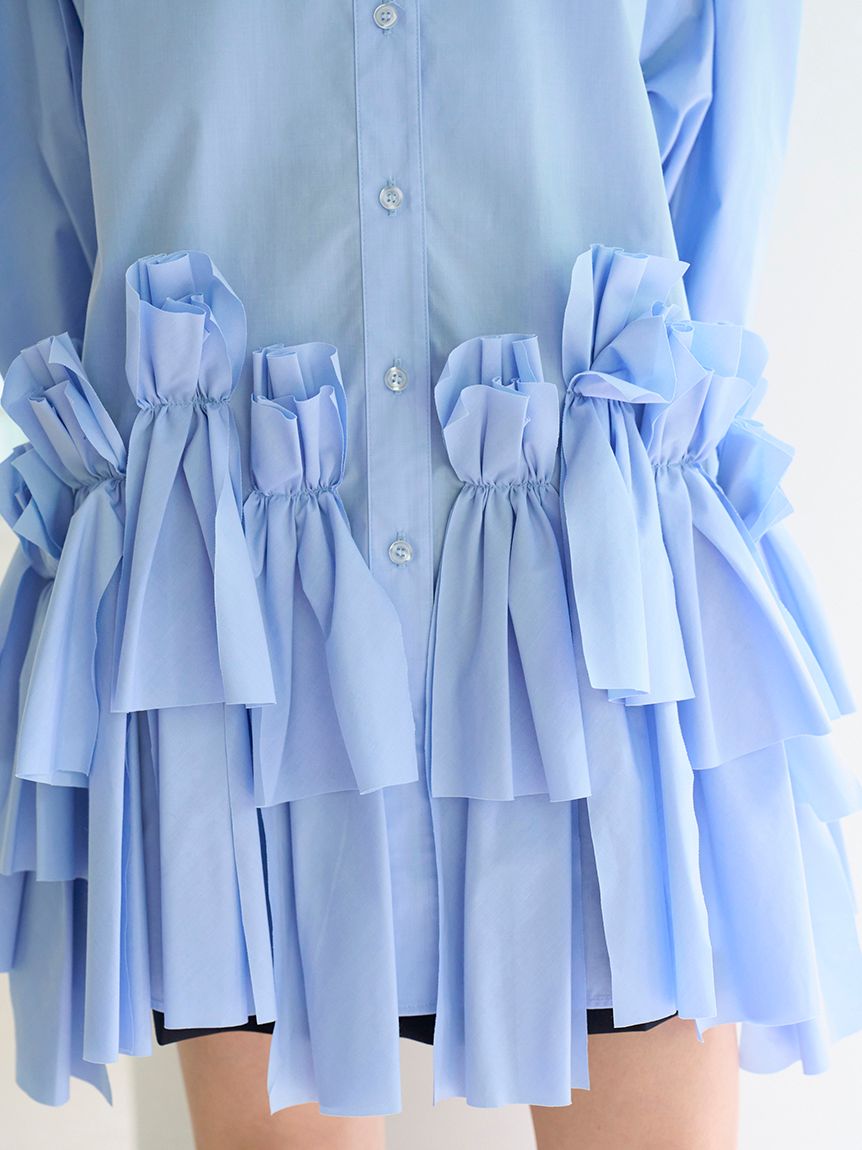 Introducing this trendy shirt mini dress, perfect for a statement look. The randomly cut shirt fabric ribbon design at the hem is a statement piece. The long sleeves are fastened to the body with buttons all around, allowing you to remove them and wear them as a sleeveless top, or open them slightly and drop the shoulders for a relaxed look that's perfect this season. This above-the-knee mini dress can be worn on its own with boots, or as a tunic with skinny pants or leggings. The voluminous ribbon design at the hem creates a slender look.