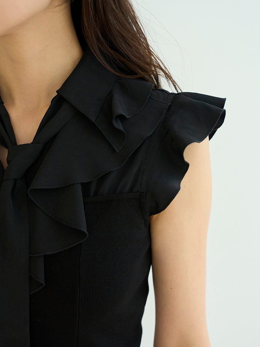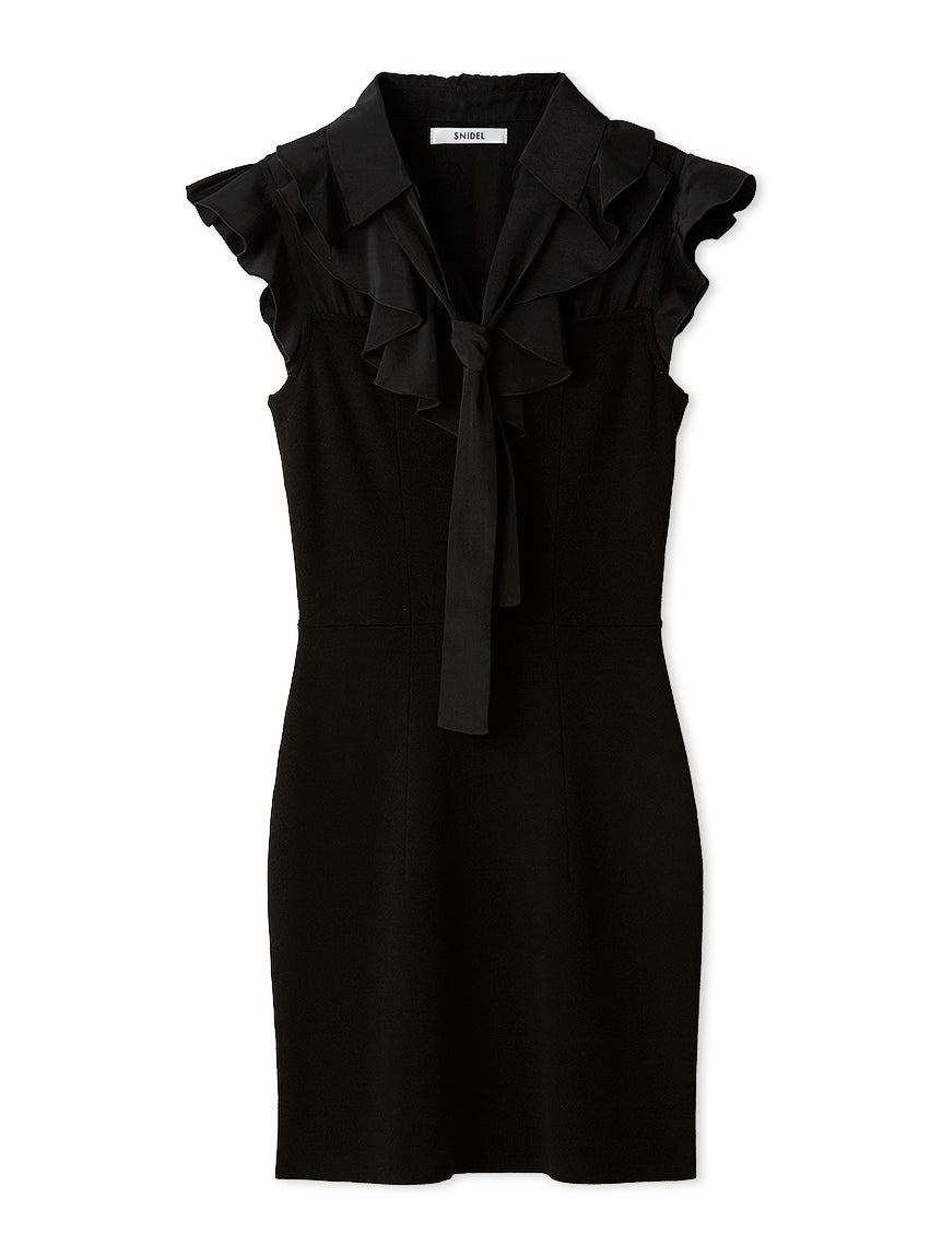[A mini-length knit dress with a ruffled bowtie that adds a touch of glamour to your look]
