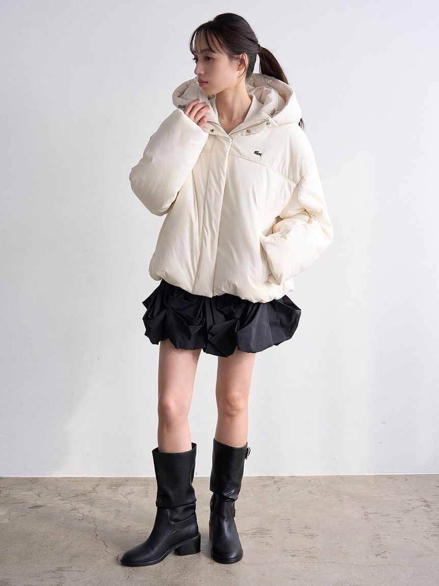 This collection combines the traditional style of LACOSTE, a premium French fashion sports brand founded in 1933, with the formal yet delicate designs of SNIDEL. This limited-edition padded blouson with hood, featuring Lacoste's crocodile logo and a sporty cut, is only available at Snidel. With thick yet light padding and snap buttons, this blouson keeps you warm even during the freezing winter. Pockets on both sides of the front is perfect for small items, or keeping your hand safe from the breeze. Hood and hem size are adjustable with a drawstring, so you can experiment the perfect length according to your mood or outfit of the day. Our recommended coordination includes a pair of sporty sweatpants or a cute mini skirt.