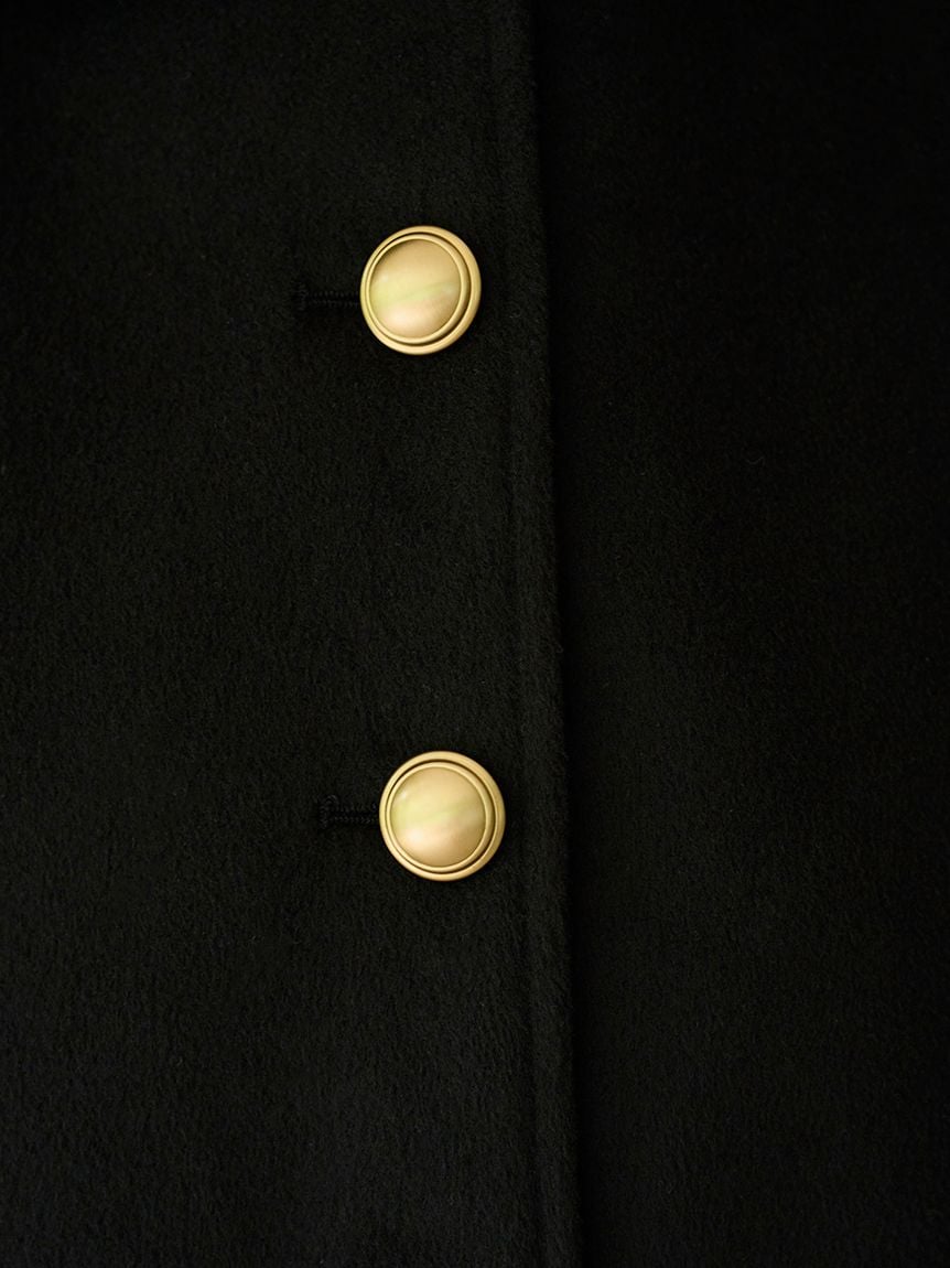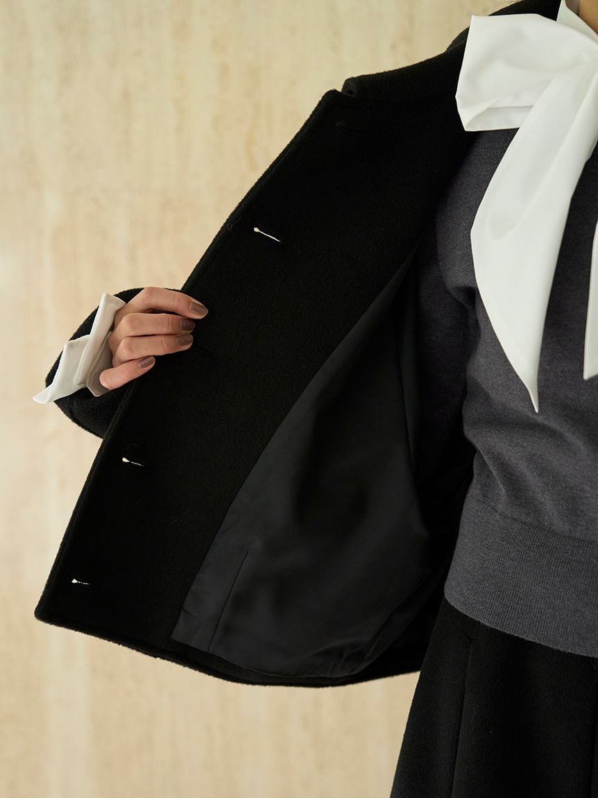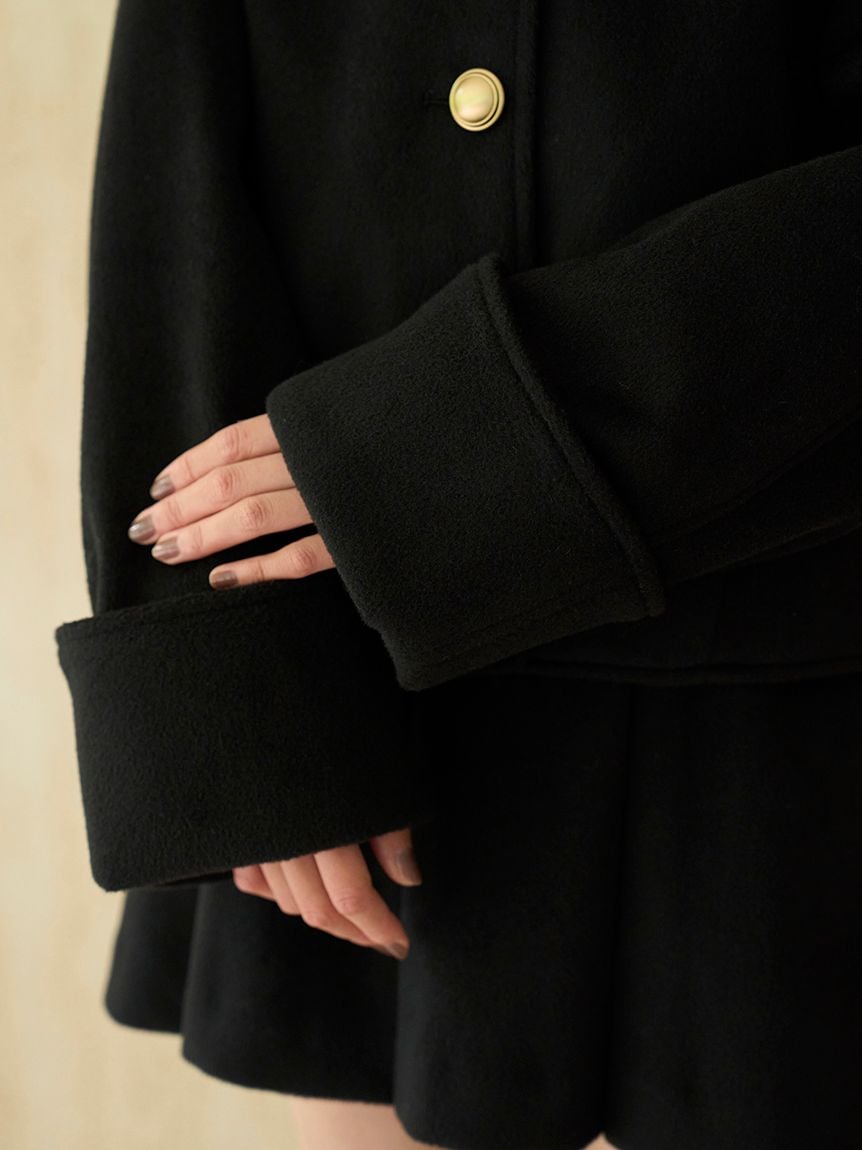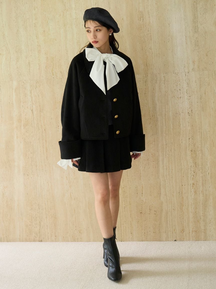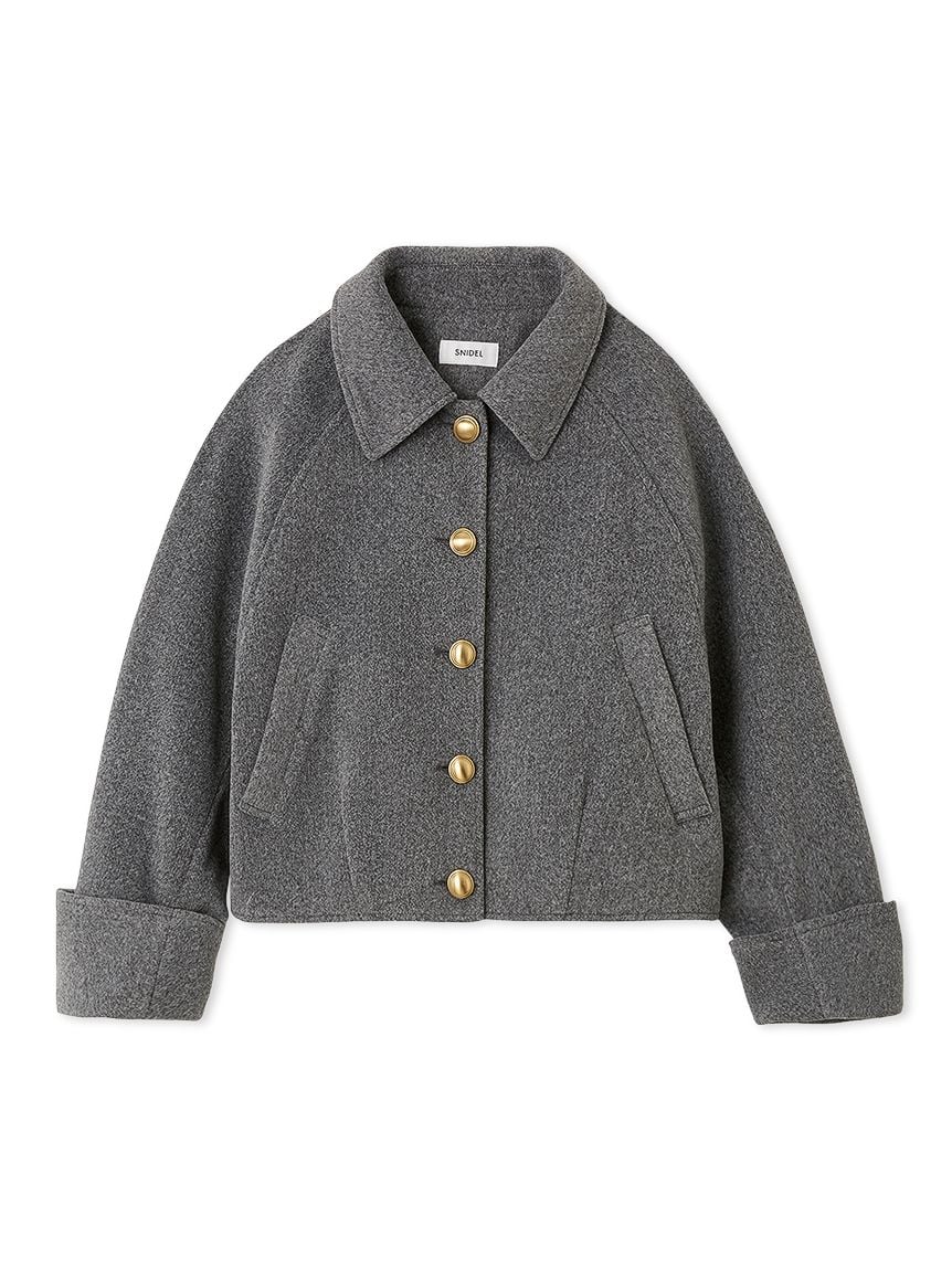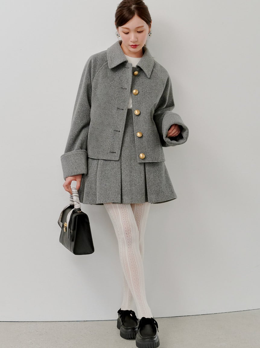 This trench coat features a relaxed, oversized silhouette, but the tucked hem creates a rounded, structured silhouette for a modern look. The waist-length jacket pairs easily with a variety of items, from skirts to pants, for a versatile look. The cuffed sleeves and gold buttons create a classic yet modern look. The fabric is fluffy and thick, but since it's not wool, it's easy to wear as a mid-layer layer and its lightweight feel is also appealing. It's made in the same color and material as the pleated mini skirt (SWFS254269), making it a perfect matching piece. It's lined. It has pockets on both sides.