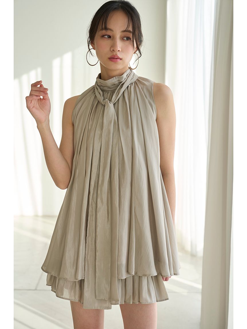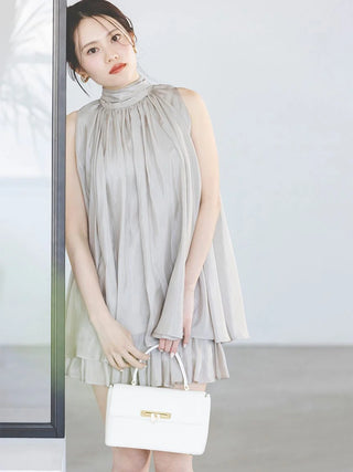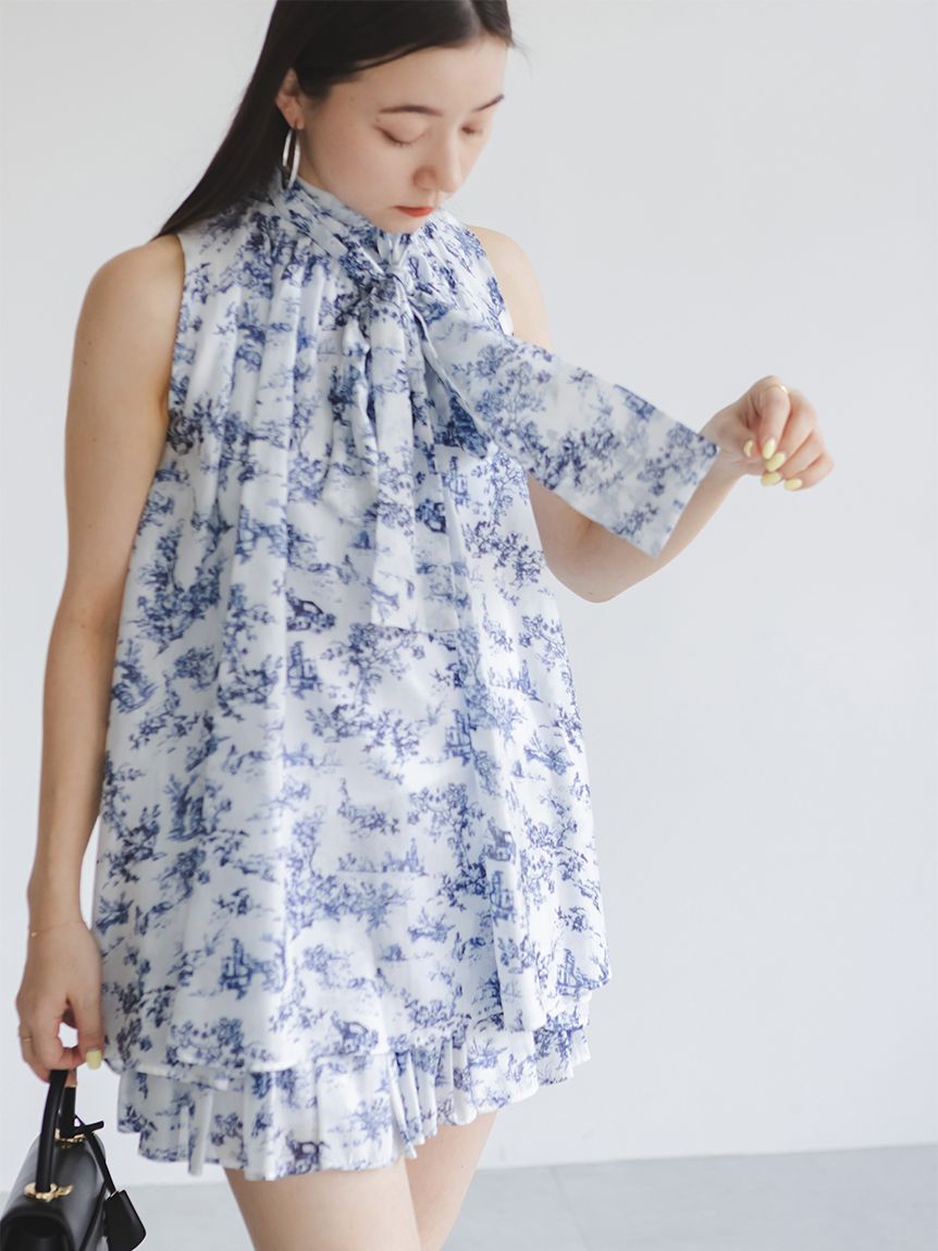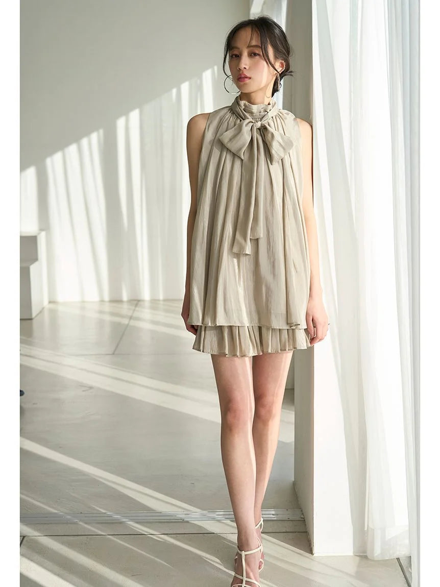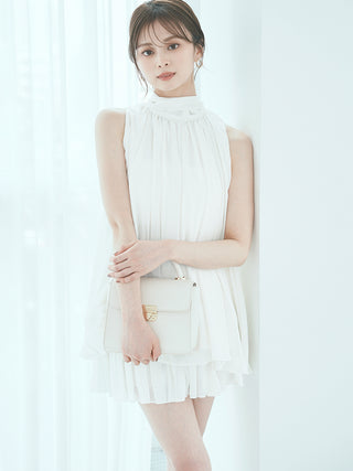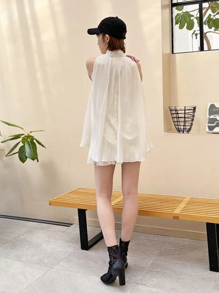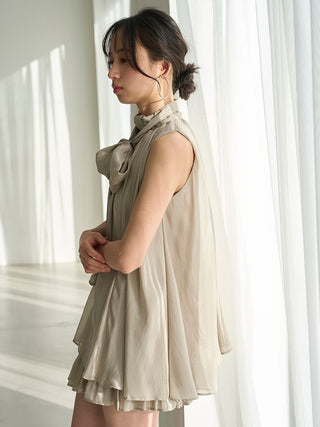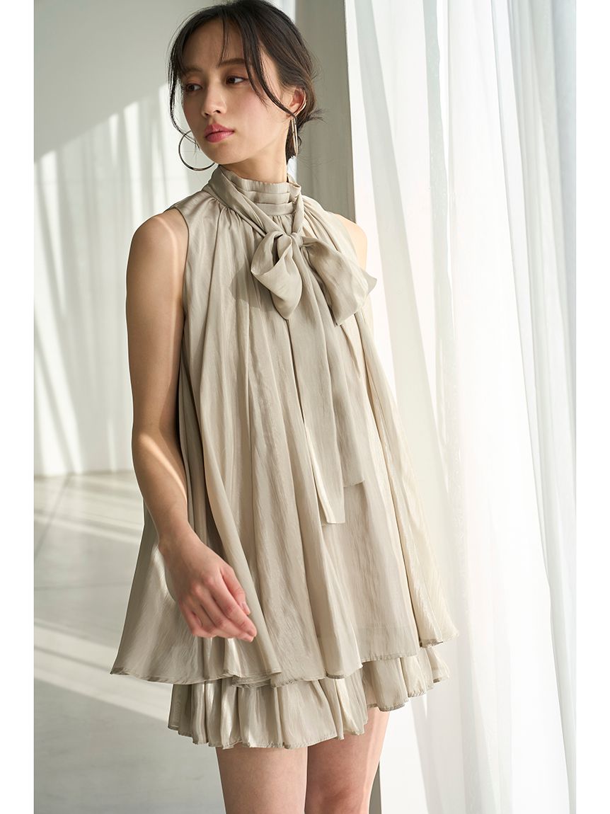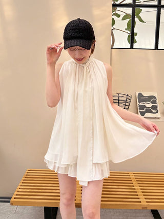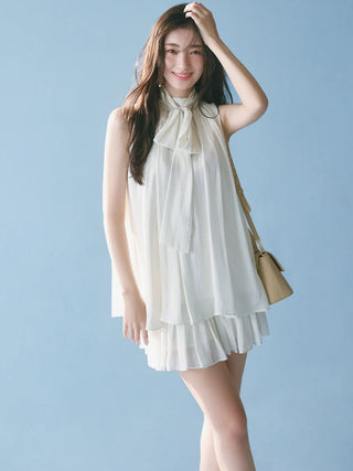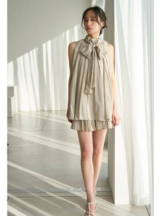 The American-style gathered blouse set is a set item of a soft and elegant tunic-length American-style blouse made of a light and glossy fabric and a mini skirt and shorts made of the same fabric. The American-style design of the blouse makes the shoulders look beautiful, and the fabric with plenty of gathers creates an elegant silhouette. The fluffy bowtie ribbon at the neckline is an accent. It can also be removed and attached around the waist. The skirt and shorts have a clean waist and a ruffled hem for an elegant impression. Since it is a skirt and shorts, you can wear it with confidence. By wearing the top and bottom as a set, you can complete a coordination like a dress. It is a versatile set that can be used in a variety of ways by using each item alone.