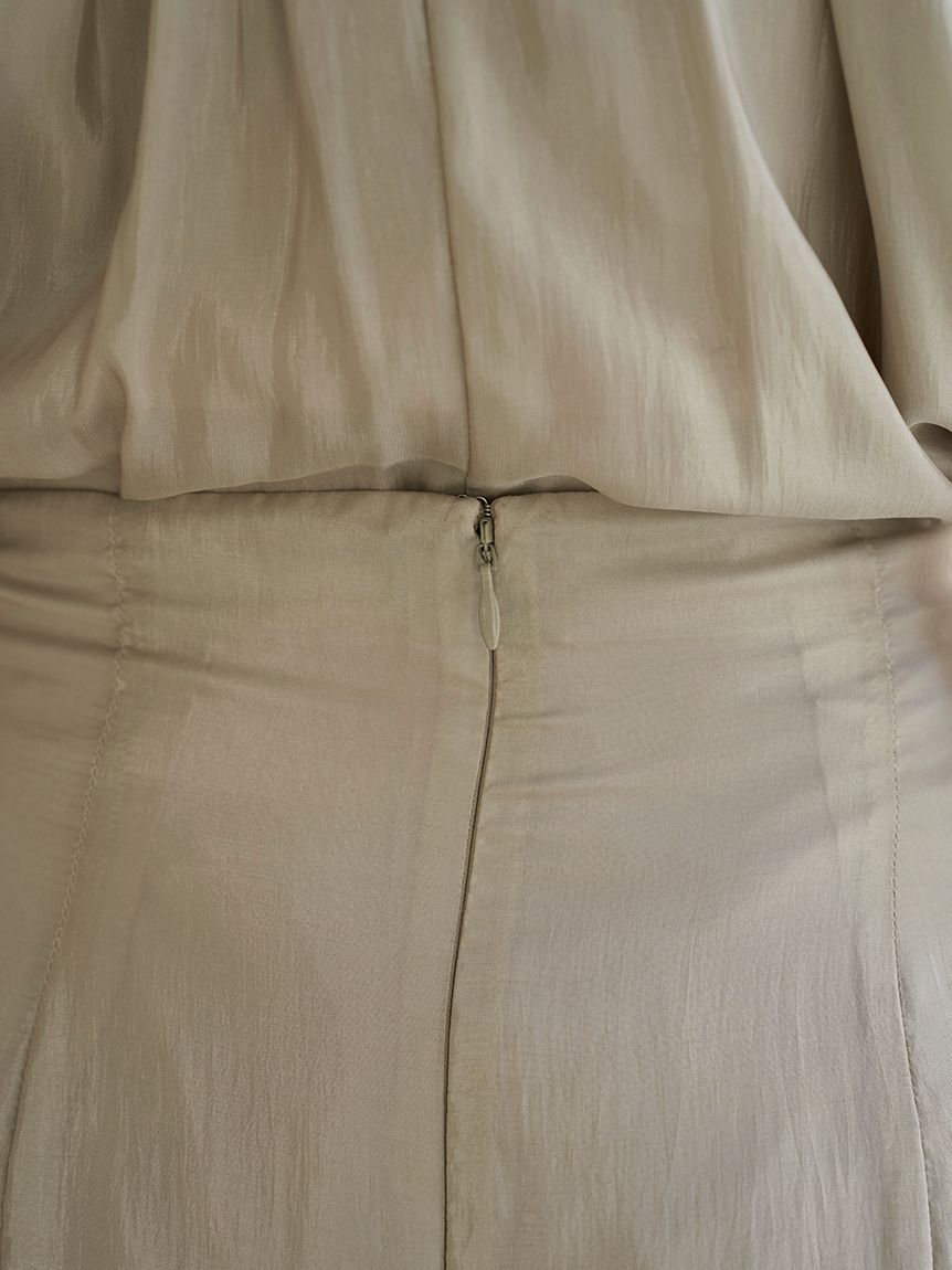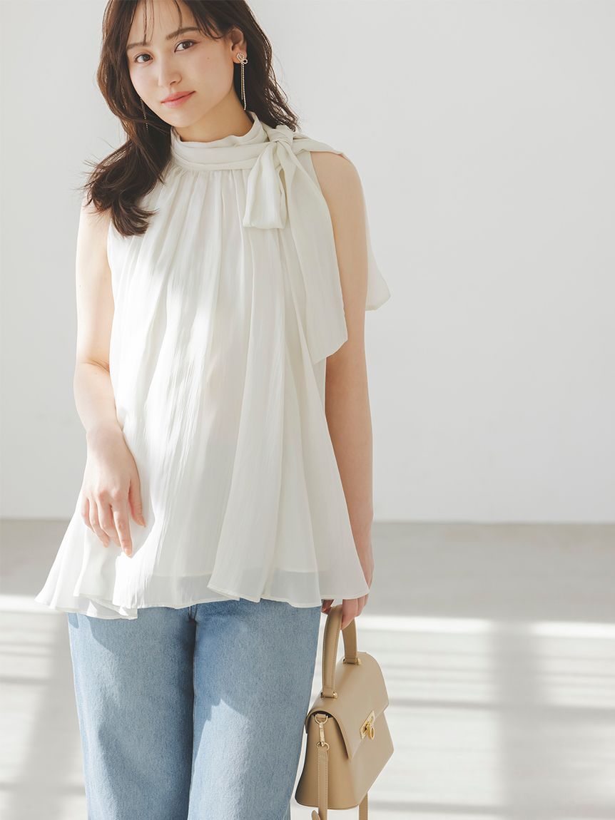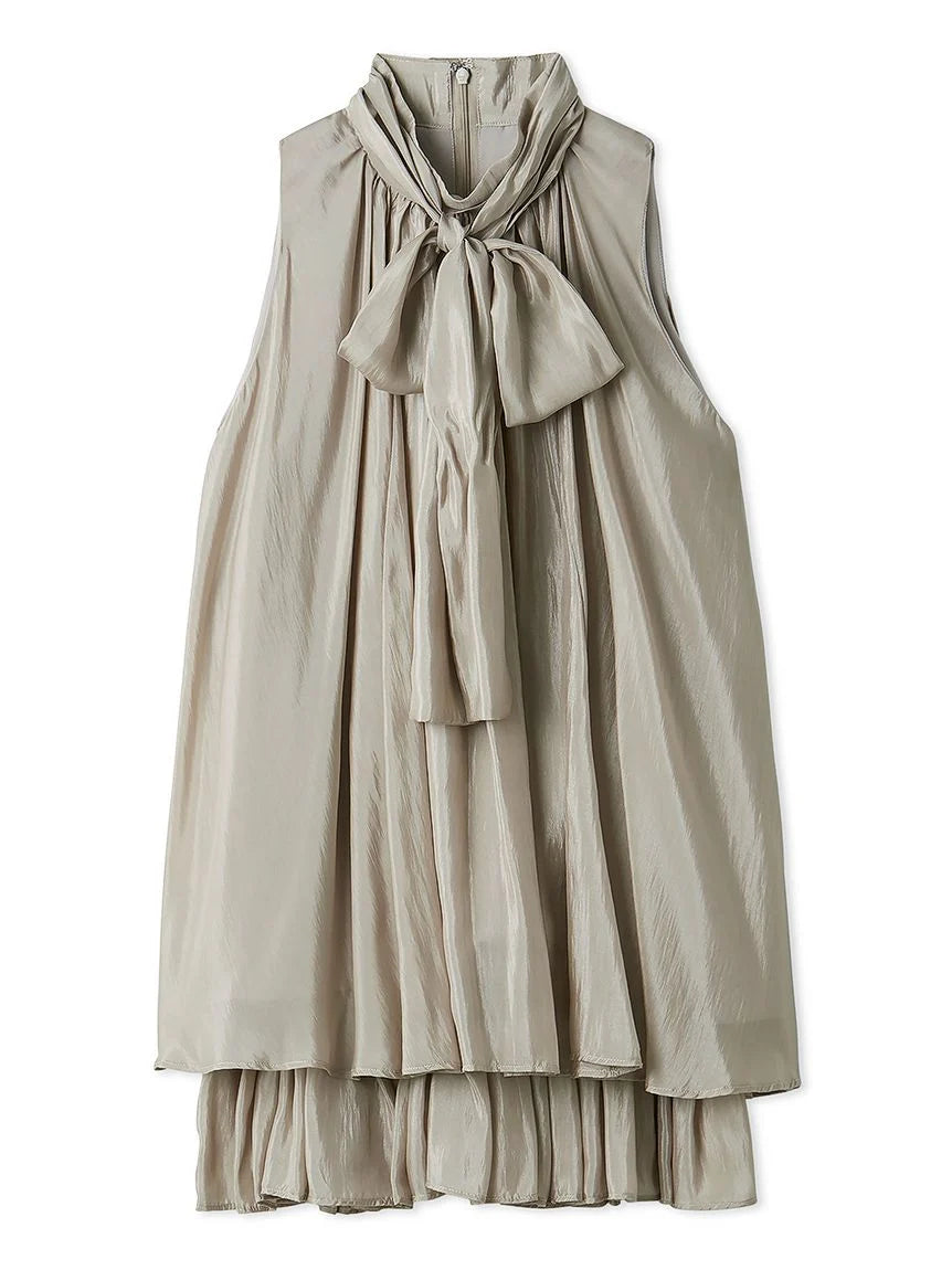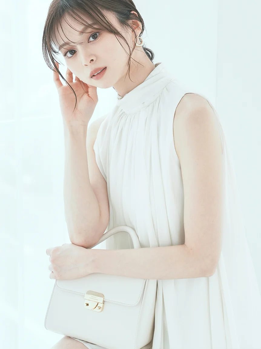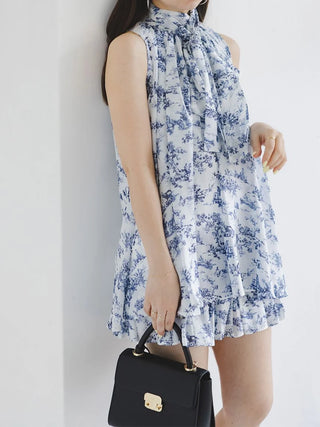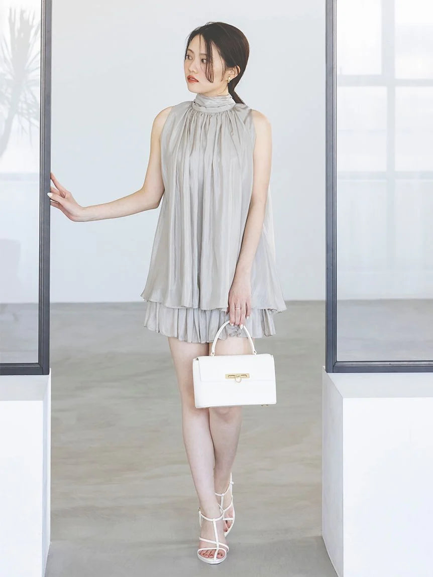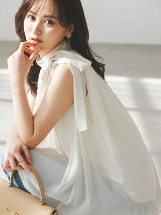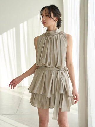 The American-style gathered blouse set is a set item of a soft and elegant tunic-length American-style blouse made of a light and glossy fabric and a mini skirt and shorts made of the same fabric. The American-style design of the blouse makes the shoulders look beautiful, and the fabric with plenty of gathers creates an elegant silhouette. The fluffy bowtie ribbon at the neckline is an accent. It can also be removed and attached around the waist. The skirt and shorts have a clean waist and a ruffled hem for an elegant impression. Since it is a skirt and shorts, you can wear it with confidence. By wearing the top and bottom as a set, you can complete a coordination like a dress. It is a versatile set that can be used in a variety of ways by using each item alone.