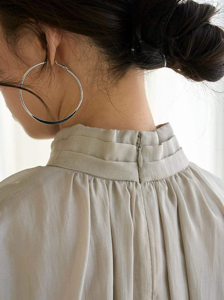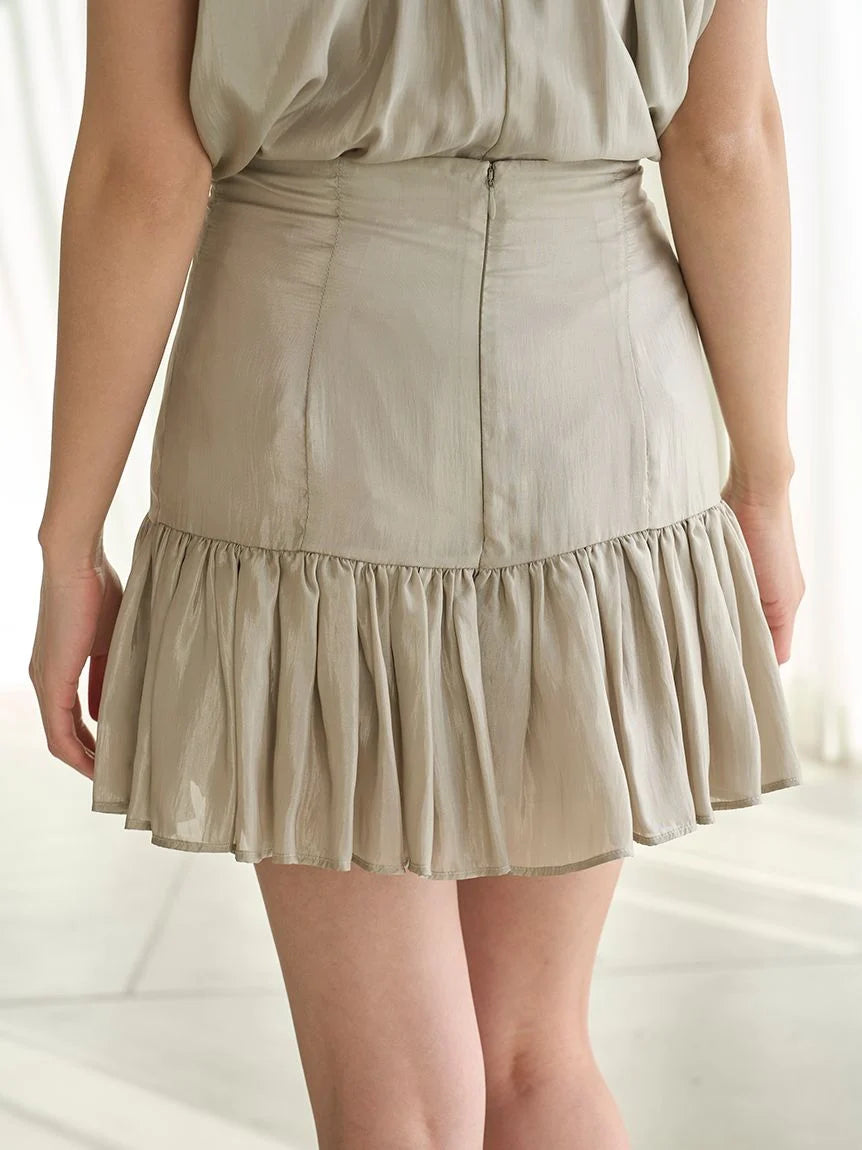[A mature and feminine American-style gathered blouse with a skirt and shorts set]
