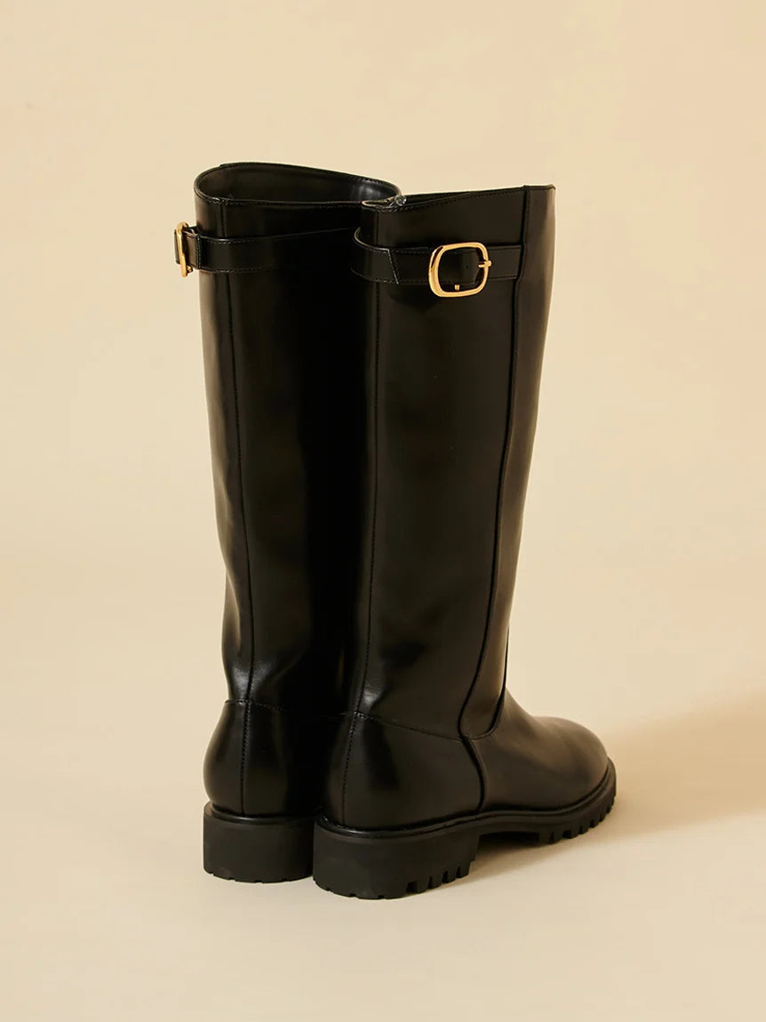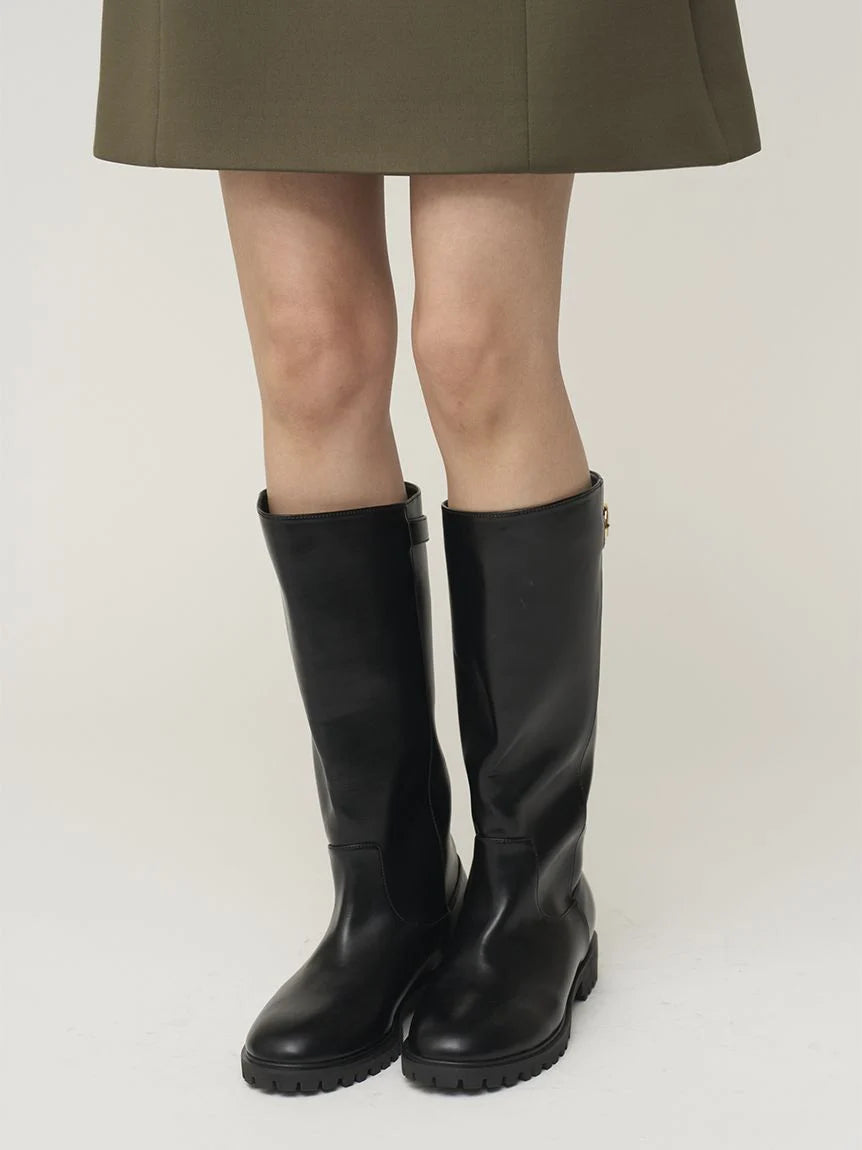 These casual jockey boots feature elegant pull straps with gold hardware. The knee-length shaft provides a comfortable fit and a sleek, balanced silhouette. The soft insole and rubber sole make these boots comfortable to walk in. Crafted from soft, lustrous faux leather, they are available in two colors: black and brown.