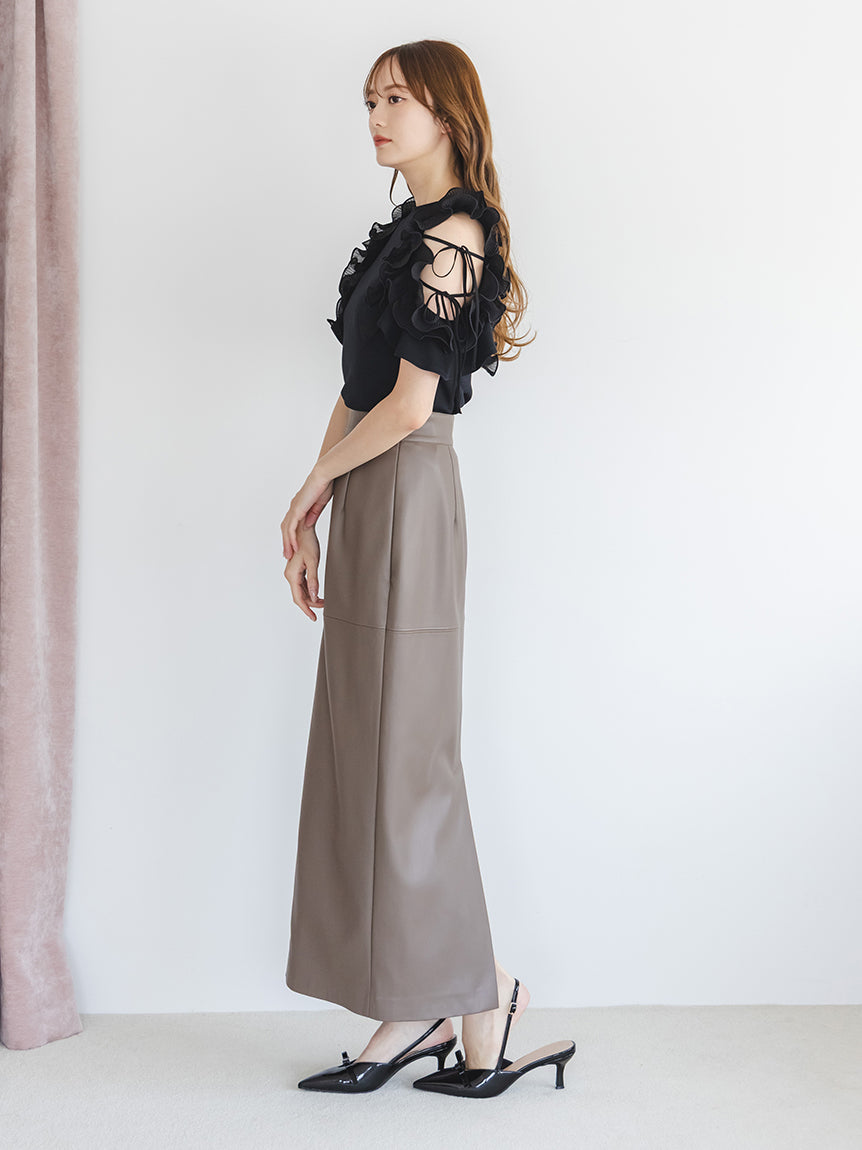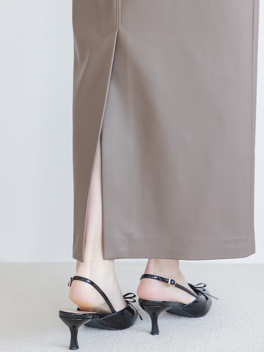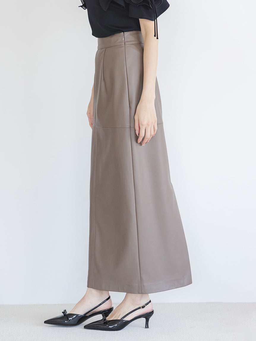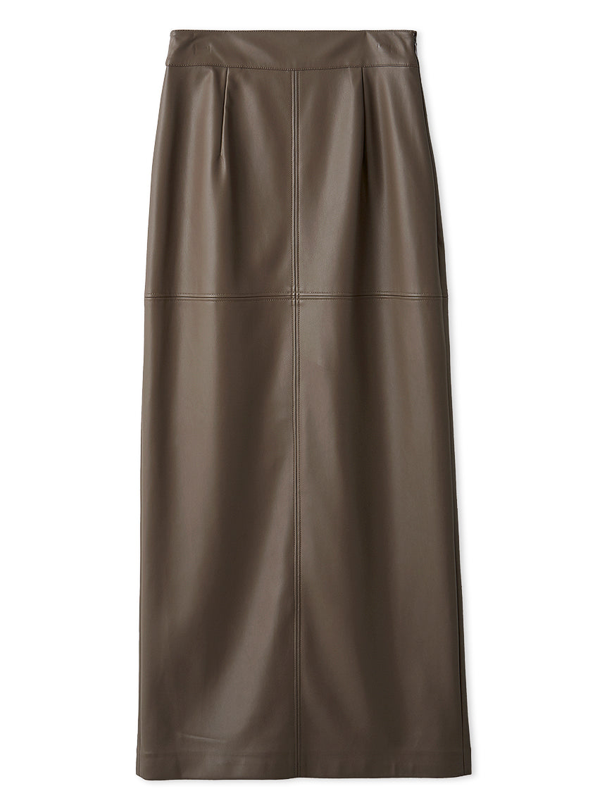 This tight skirt is crafted from soft, stretchy synthetic leather for a gentle fit. Its simple silhouette is accented with subtle vertical and horizontal stitching. Despite its tight silhouette, the leather-like texture provides just enough coverage for a comfortable fit. The slightly high waistline creates a flattering, leg-lengthening effect. A deep slit in the back creates a relaxed feel and allows for easy movement. This versatile skirt can be worn with a dressy blouse or casual T-shirt, making it suitable for both office and casual wear. It's lined and features a side zipper for easy on and off.
