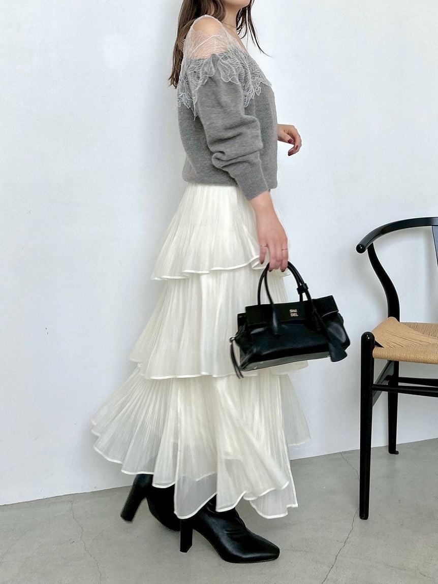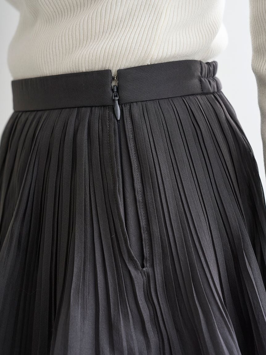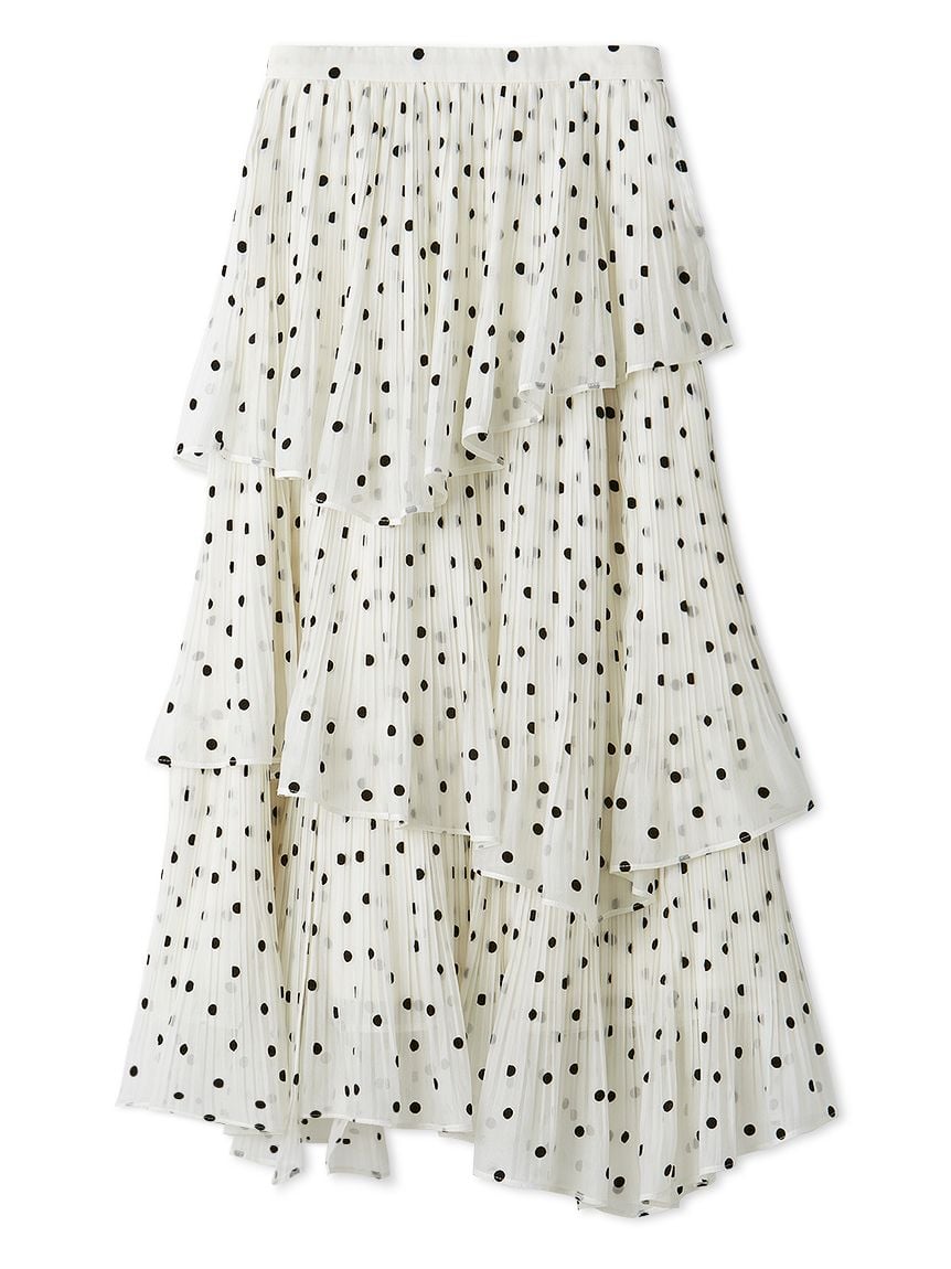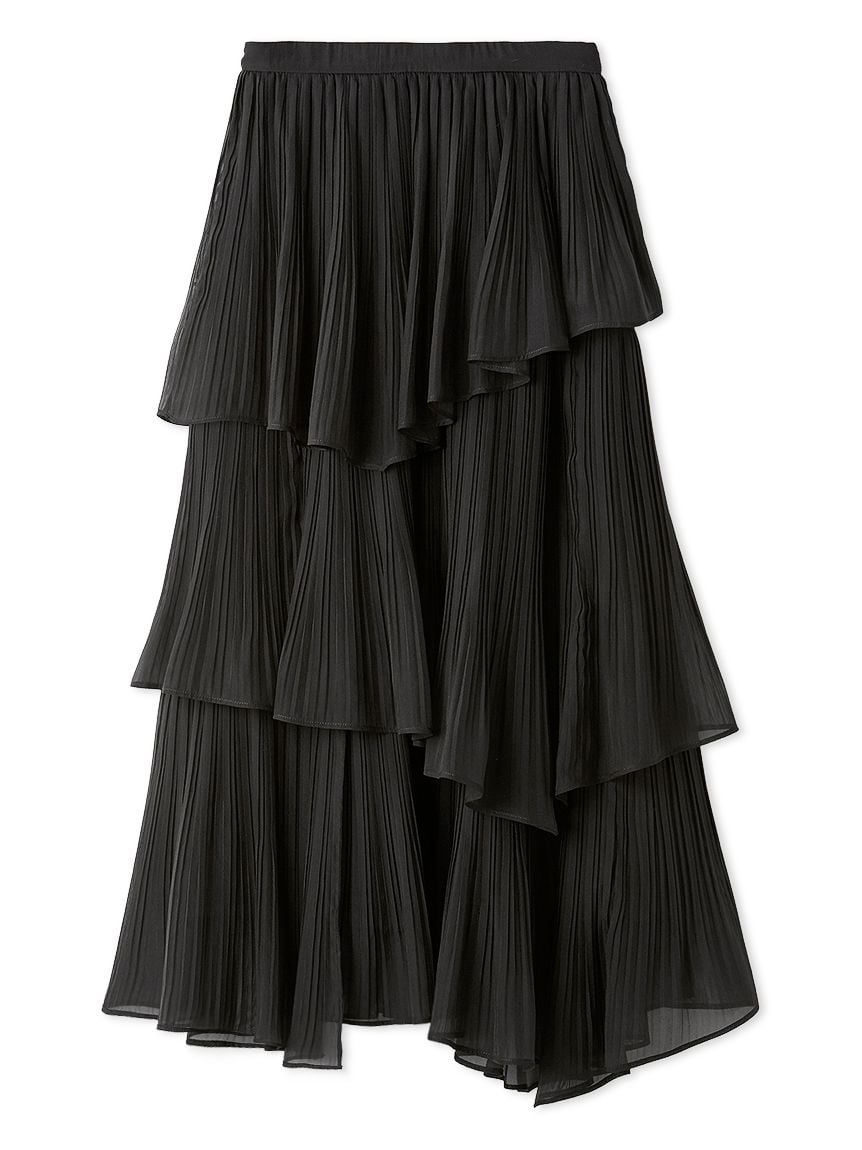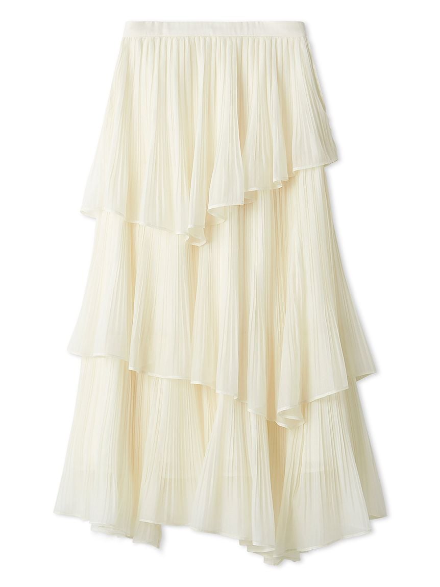 This elegant three-layered skirt is crafted from a lightweight fabric with a subtle sheerness and gentle sheen, finished with fine pleating for a graceful, airy look. The hem features “crushed pleats,” adding movement that creates a soft, fluttering effect as you walk. Each layer is carefully designed with intentional volume and seam placement to create a beautifully flattering silhouette. The back of the waistband is elasticated for added comfort, and a side zipper allows easy dressing.