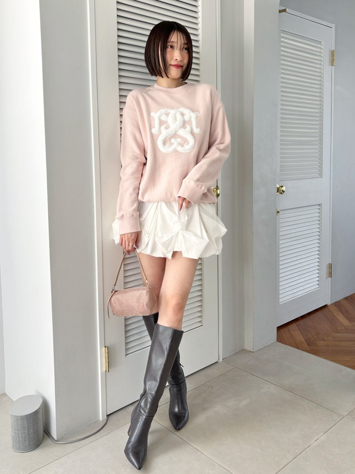 The emblem is crafted from fur and boa, creating texture and a unique mix of materials. Available in four colors: soft and gentle Ivory, versatile Light Gray, sweet Light Pink, and sophisticated Navy.