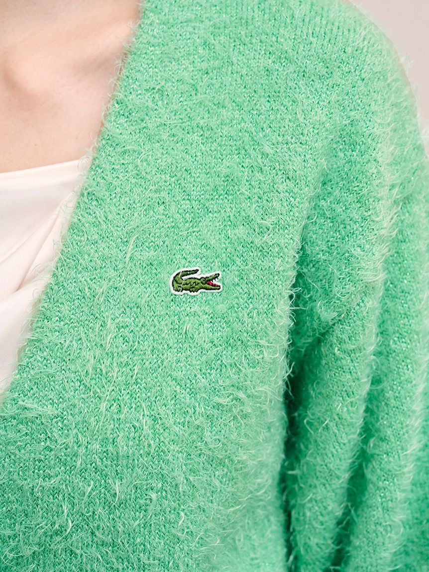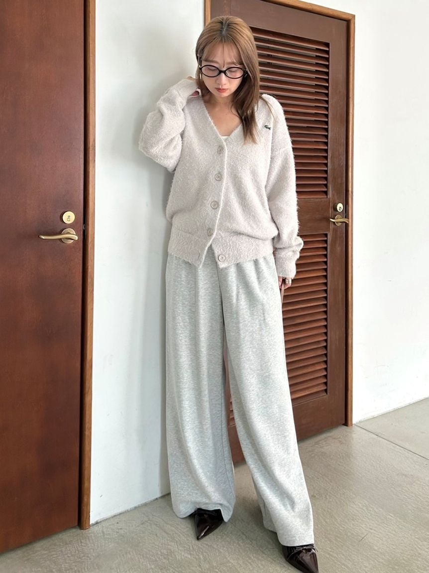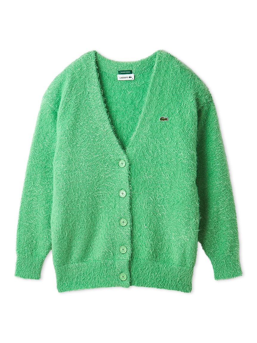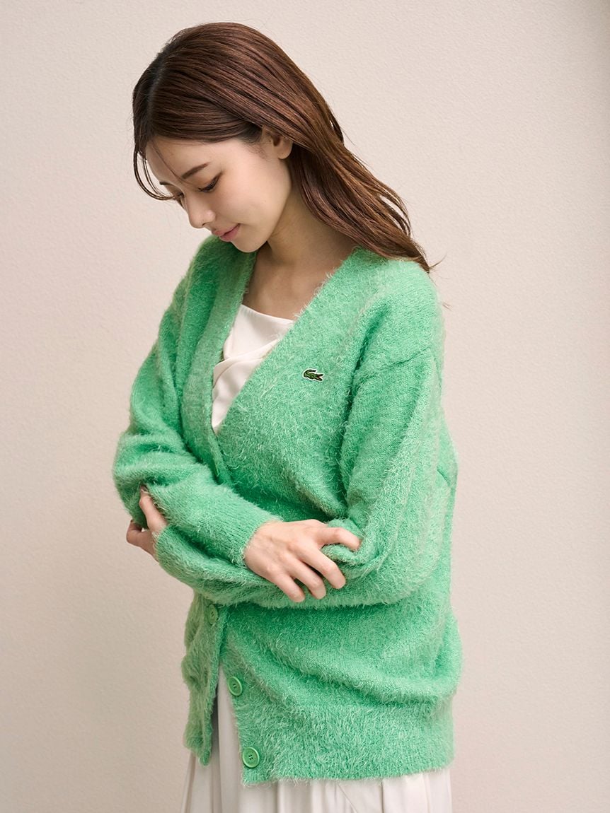 This lineup combines the traditional style of LACOSTE, a premium French fashion sports brand founded in 1933, with the formal yet delicate designs of SNIDEL. This limited-edition knit cardigan with a loose silhouette, fluffy knit fabric with a feather-like brushed texture, and SNIDEL's signature soft colors is exclusively available here. The wide V-neck creates a relaxed feel and beautifully accentuates the décolleté line. Sparkling lamé thread is woven into the knit fabric, adding a subtle touch of glamour that is characteristic of SNIDEL. The buttons are the same color as the knit, creating a clean look. The iconic LACOSTE crocodile logo on the chest adds a touch of luxury. The relaxed fit makes this a versatile piece that can also be worn as a light jacket when the weather gets a little chilly.