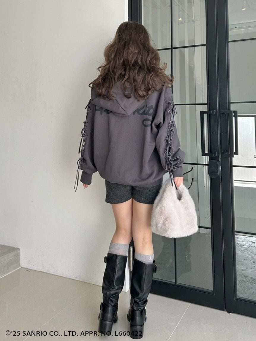 A signature SNIDEL hoodie with a feminine touch. It features velour ribbon lace-up details on the sleeves. The hood’s drawstrings are also accented with long velour ribbons, adding a ladylike impression.