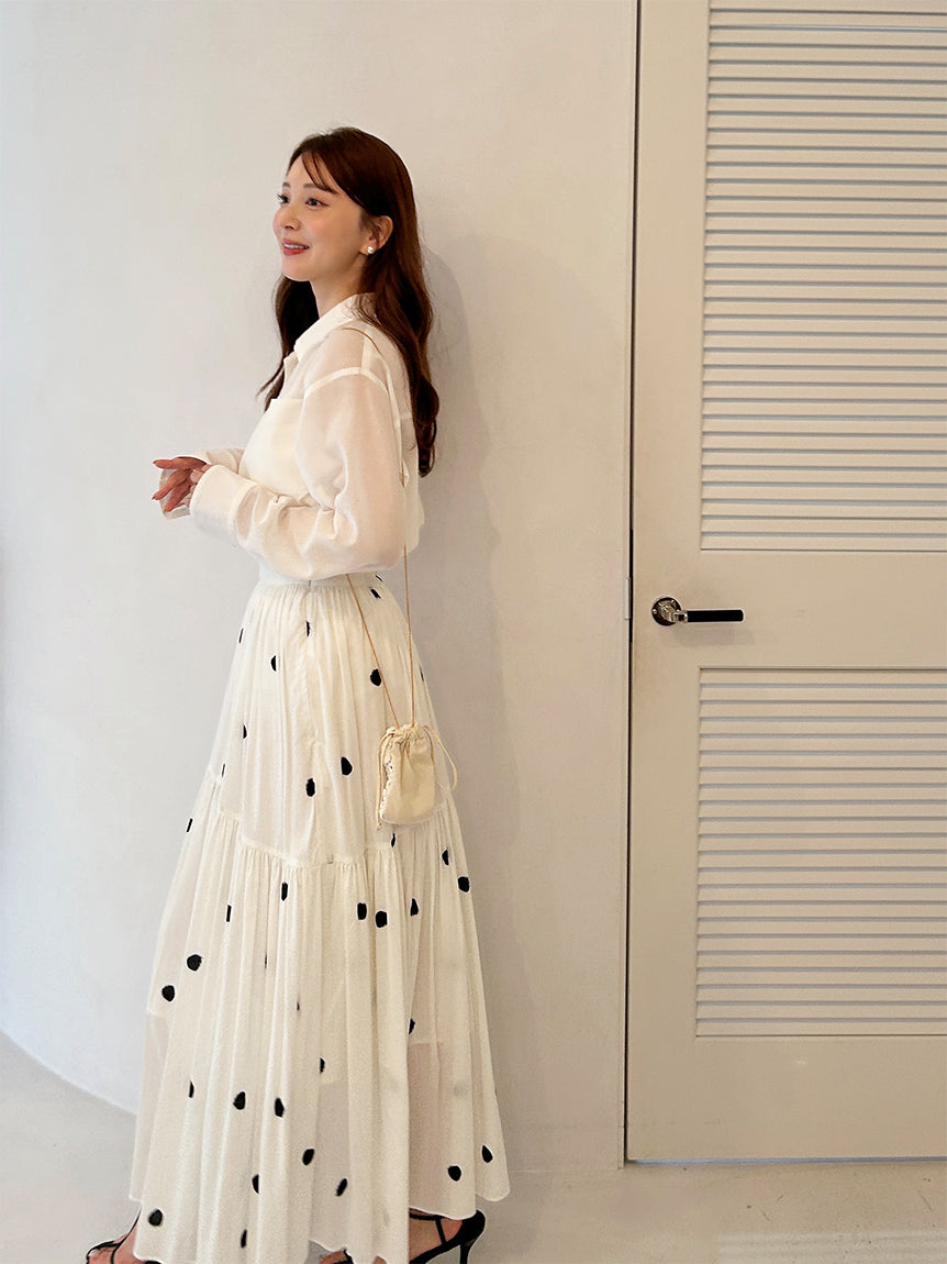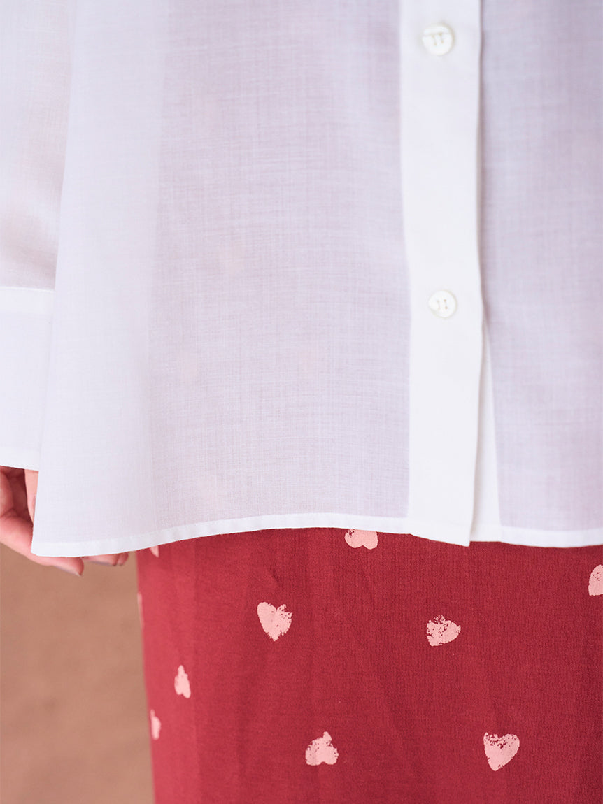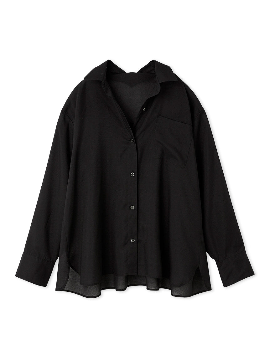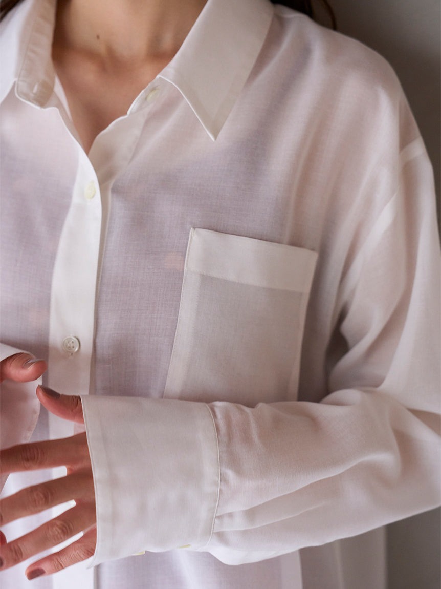 This sheer shirt has a light, smooth cotton-like feel, but is made of 100% polyester for wrinkle resistance and is perfect for sun protection and air conditioning. Its loose, oversized fit makes it perfect for pairing with a dress or camisole, or as a loose, unbuttoned layer. The dropped shoulders create a relaxed look. The shirt's details, such as the buttons and pockets, are delicately finished for a luxurious feel.