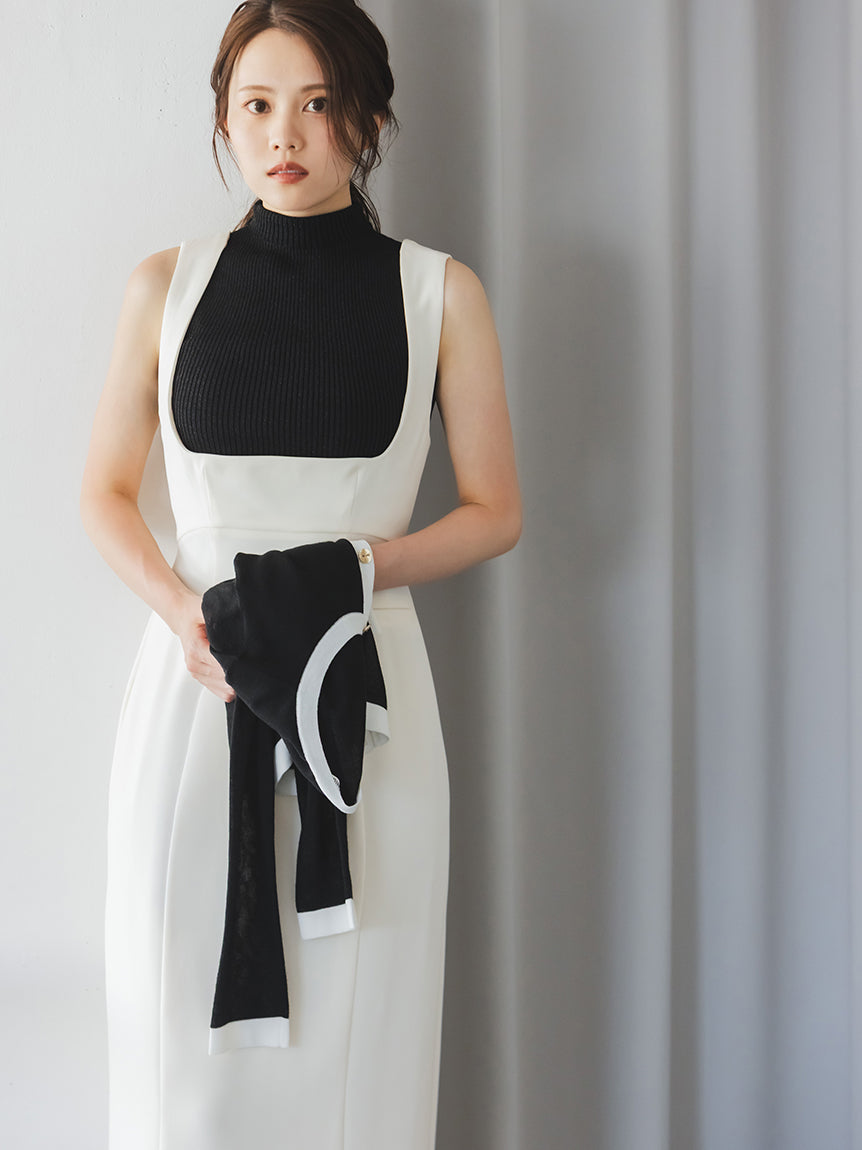 This stand-up collar sleeveless knit pullover features a basic silhouette and ribbed knit for a snug fit. Unlike a cardigan, this sleeveless pullover features a subtle shimmer thanks to the addition of glitter yarn. The subdued glitter yarn creates a sophisticated, sophisticated look. The stand-up collar's width and height have been carefully crafted to create a slimming effect. A mini SNIDEL logo metal plate is added to the back of the collar for an accent.