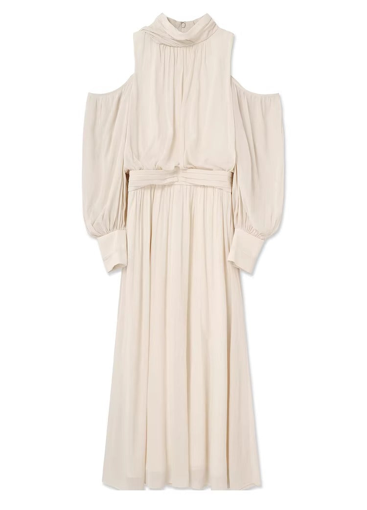 Though designed with long sleeves, the open-shoulder detail adds lightness and balance, giving the dress a delicate and modern finish.