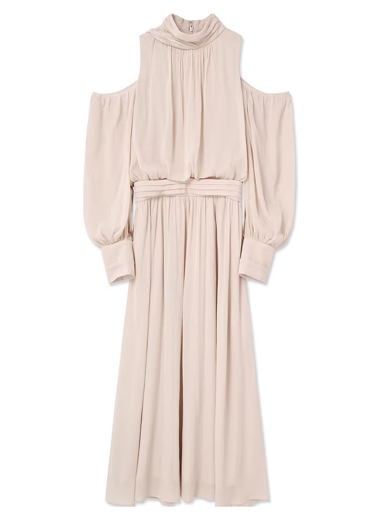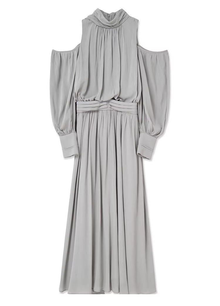 This elegant dress features beautiful draping at the neckline and subtle open shoulders for a refined yet contemporary look. It blends sophistication with a touch of effortless allure.