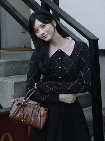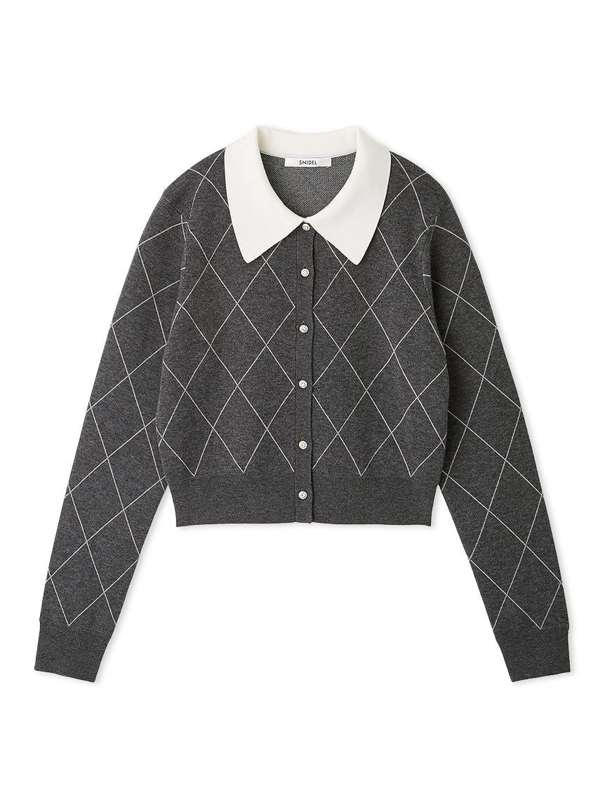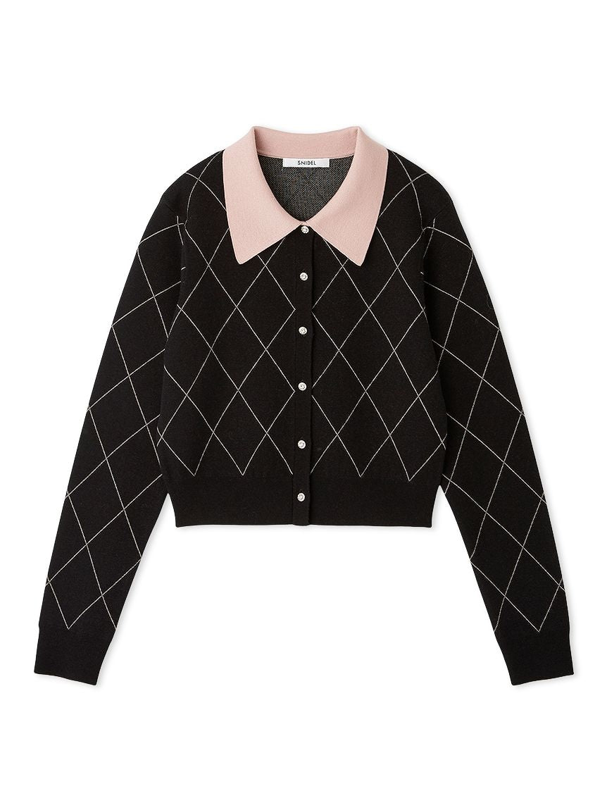 Introducing a glamorous cardigan featuring an elegant argyle check pattern paired with a two-tone collar. Sparkling buttons add a touch of accent, instantly brightening your face. Its slightly cropped length pairs perfectly with any bottoms. Achieve a standout look with this item, or pair it with other items in your closet.