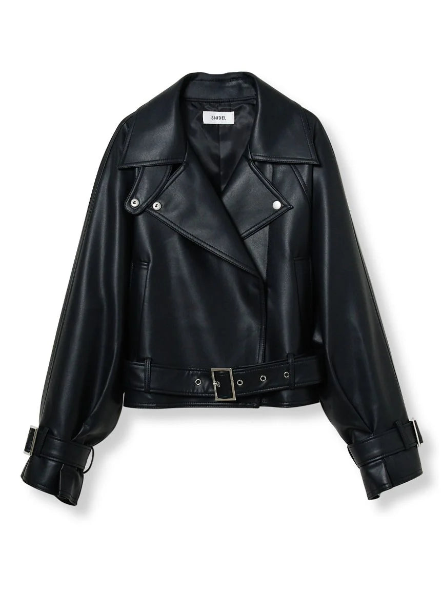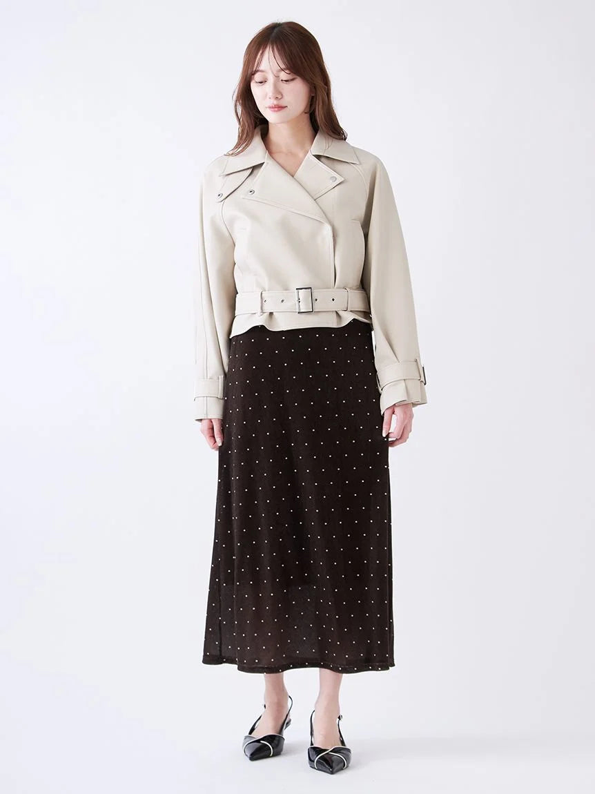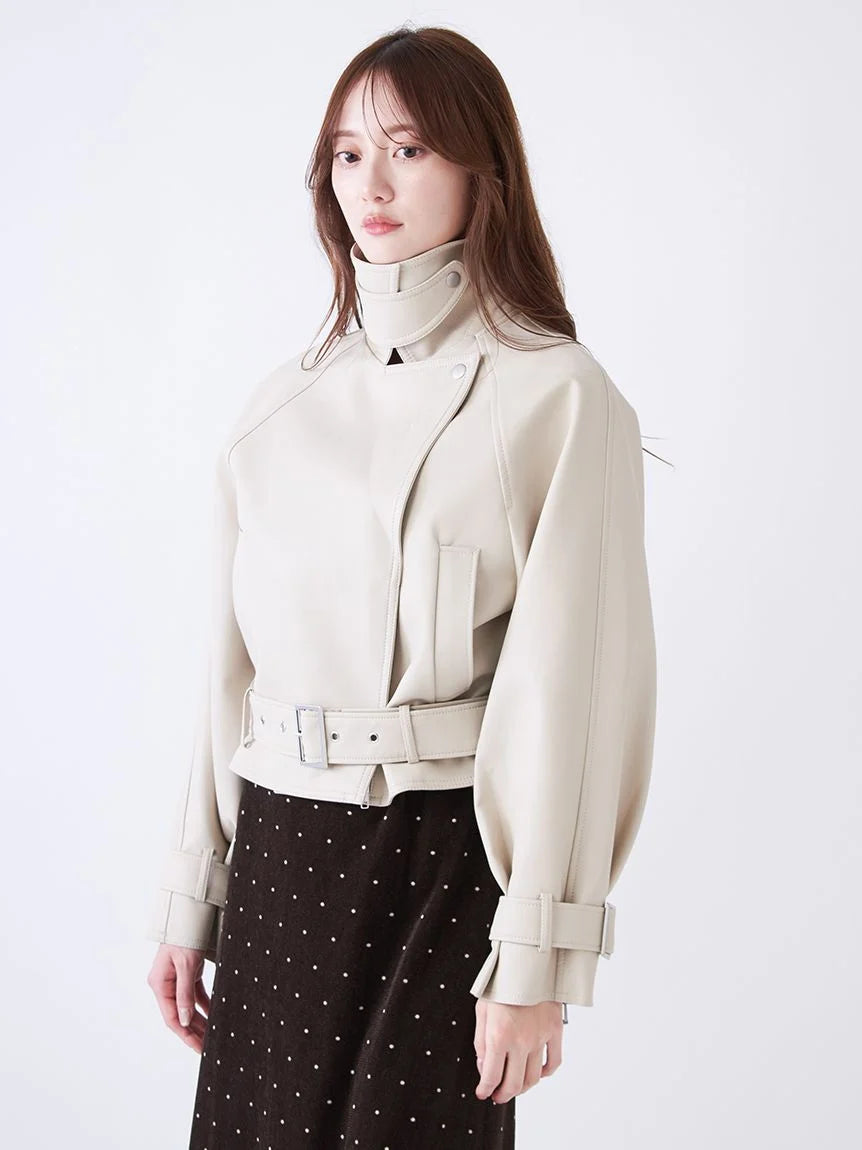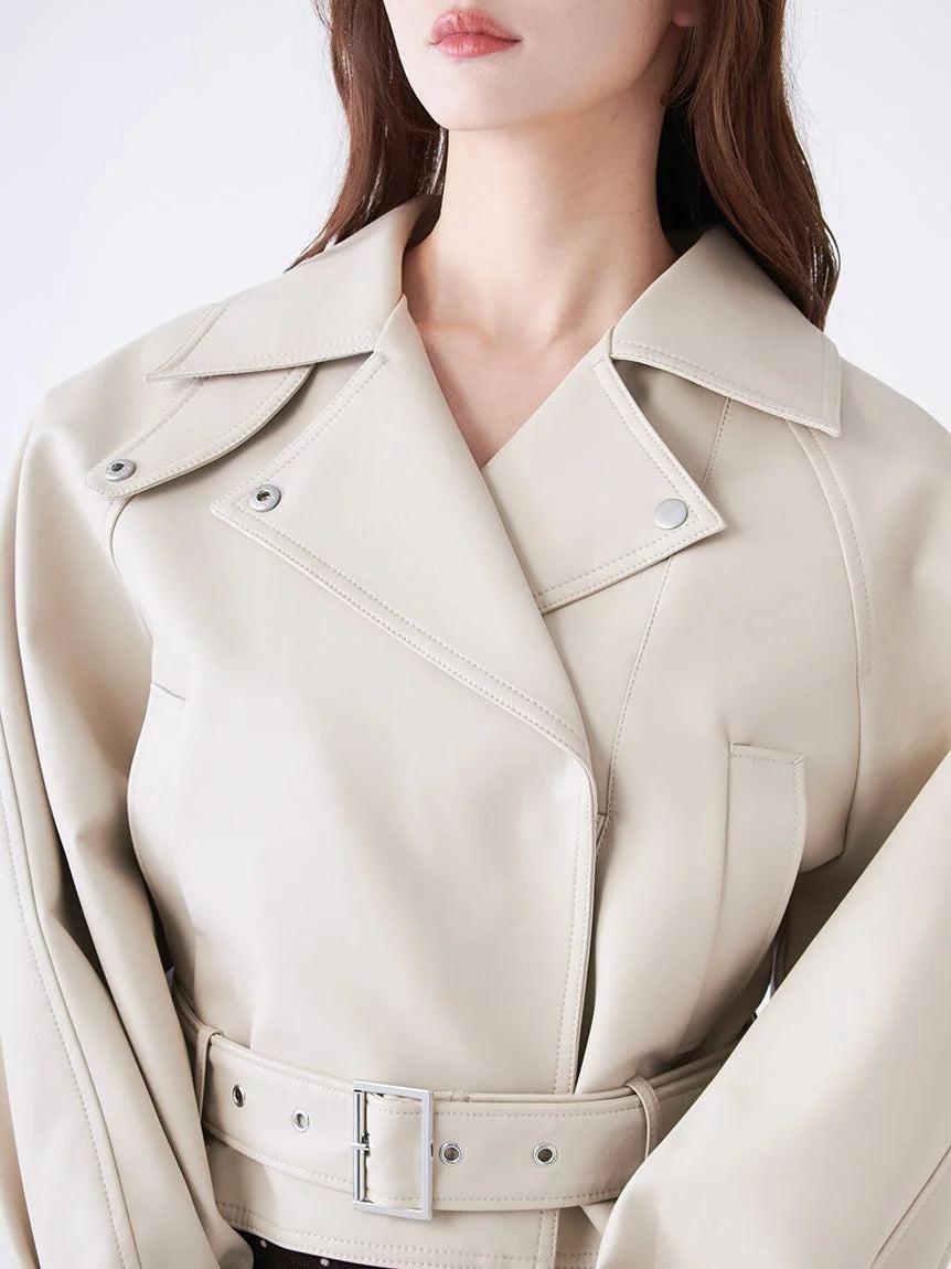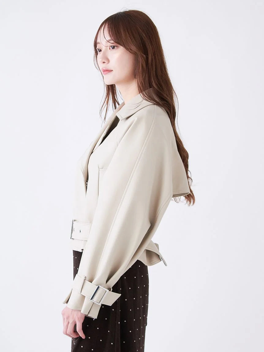 This short trench coat is perfect for early spring, crafted from synthetic leather and trench material. Its