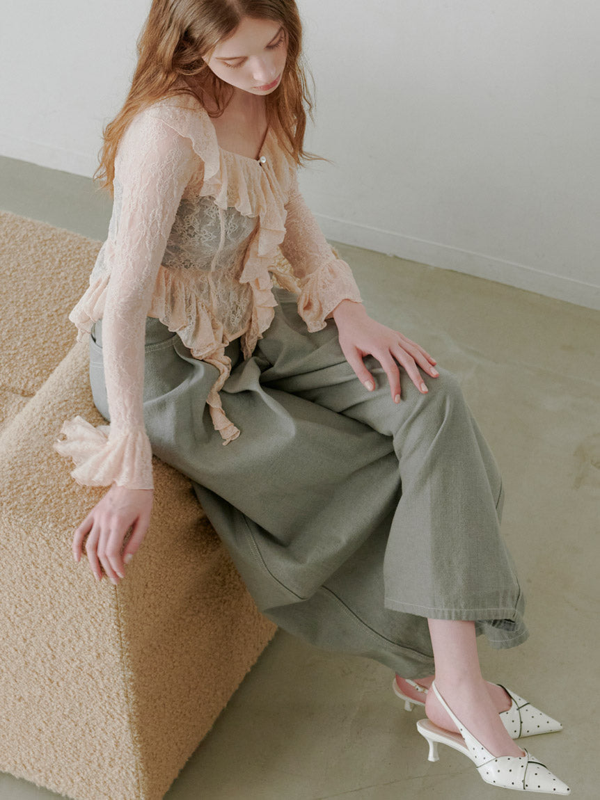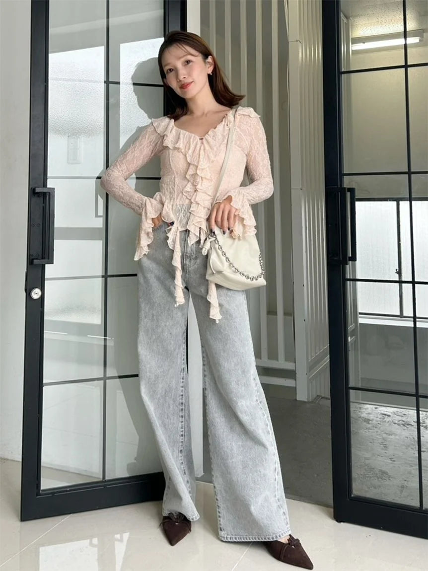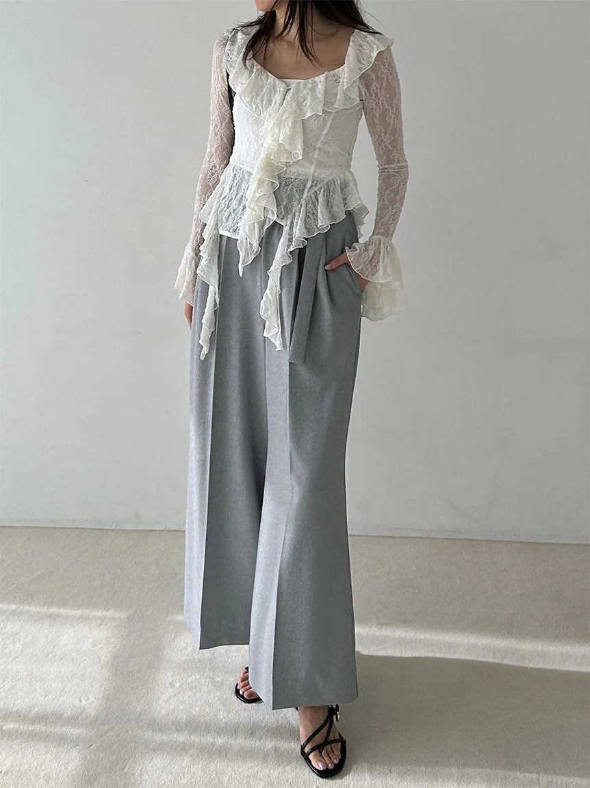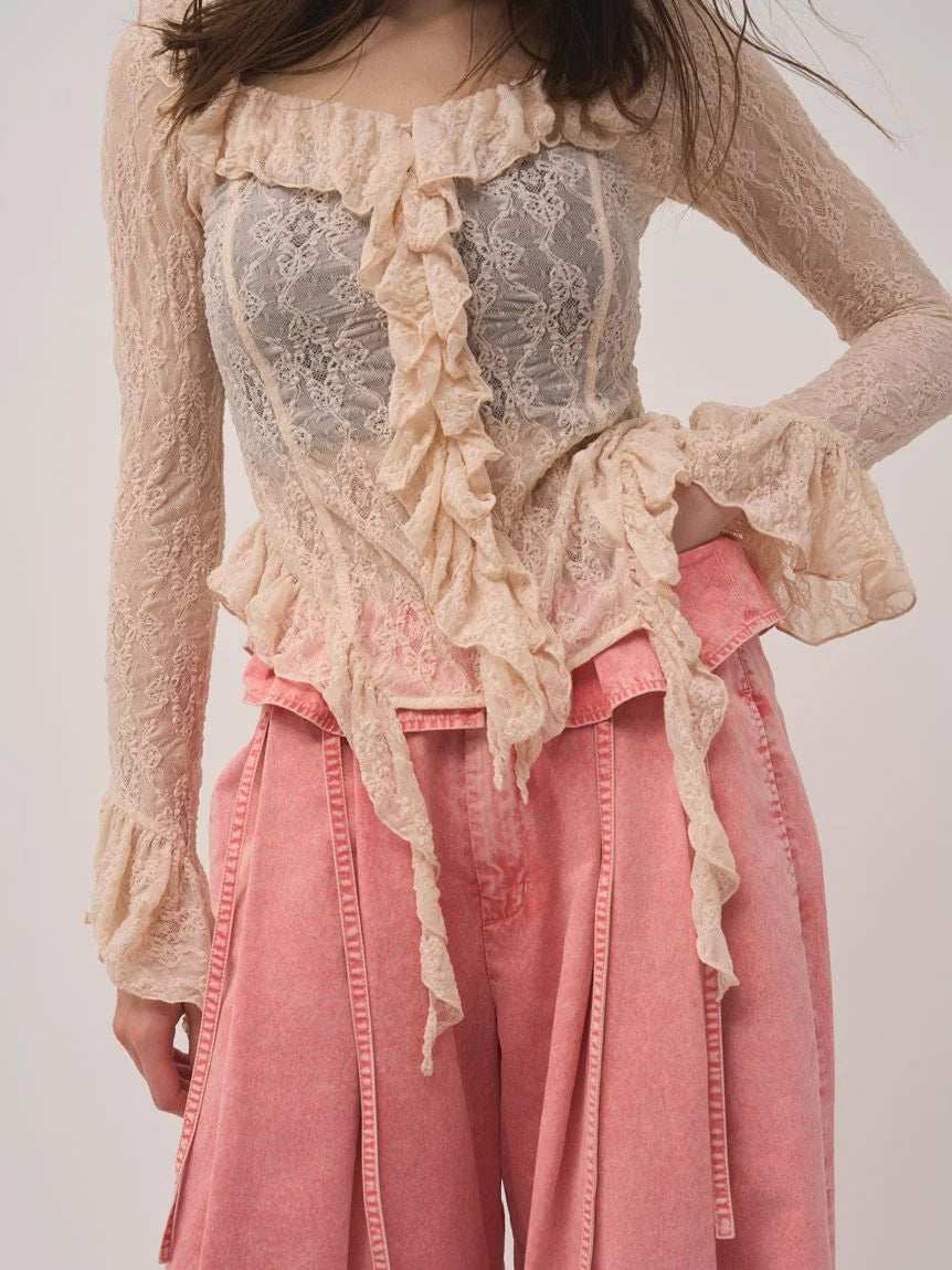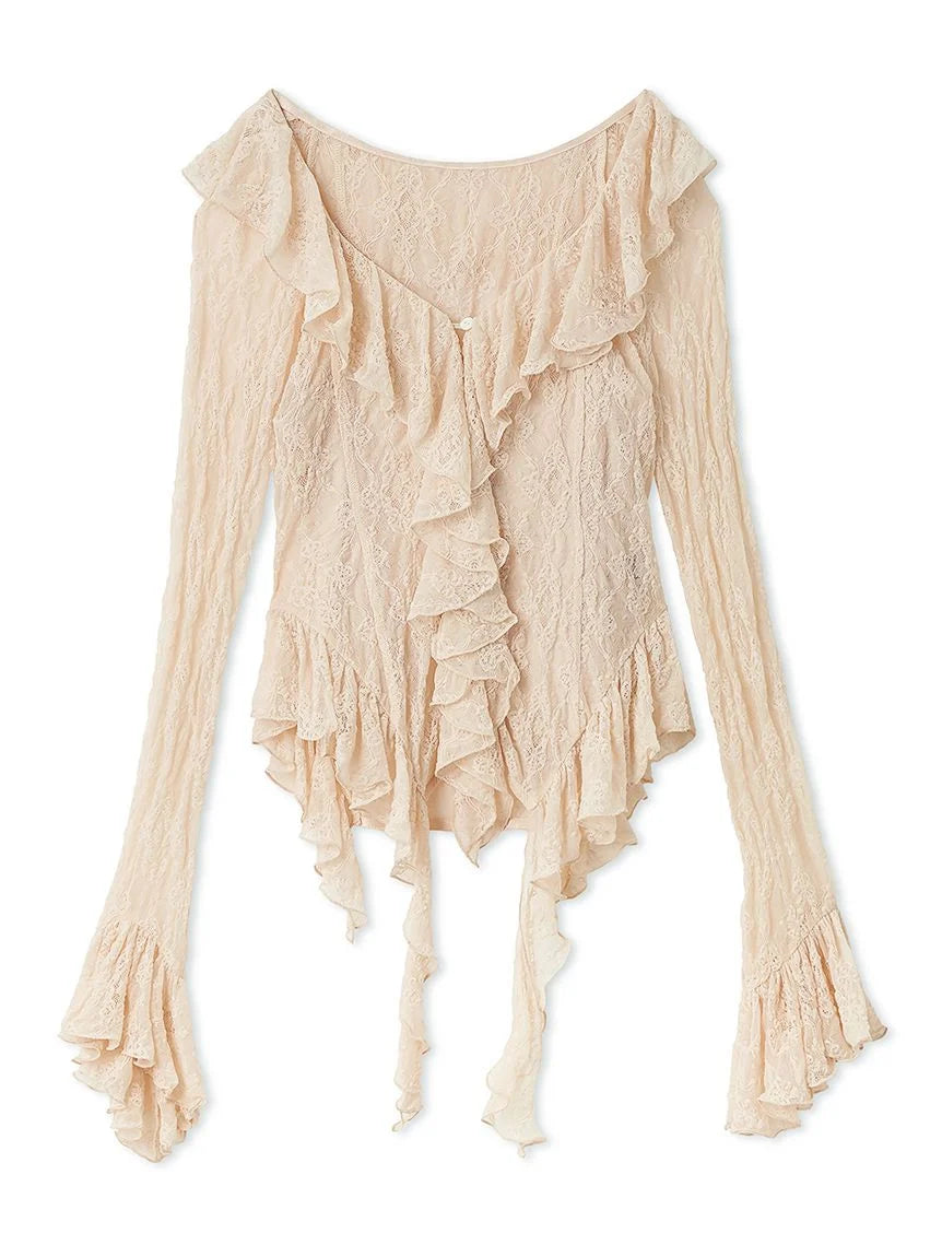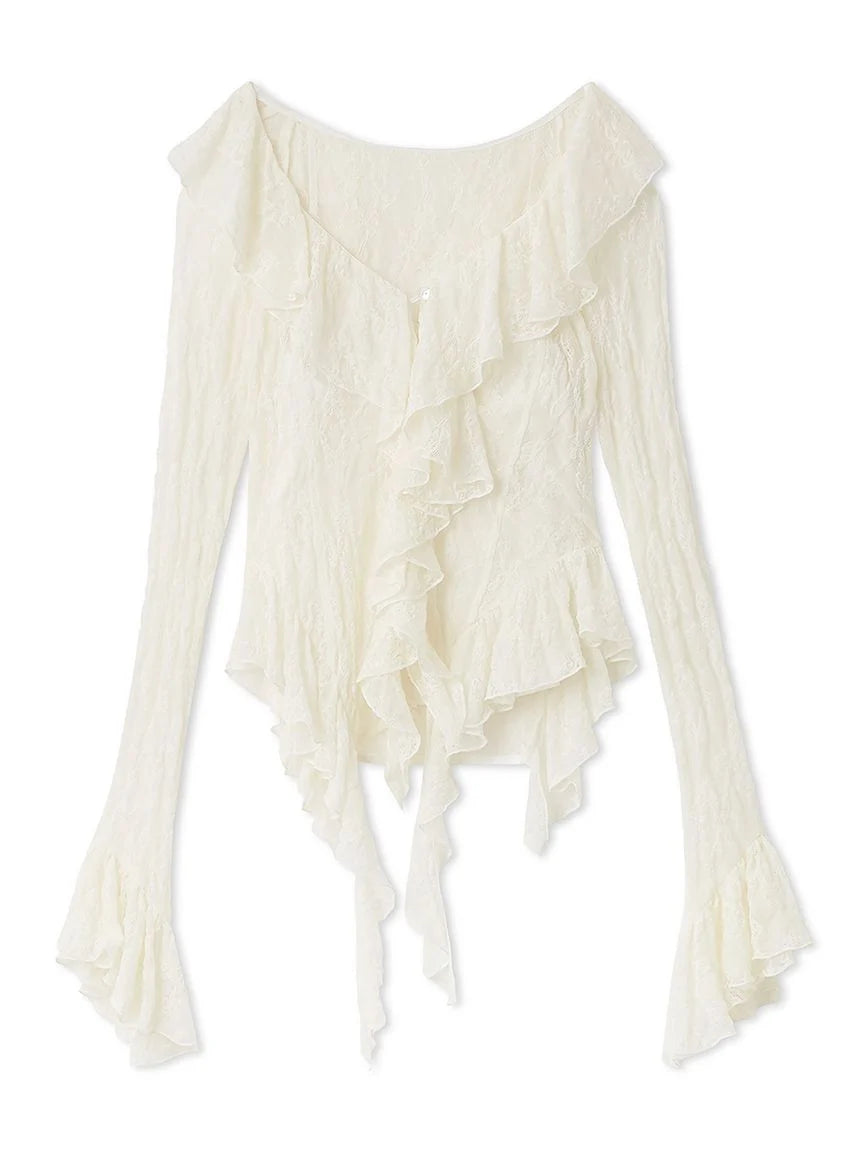 [A gorgeous pullover made with comfortable cut lace fabric and generous ruffles]