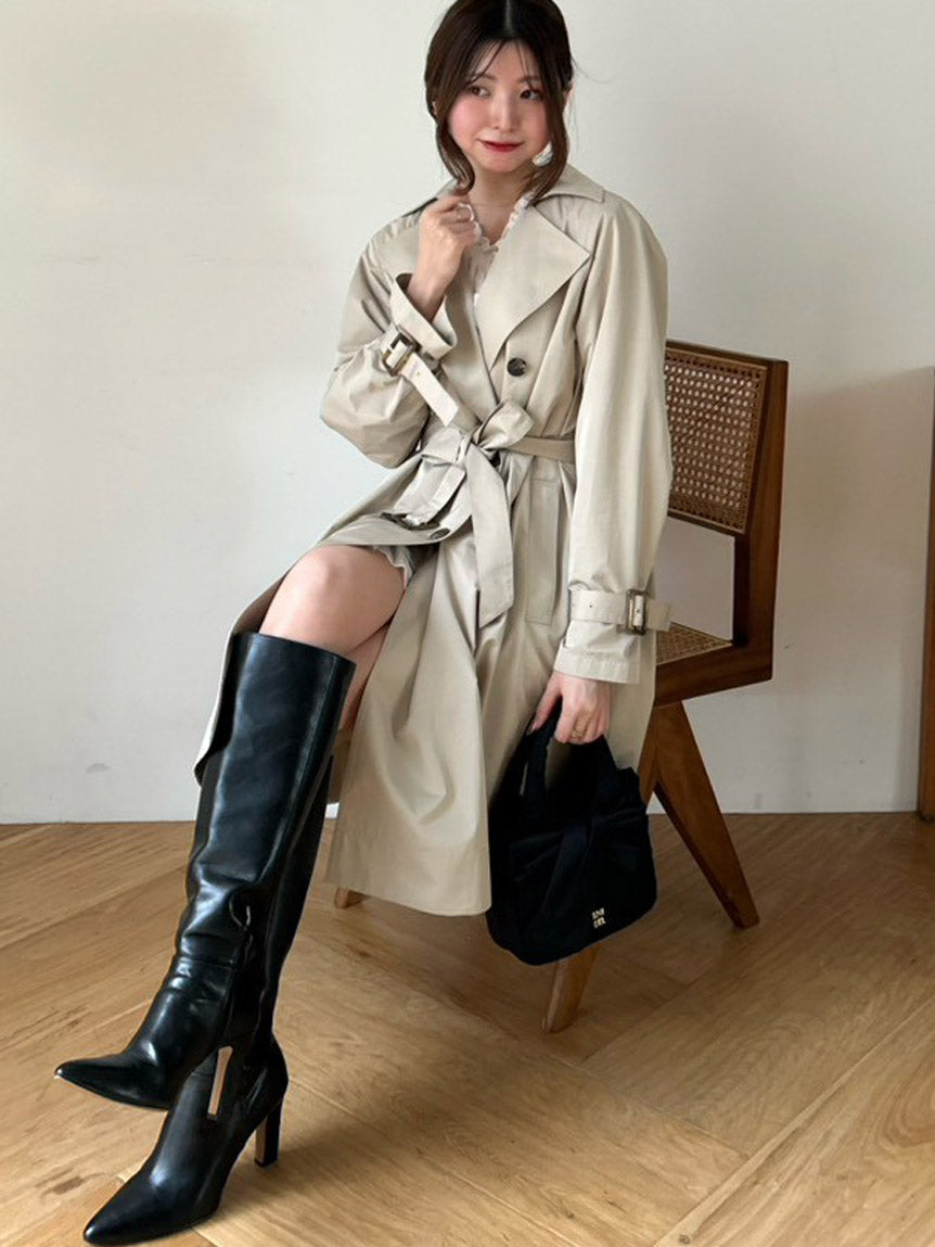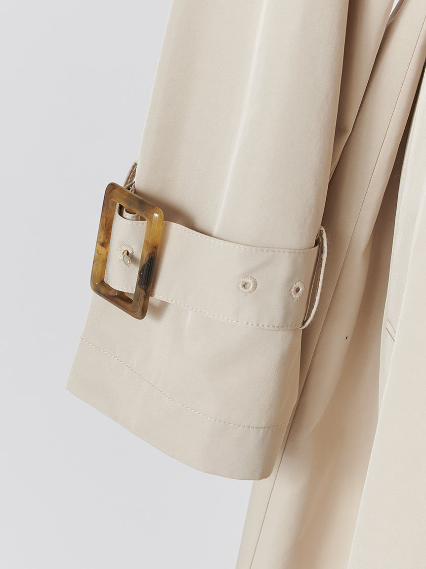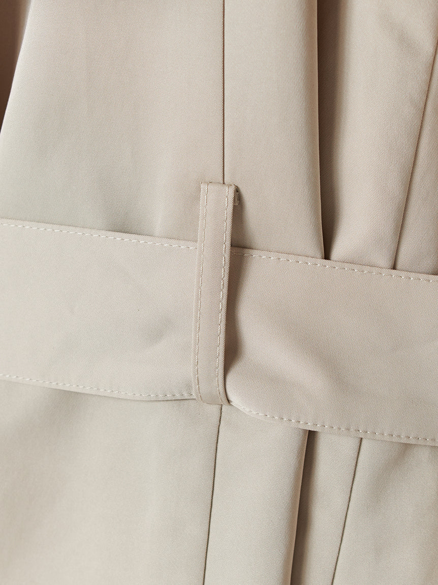 The neatly aligned tortoiseshell-style buttons emphasize vertical lines, creating a flattering silhouette. We’ve paid special attention to the silhouette, featuring a large collar to create a flared look. The coat is lined at the back for a lightweight feel. The waist ribbon can be tied as a single bow or cinched tightly using the tortoiseshell-style buckle. Pockets on both sides.