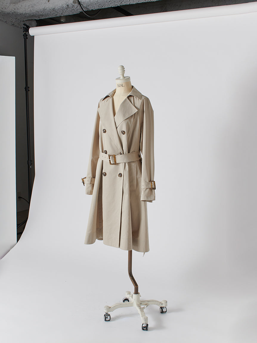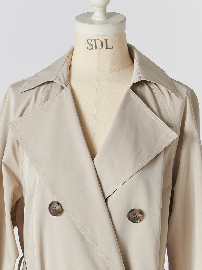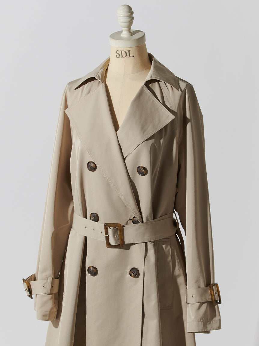 A feminine trench coat crafted from a crisp, nylon-like fabric. The top row of buttons is purely decorative; the coat is designed to be fastened starting from the second row.