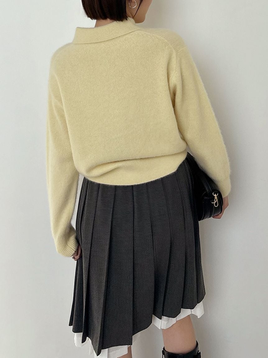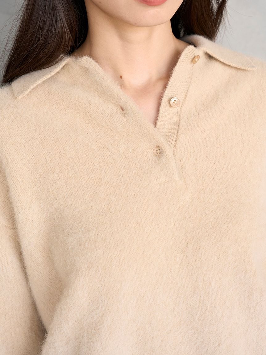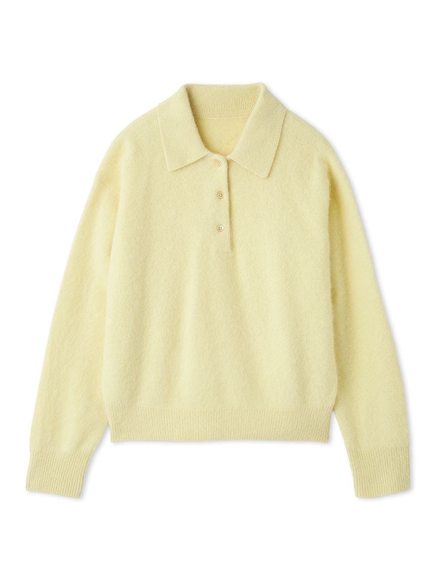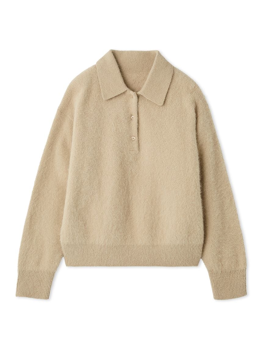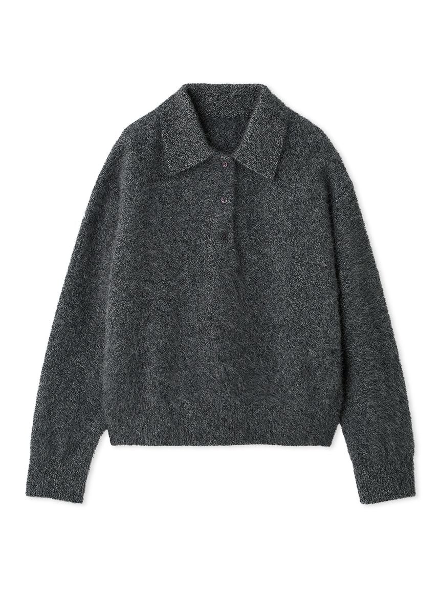 This classic and elegant long-sleeved knit polo is crafted from a warm, high-quality knit fabric blended with fox and cashmere. The long-haired, fluffy, soft, and lustrous knit fabric feels comfortable even worn directly on skin. The chest features an elegant polo design, and the front buttons are lustrous shell buttons. The relaxing fit makes it easy to pair with casual pants or voluminous skirts, making it suitable for a variety of occasions.