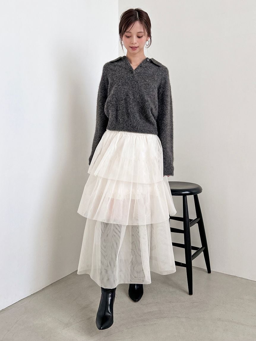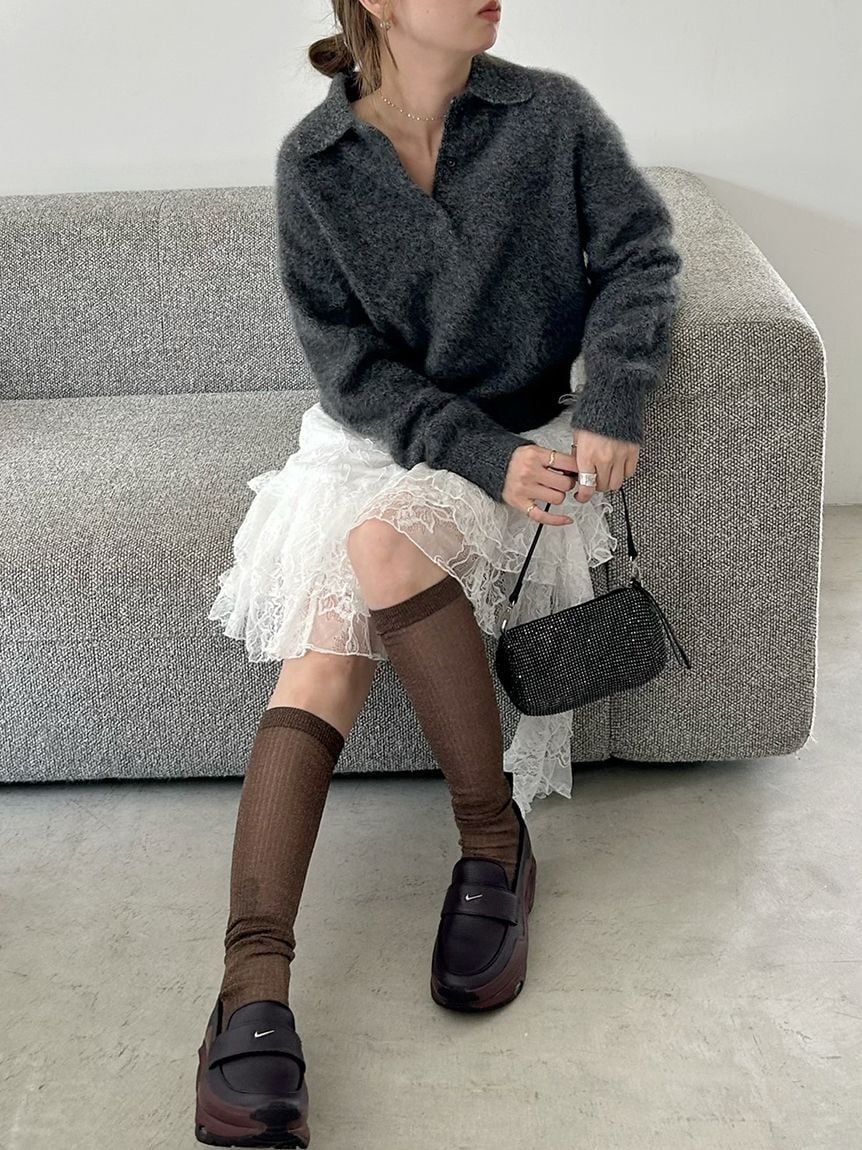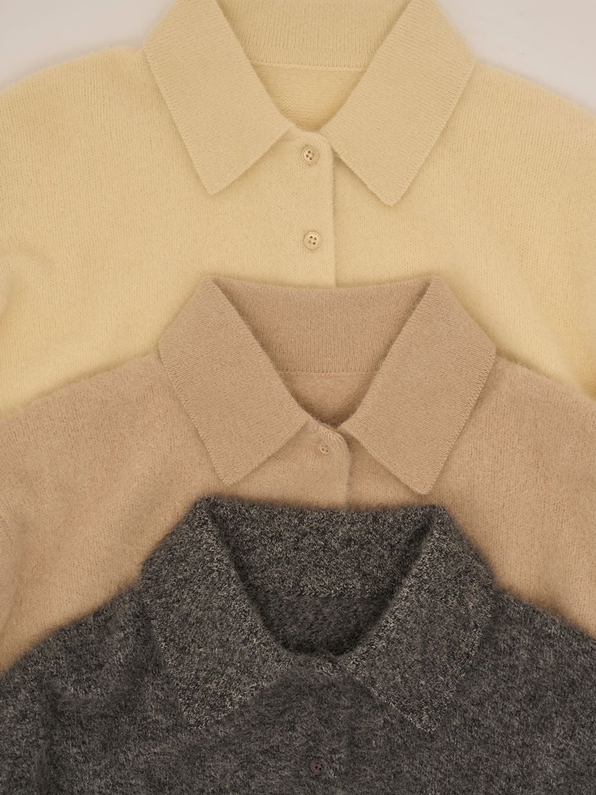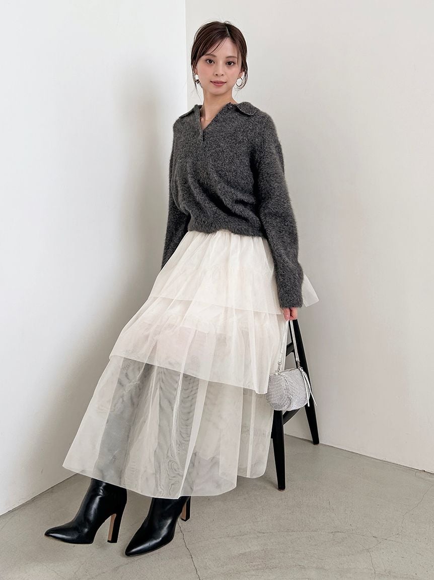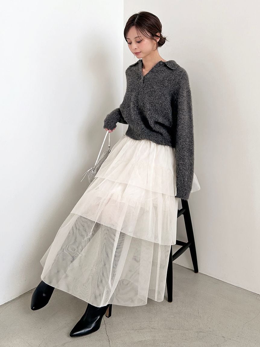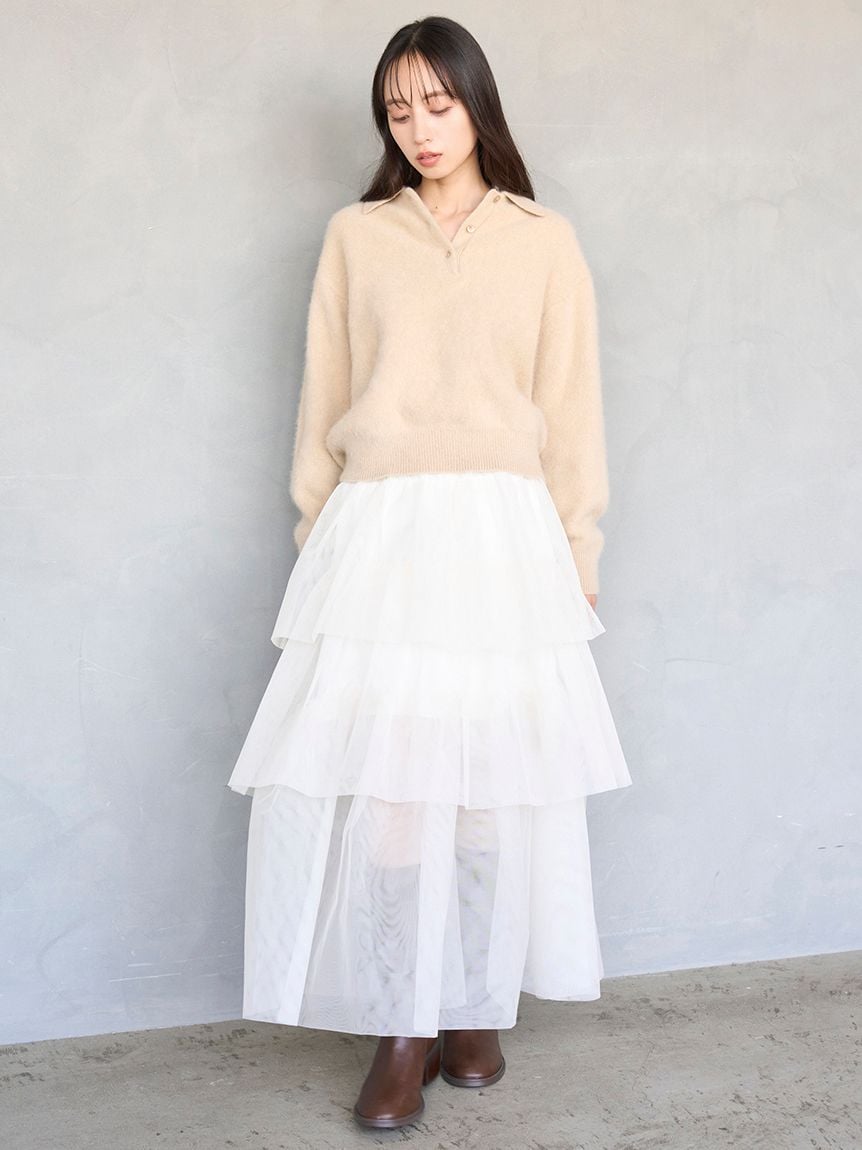 This classic and elegant long-sleeved knit polo is crafted from a warm, high-quality knit fabric blended with fox and cashmere. The long-haired, fluffy, soft, and lustrous knit fabric feels comfortable even worn directly on skin. The chest features an elegant polo design, and the front buttons are lustrous shell buttons. The relaxing fit makes it easy to pair with casual pants or voluminous skirts, making it suitable for a variety of occasions.