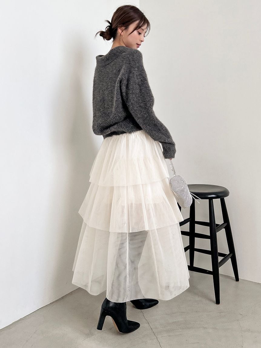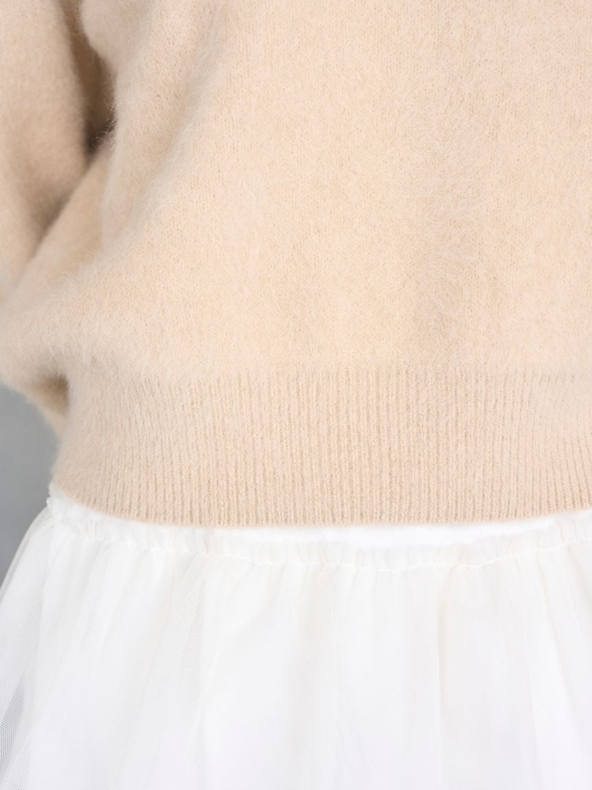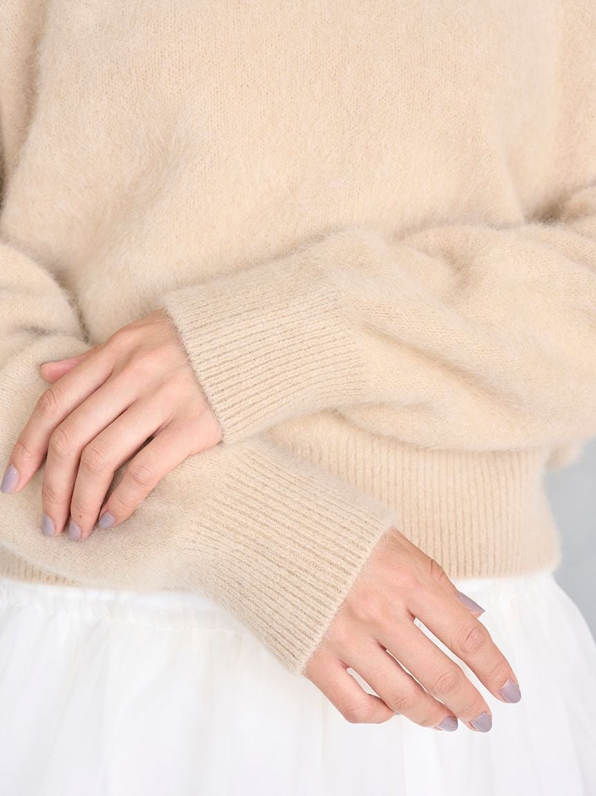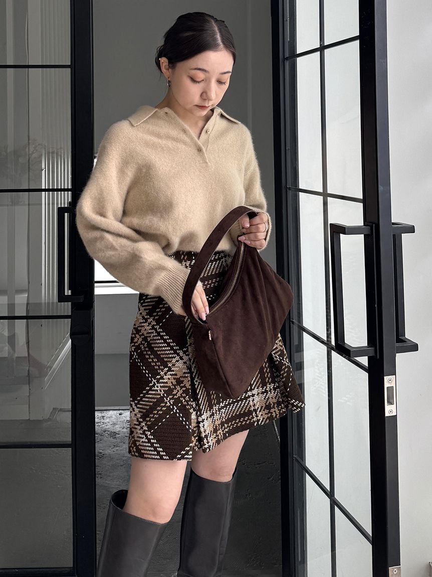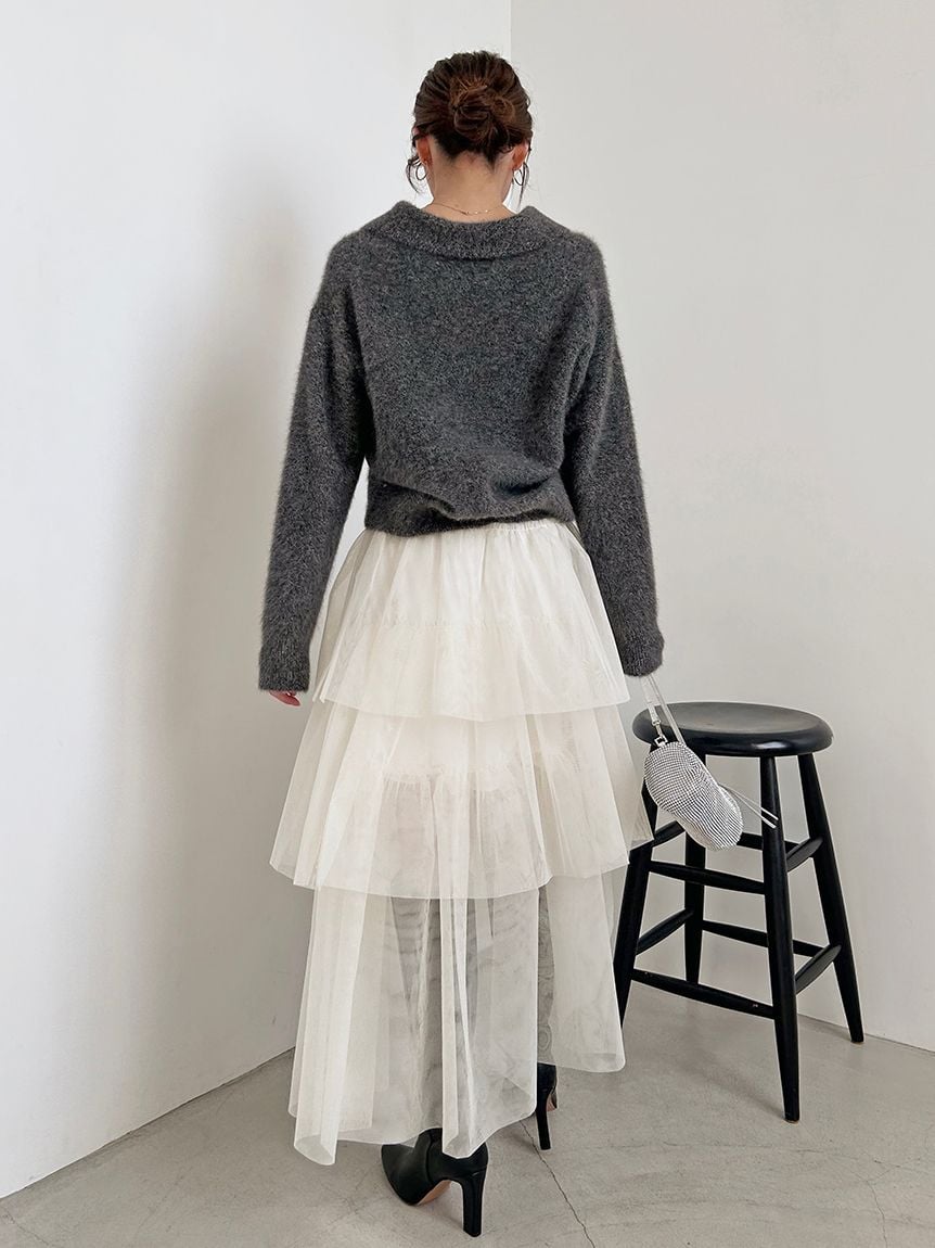 This classic and elegant long-sleeved knit polo is crafted from a warm, high-quality knit fabric blended with fox and cashmere. The long-haired, fluffy, soft, and lustrous knit fabric feels comfortable even worn directly on skin. The chest features an elegant polo design, and the front buttons are lustrous shell buttons. The relaxing fit makes it easy to pair with casual pants or voluminous skirts, making it suitable for a variety of occasions.
