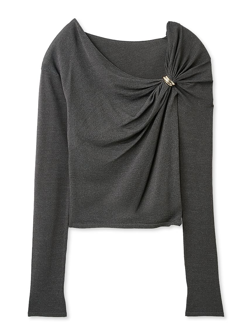 This draped knit pullover is accented with a lustrous, nuanced gold metal accent at the left chest. The trendy draped design is enhanced with metal accents to create a more elegant look, perfect for this season. The generous drape creates a bold, open neckline for a modern look. The dropped shoulders create a relaxed fit, adding a touch of airiness to the body.