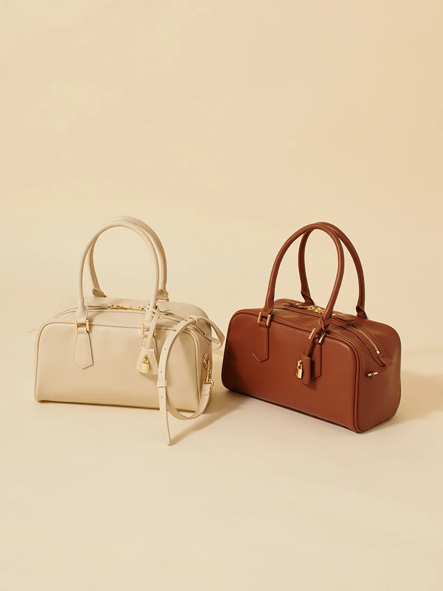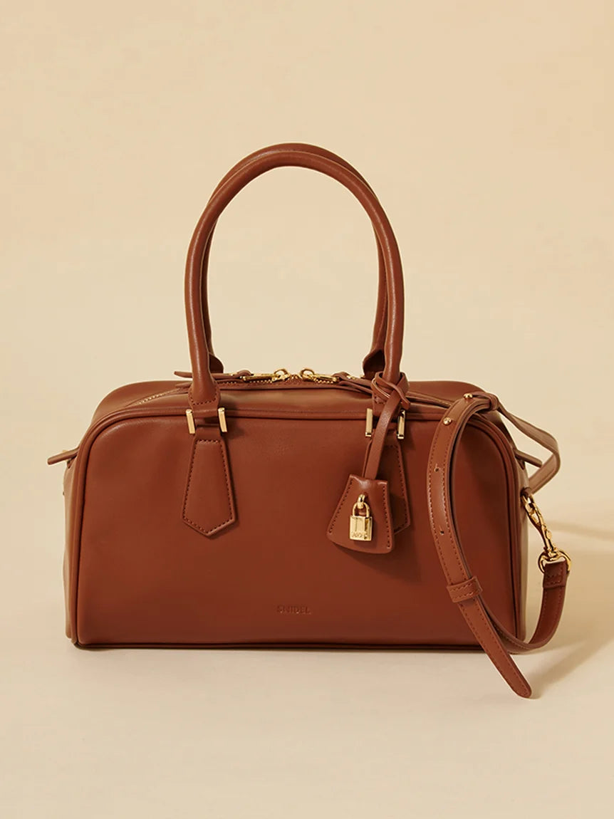 A traditional Boston bag accented with a padlock charm.