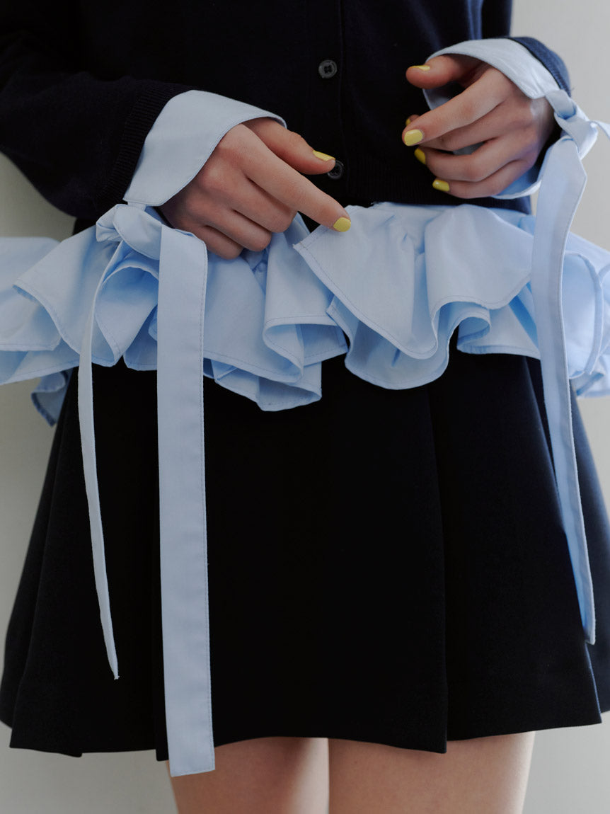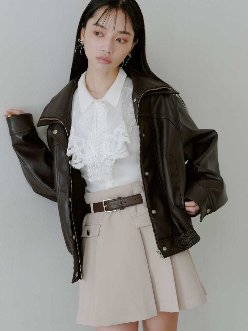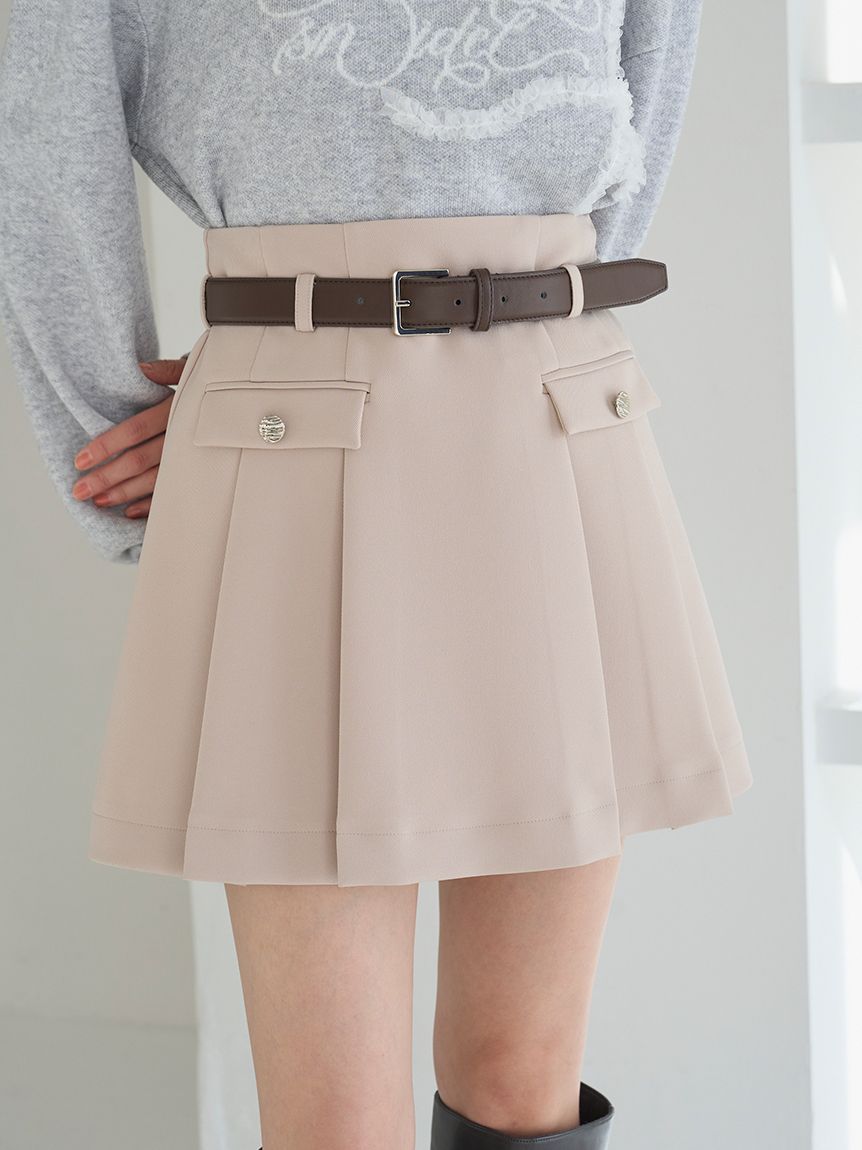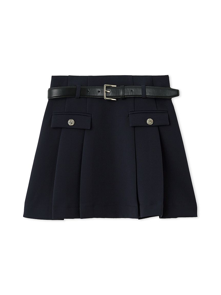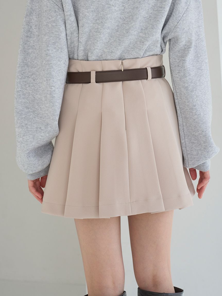 [A sophisticated pleated miniskirt with a wrinkle-resistant faux leather belt]