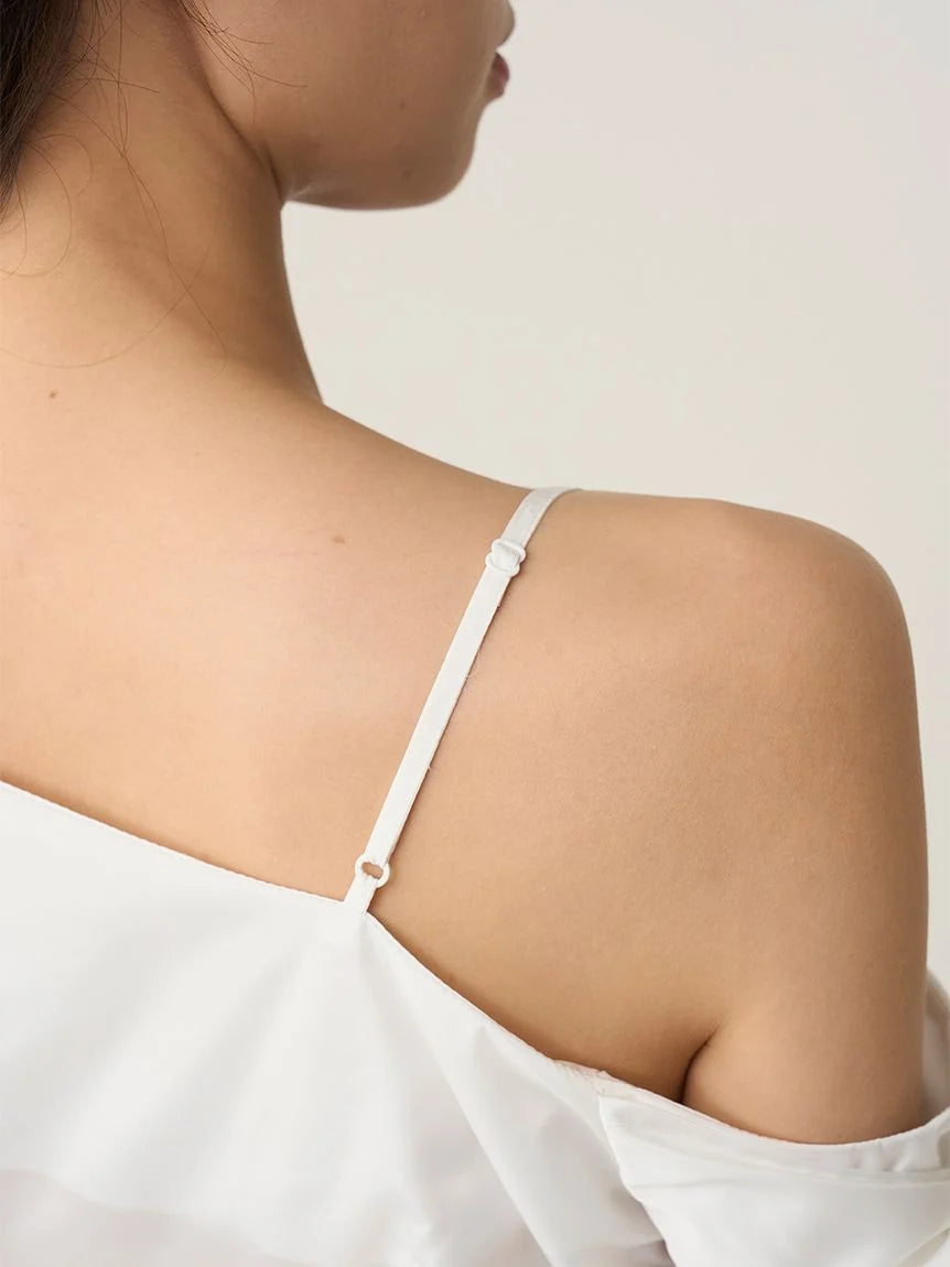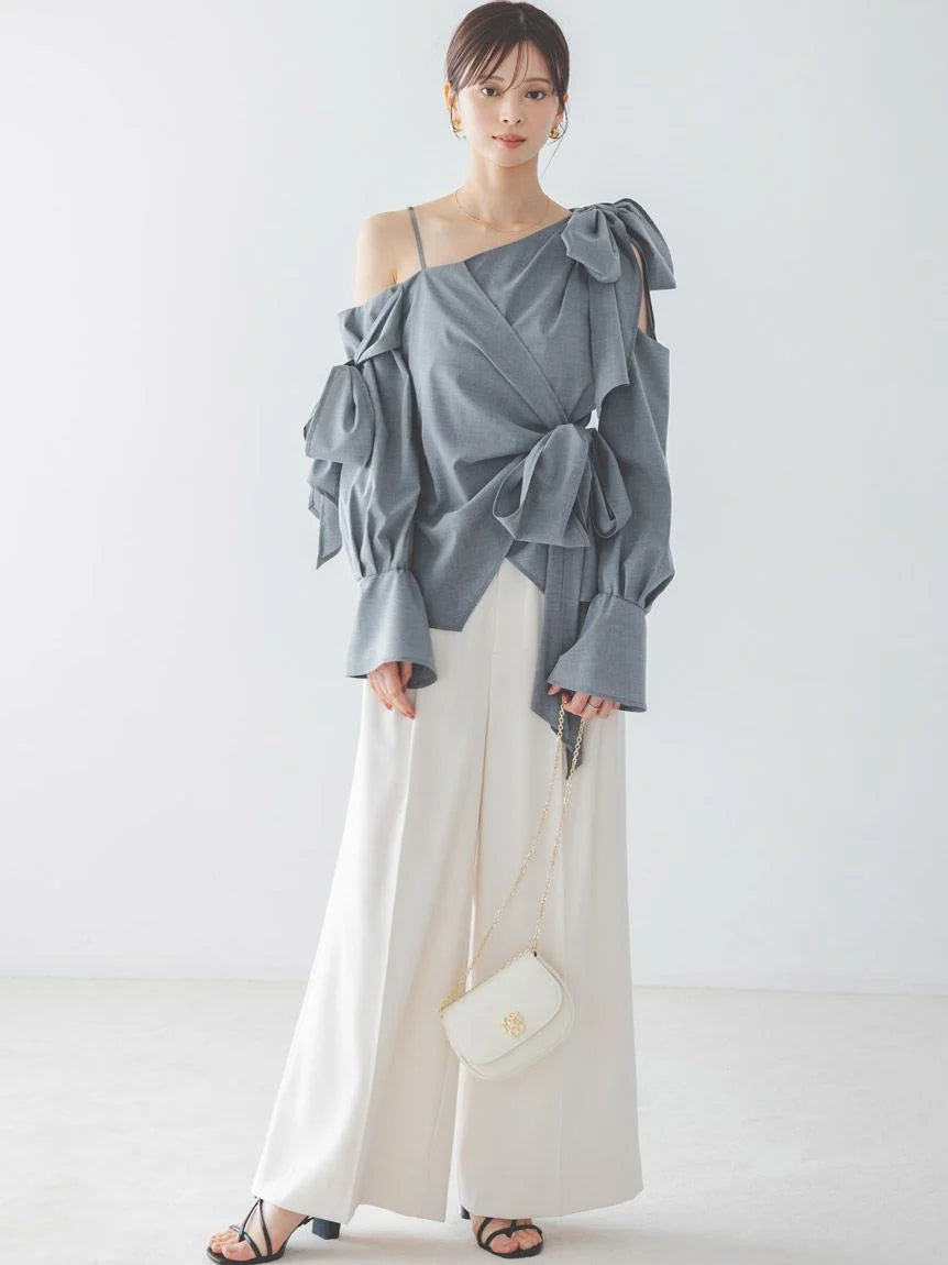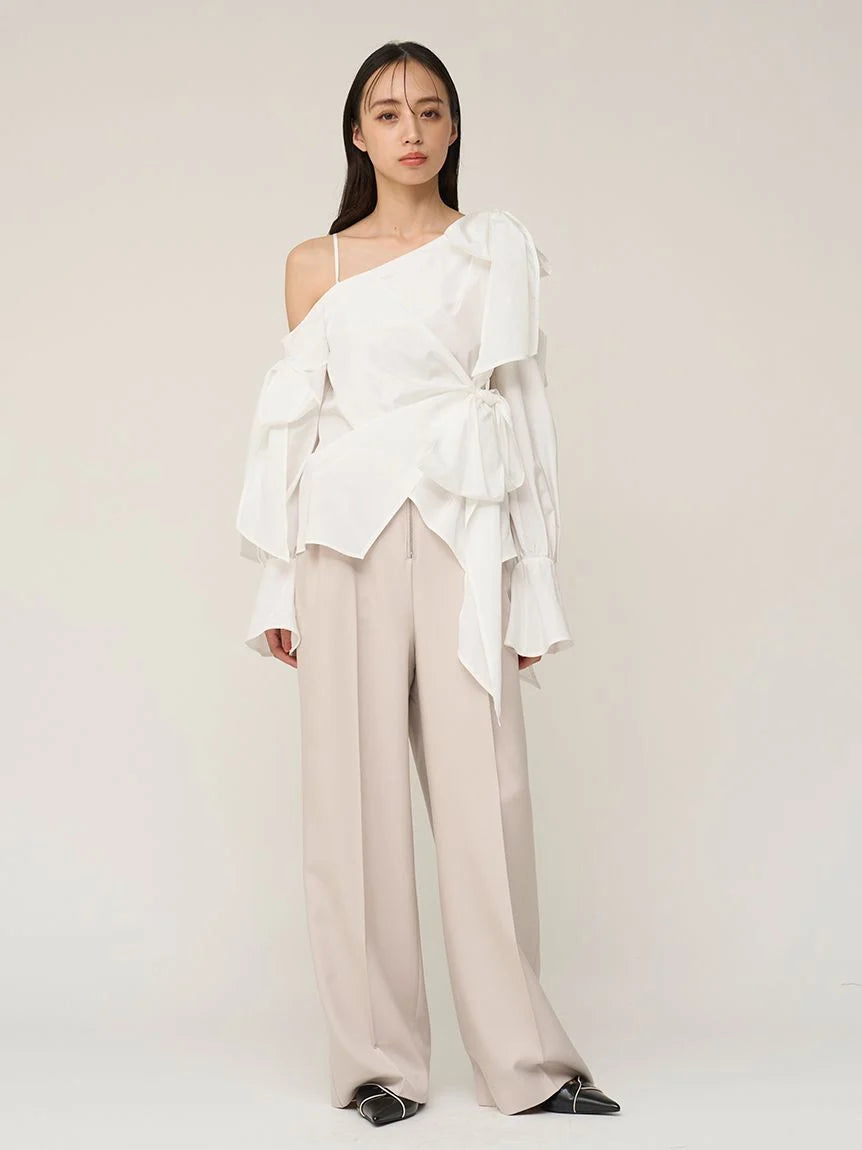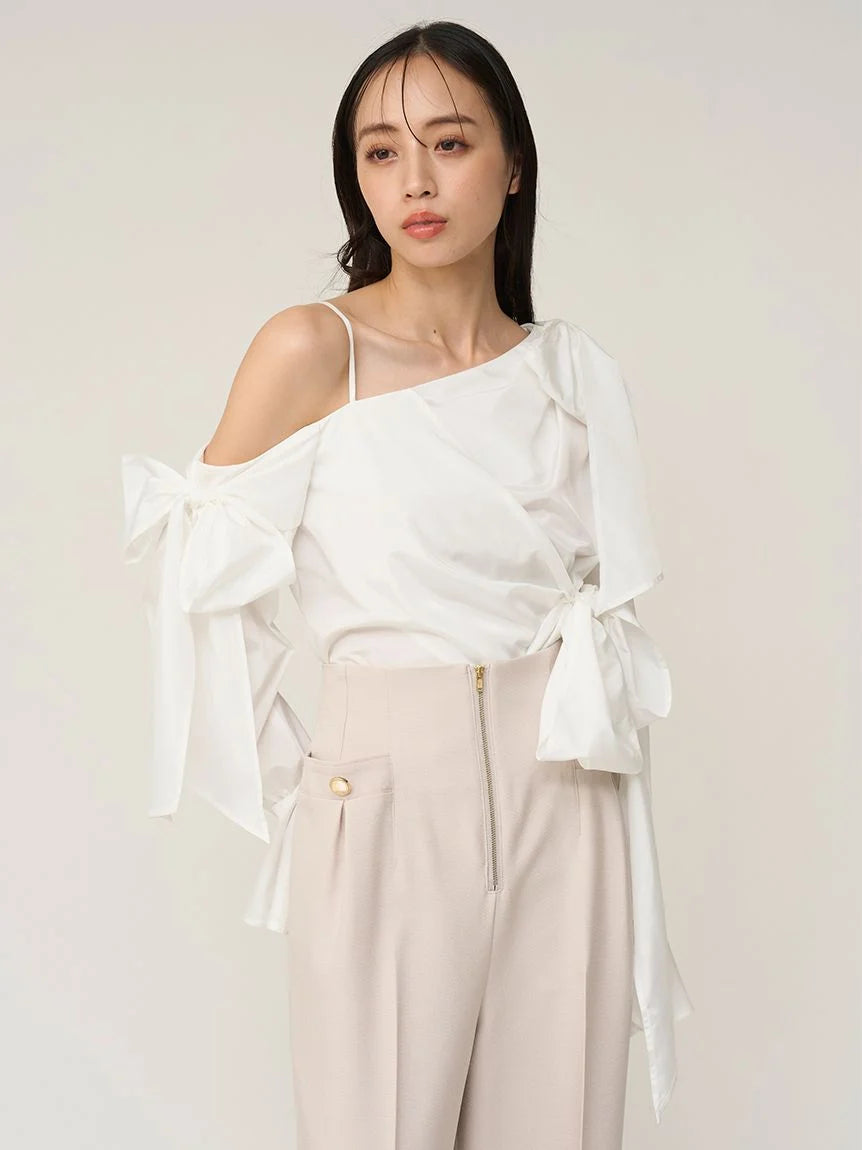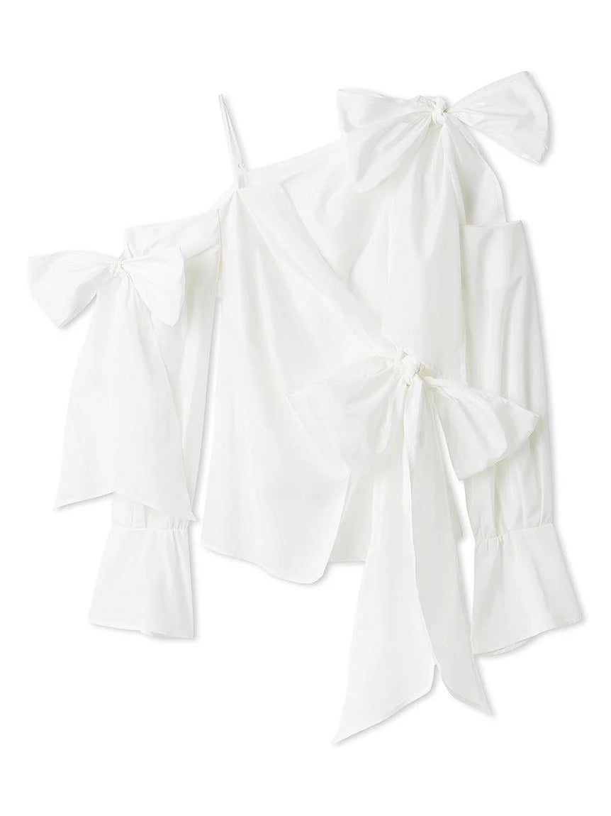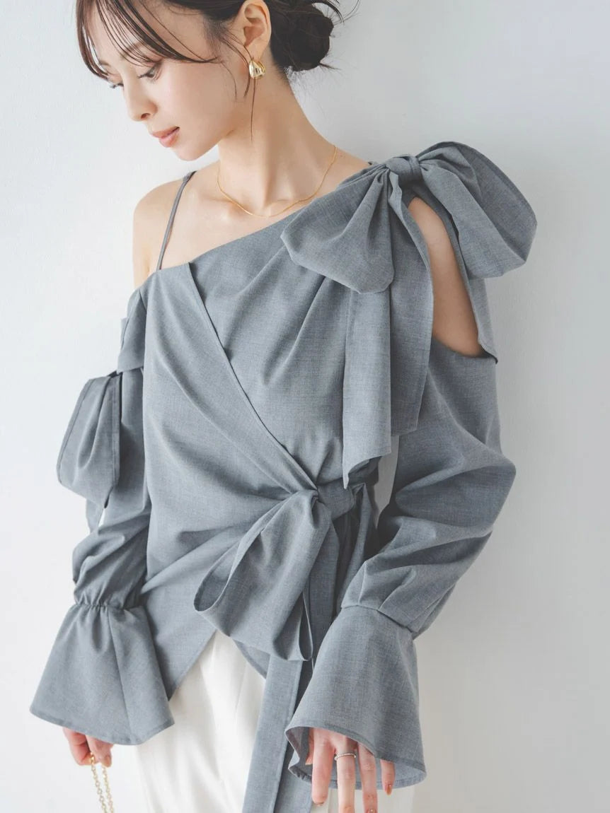 A trendy one-shoulder blouse with generous ribbon detailing.
