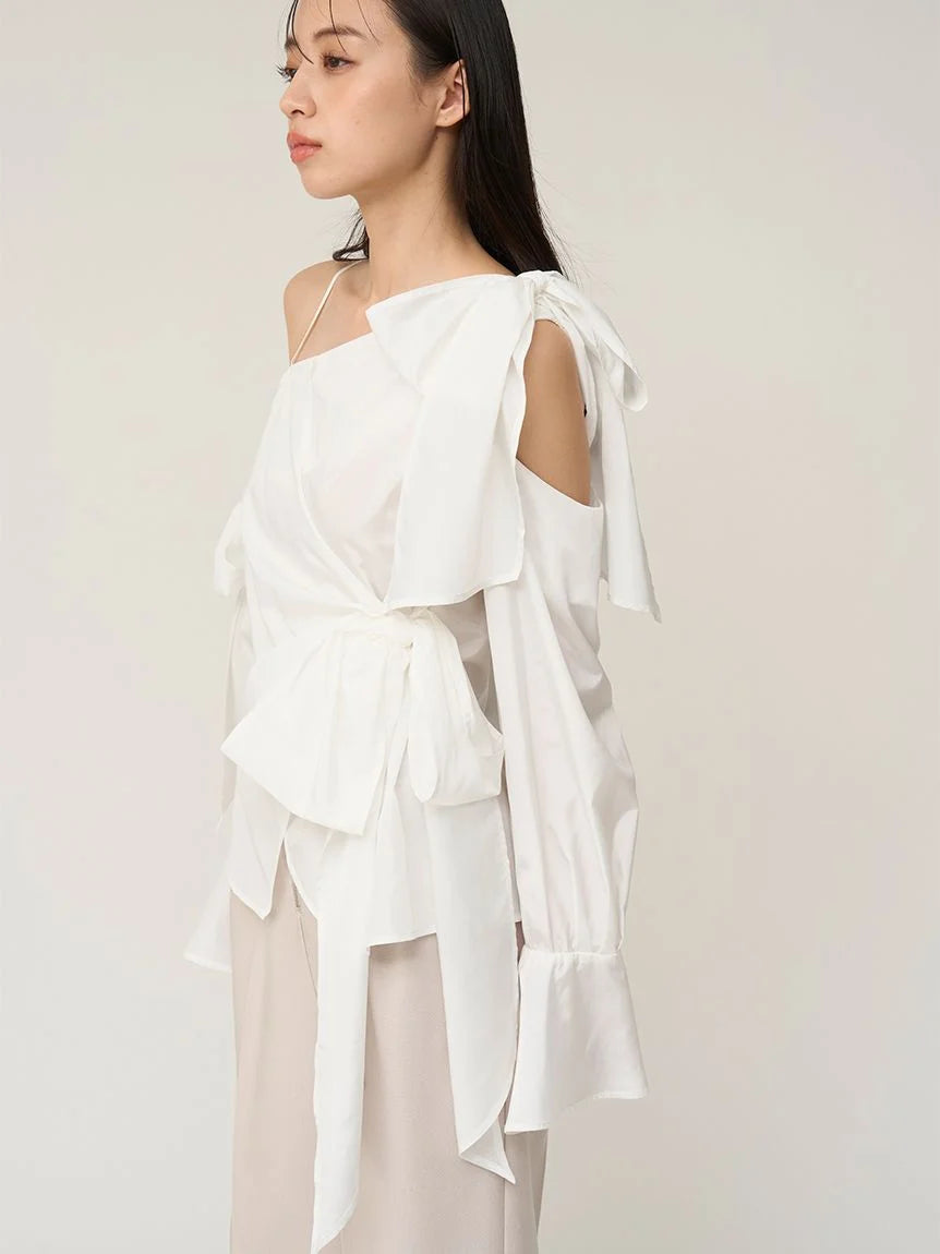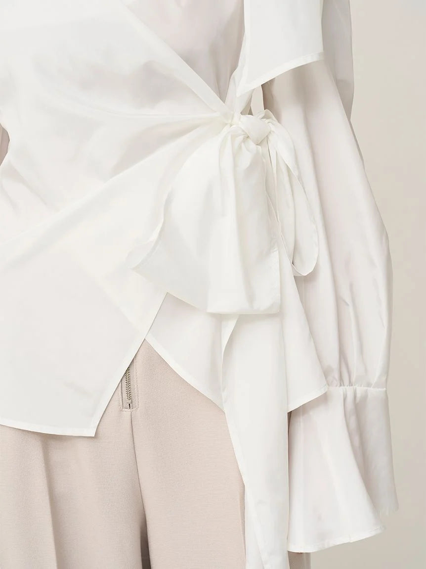A cut shoulder design on the left shoulder adds a relaxed feel. The long sleeves feature bell cuffs for a touch of elegance. Crafted from taffeta and twill, the material changes depending on the color. The front ribbon can be left open and worn as a pull-over top.