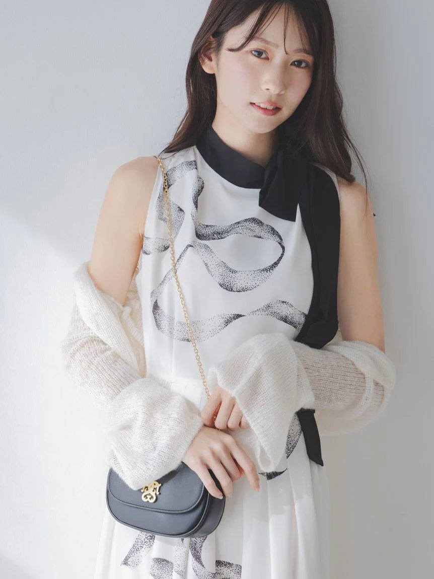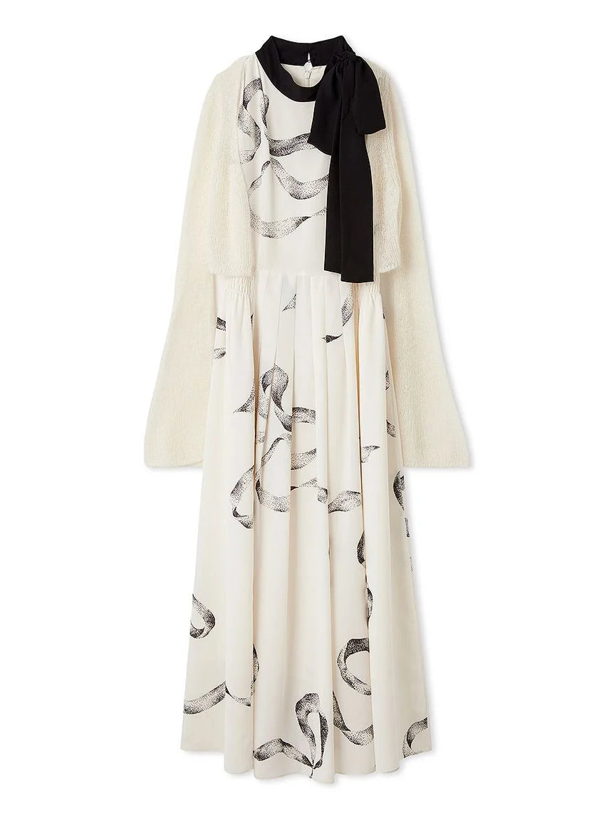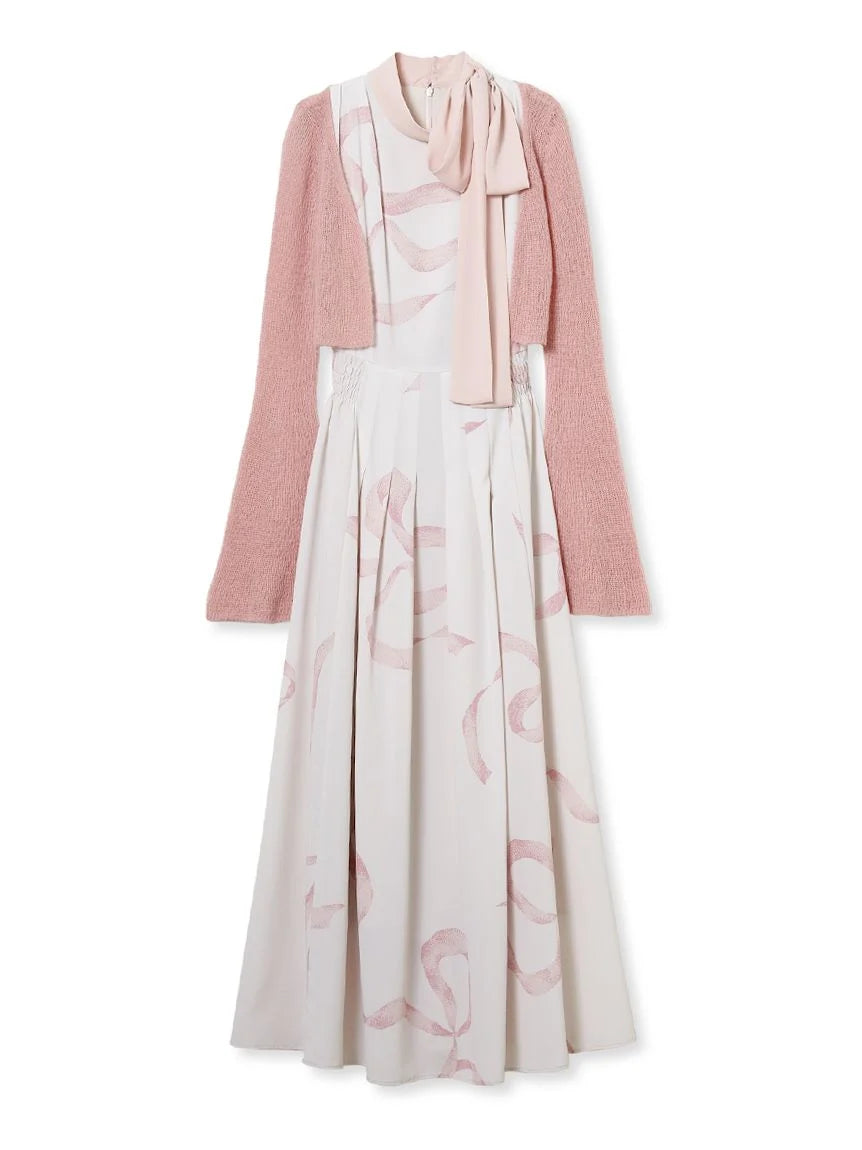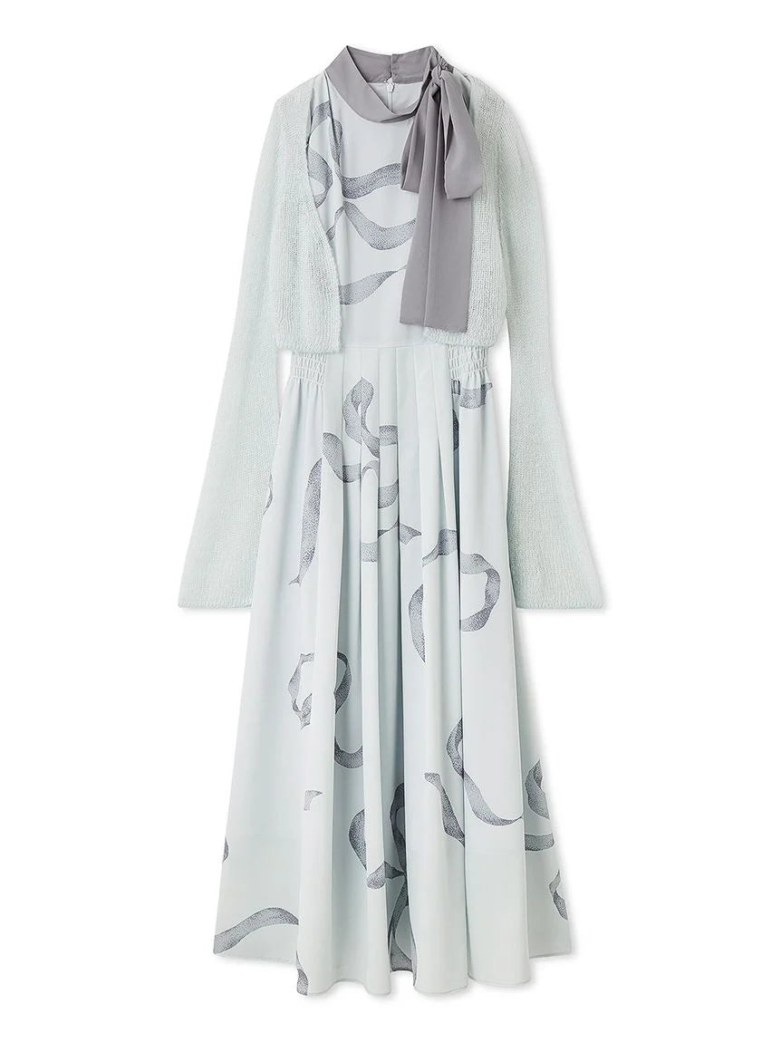 [Bowtie Dress and Knit Cardigan Set Featuring an Elegant Ribbon Print]