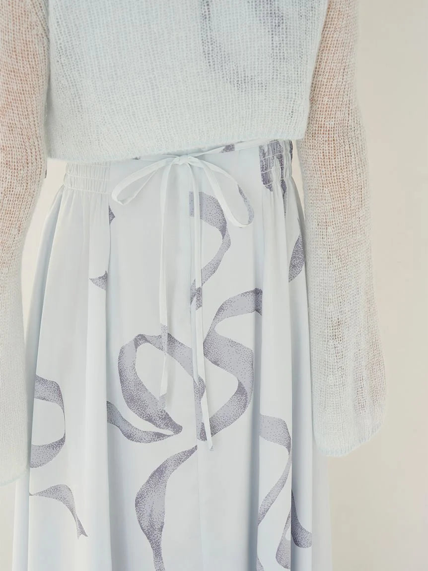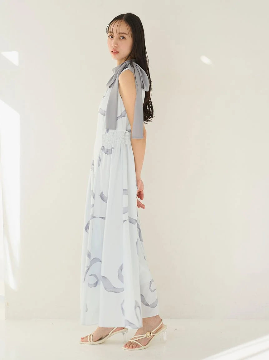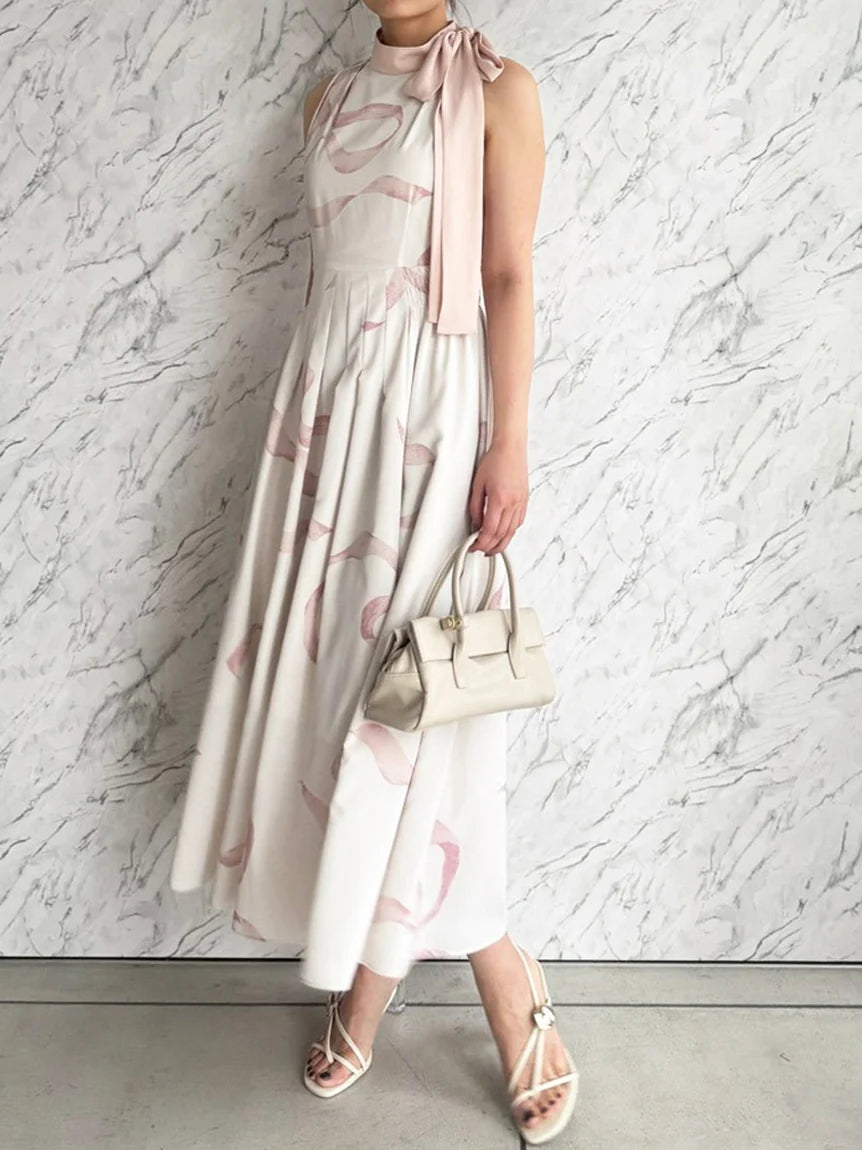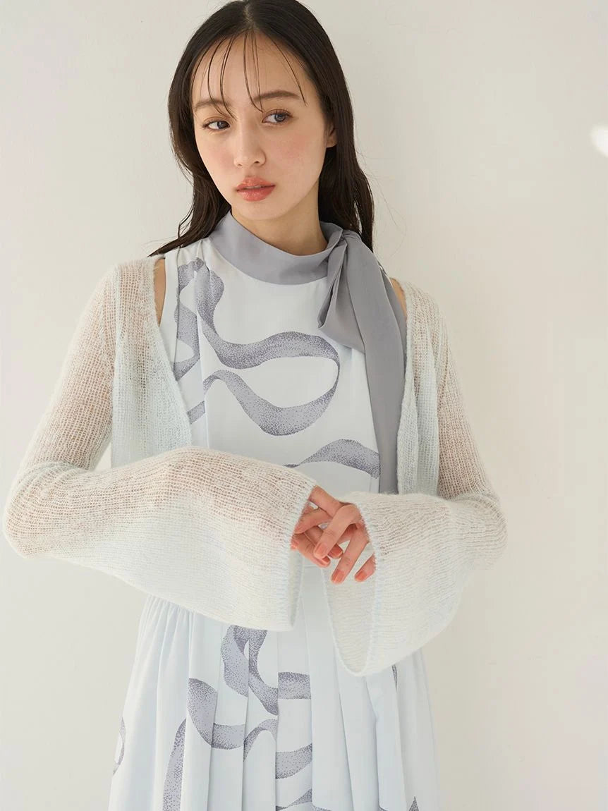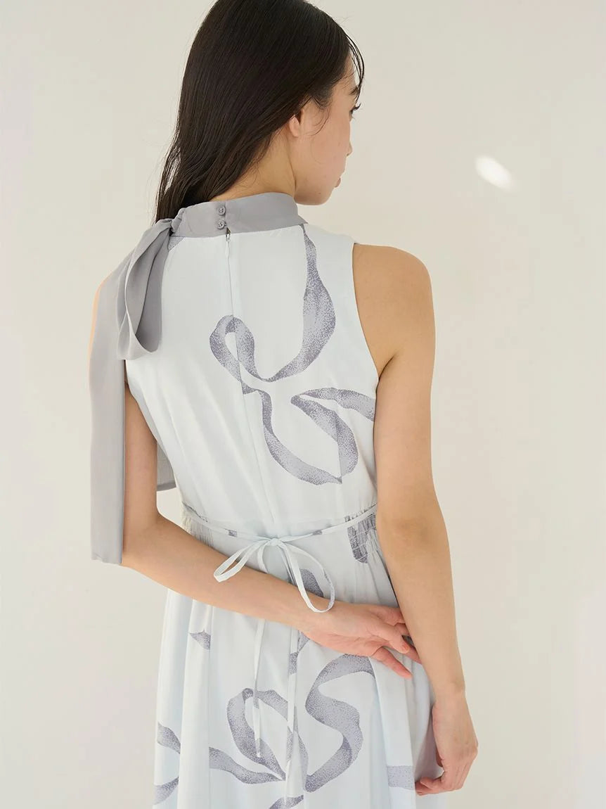 [Bowtie Dress and Knit Cardigan Set Featuring an Elegant Ribbon Print]