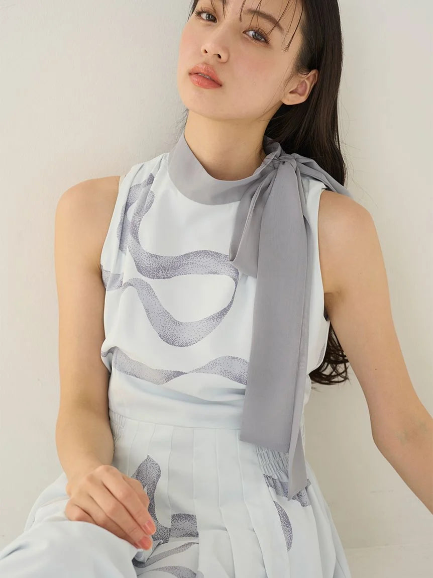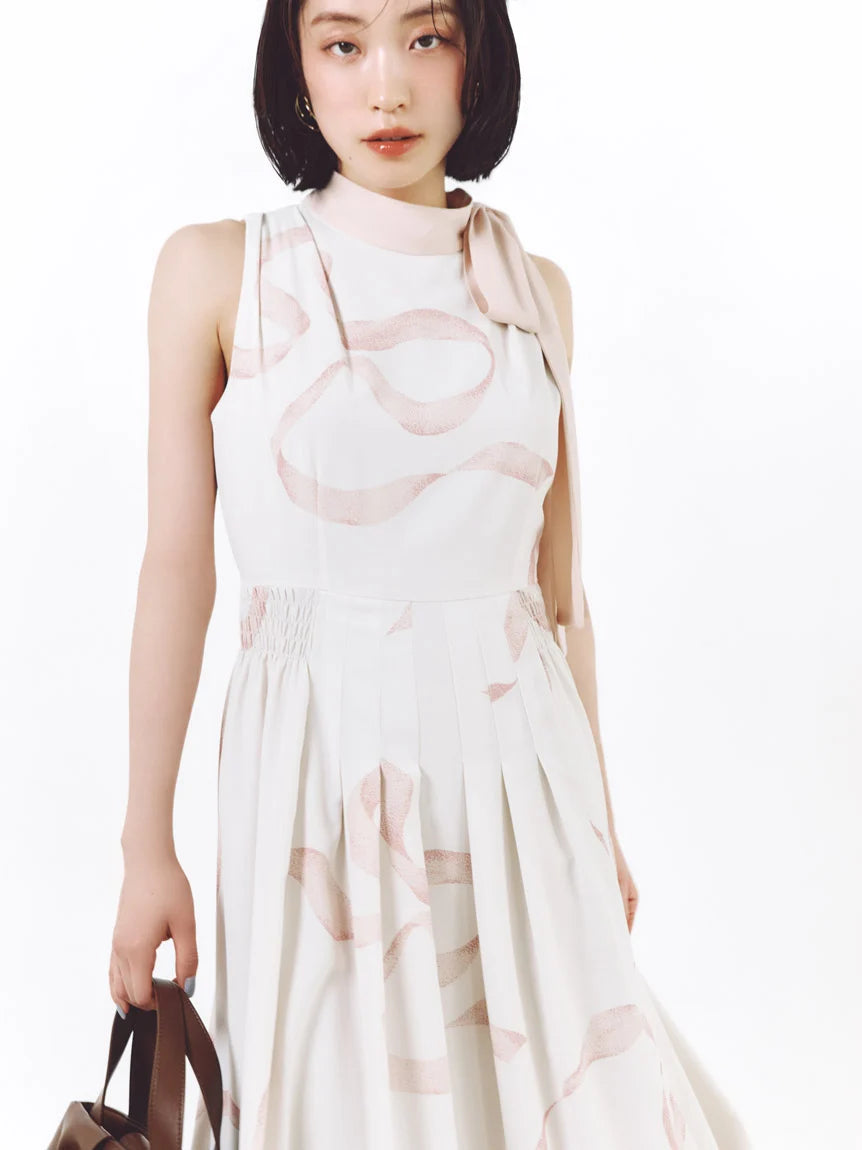 The sleeveless dress features a high-waisted seam and a pleated skirt that gently flares out toward the hem, creating an A-line silhouette.