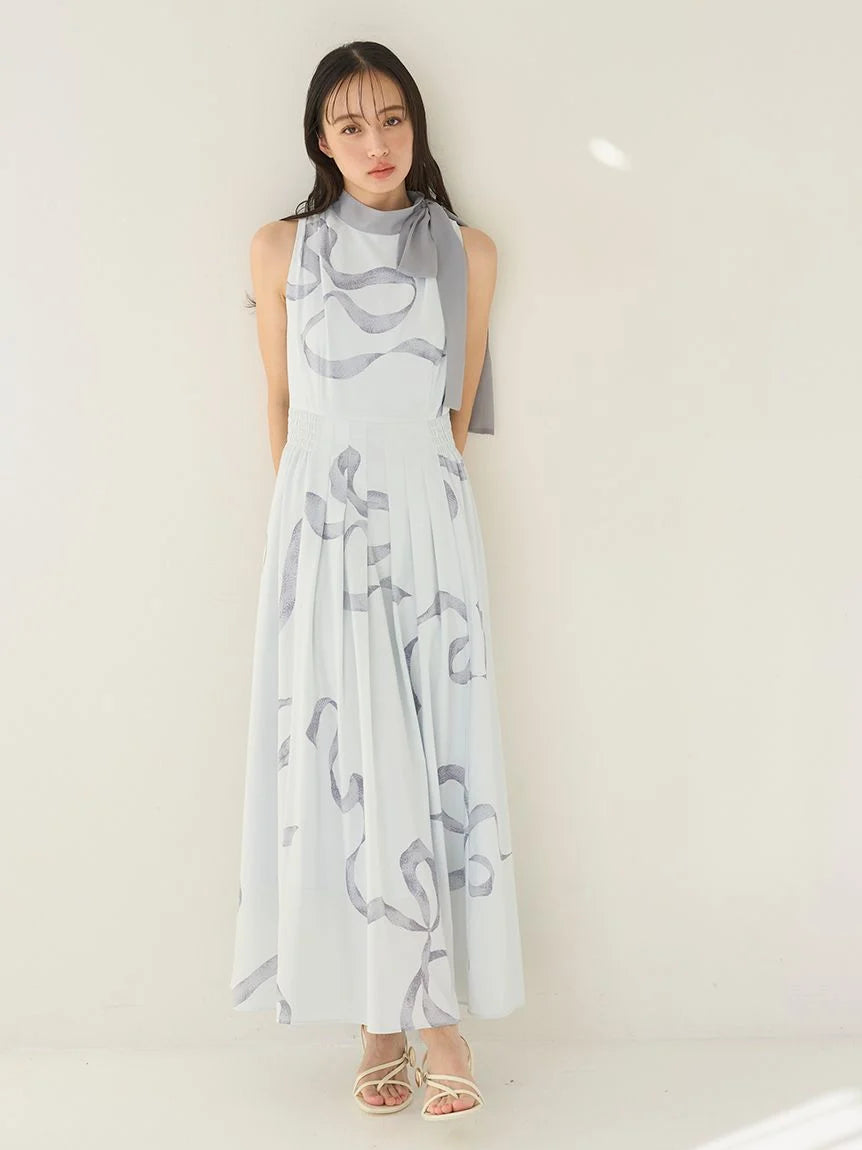 A long, contrasting-color bow tie ribbon at the neck adds a classic touch. The dress