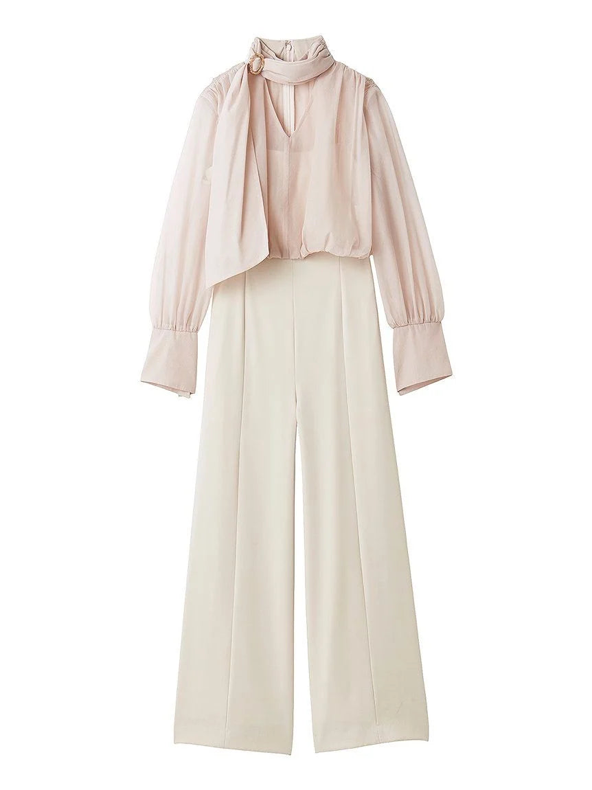 Available in two colors: "Black," featuring a gray blouse and black all-in-one and "Light Beige," featuring a pink blouse and light beige all-in-one.