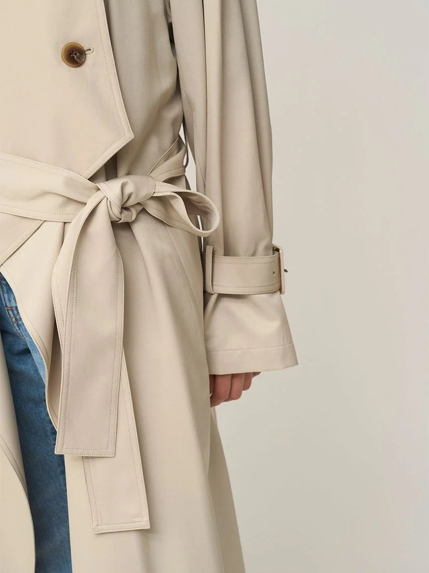 This long trench coat is an update to the ever-popular long trench coat. Based on a classic trench coat, the slightly oversized collar adds a touch of glamour to the face. The relaxed hemline creates a light, airy look. It can also be styled as a stand-up collar. It comes with arm straps that can be tightened for a more cinched look. It also includes a large stole made from the same fabric. Wrap it around your neck or fasten the side buttons for a more casual look. It also comes with a long waist belt that can be tied at the back or at the front.