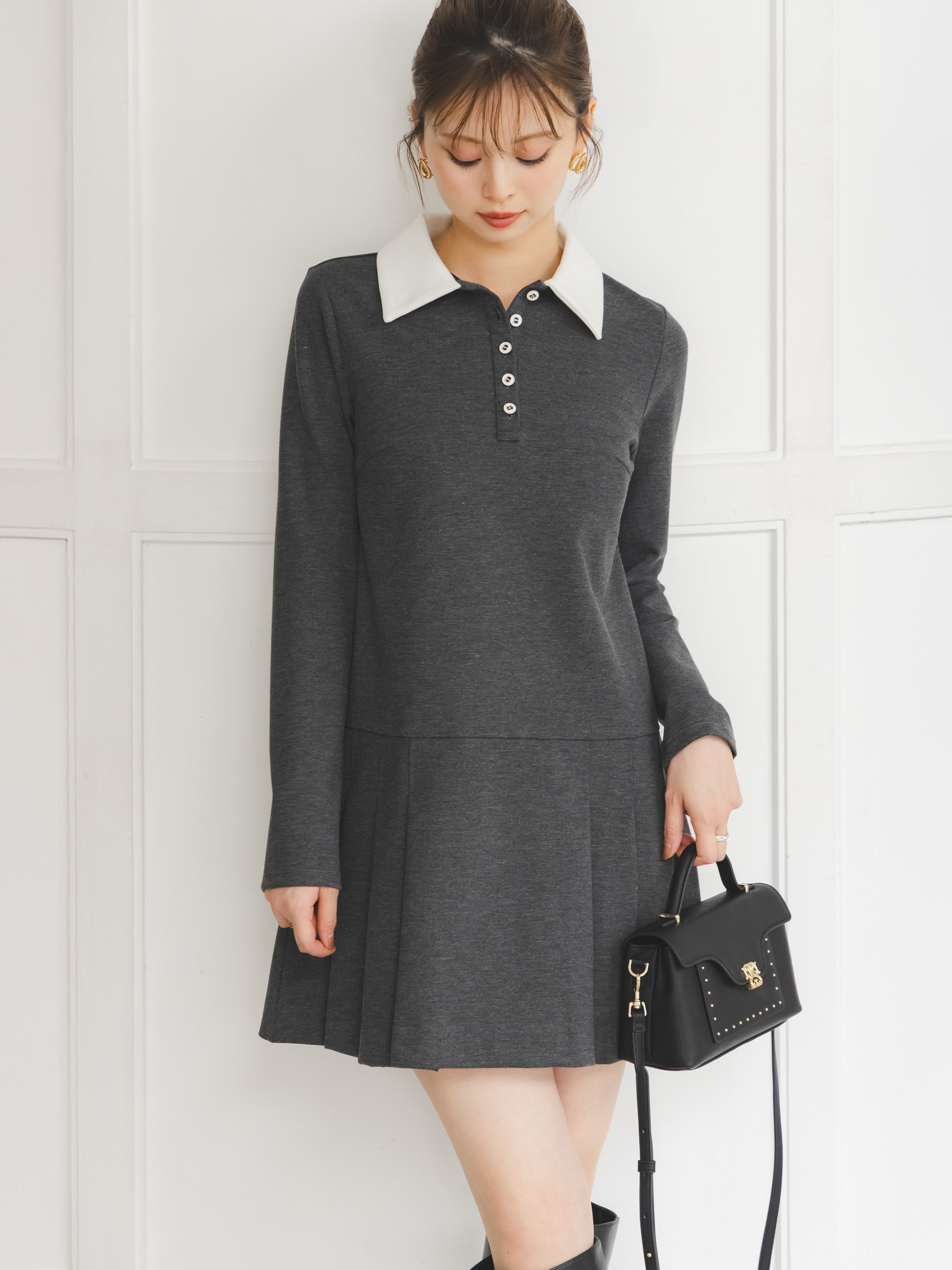 Introducing this collared dress crafted from thick, stretchy jersey fabric. Available in three colors, gray and black feature white collars and buttoned epo. The green color is the only color that's the same. The cut-out below the waist creates a boxy silhouette with a balanced silhouette perfect for this season. It flatters the figure while creating a flattering silhouette. The pleated side hem adds a touch of elegance. Simply unbutton the front and pull it on for easy on and off.