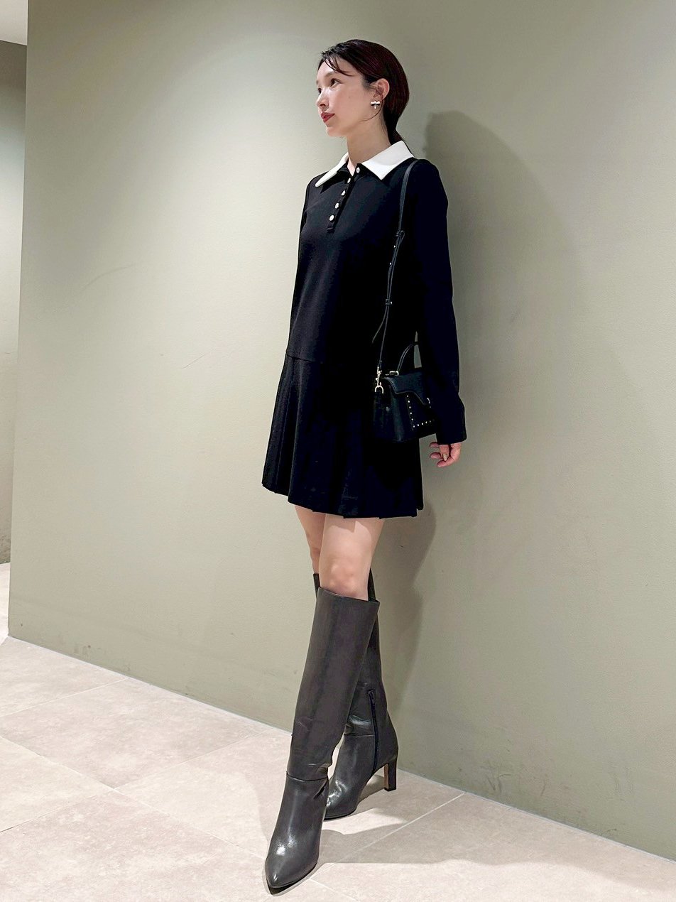 Available in two colors: dark gray with a white collar, classic black with a white collar. The gray color features a heathered fabric. Made with a thick, stretchy jersey fabric perfect for fall and winter. Made with sustainable fabric. Unlined. The pleats are one-sided.