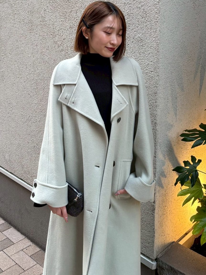 From SNIDEL’s “High-Quality Collection,” this long double-faced Balmacaan coat is meticulously crafted with a focus on exceptional materials. It features a soft, lightweight double-sided mossa fabric composed of 70% high-grade wool blended with 15% camel hair. Camel hair is known for its excellent heat-retention properties and its unique fiber texture—finer than sheep wool yet slightly thicker than cashmere—offering a supple feel with minimal itchiness and long-lasting softness. The coat is constructed in a warm, lightweight, and soft double-faced finish. A large collar that beautifully frames the face and a relaxing, roomy cut add refined elegance to any outfit. The collar can also be set standing for a different styling option. The wide belt at the cuffs adds details to the coordination, finishing in a stylish accent. Side pockets are included on both sides.