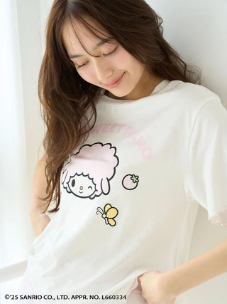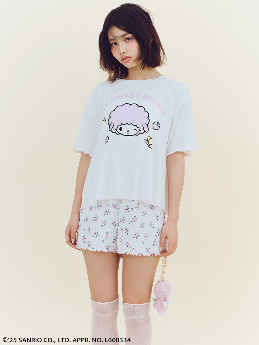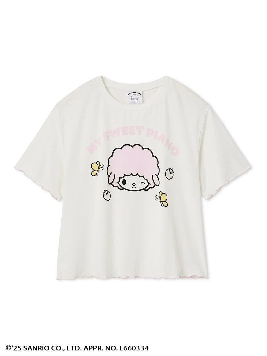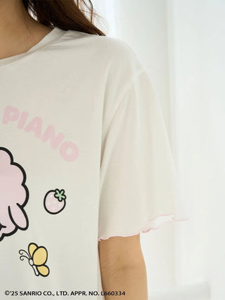 This colorful rayon T-shirt cool-to-the-touch. It is part of a pajama series inspired by My Melody and My Sweet Piano. It is maade from soft and drapey fabric that feels smooth against the skin. The tee features adorable prints of the characters’ faces along with strawberries, butterflies, and logo details. The sleeves and hem feature a contrast merrow stitching. This adds a subtle girly touch to the silhouette, creating a look that’s both cute and comfy.