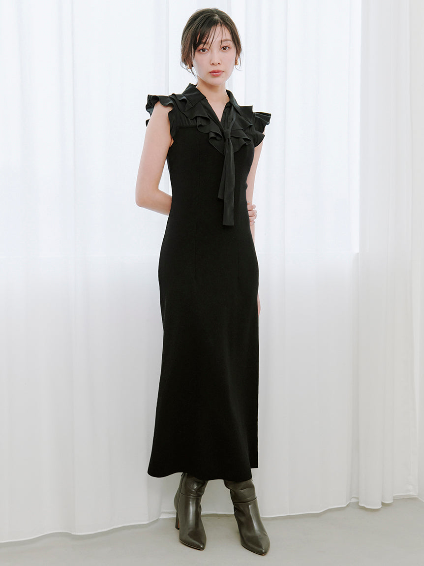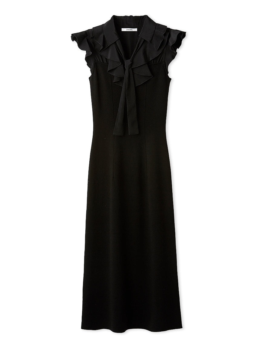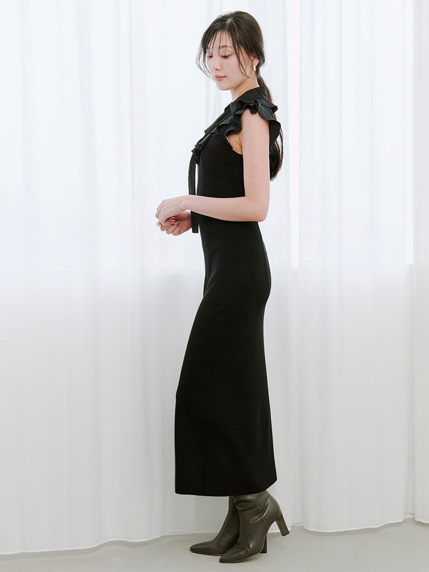 [Long-length knit dress with a ruffled bowtie that adds a touch of glamour to your face]