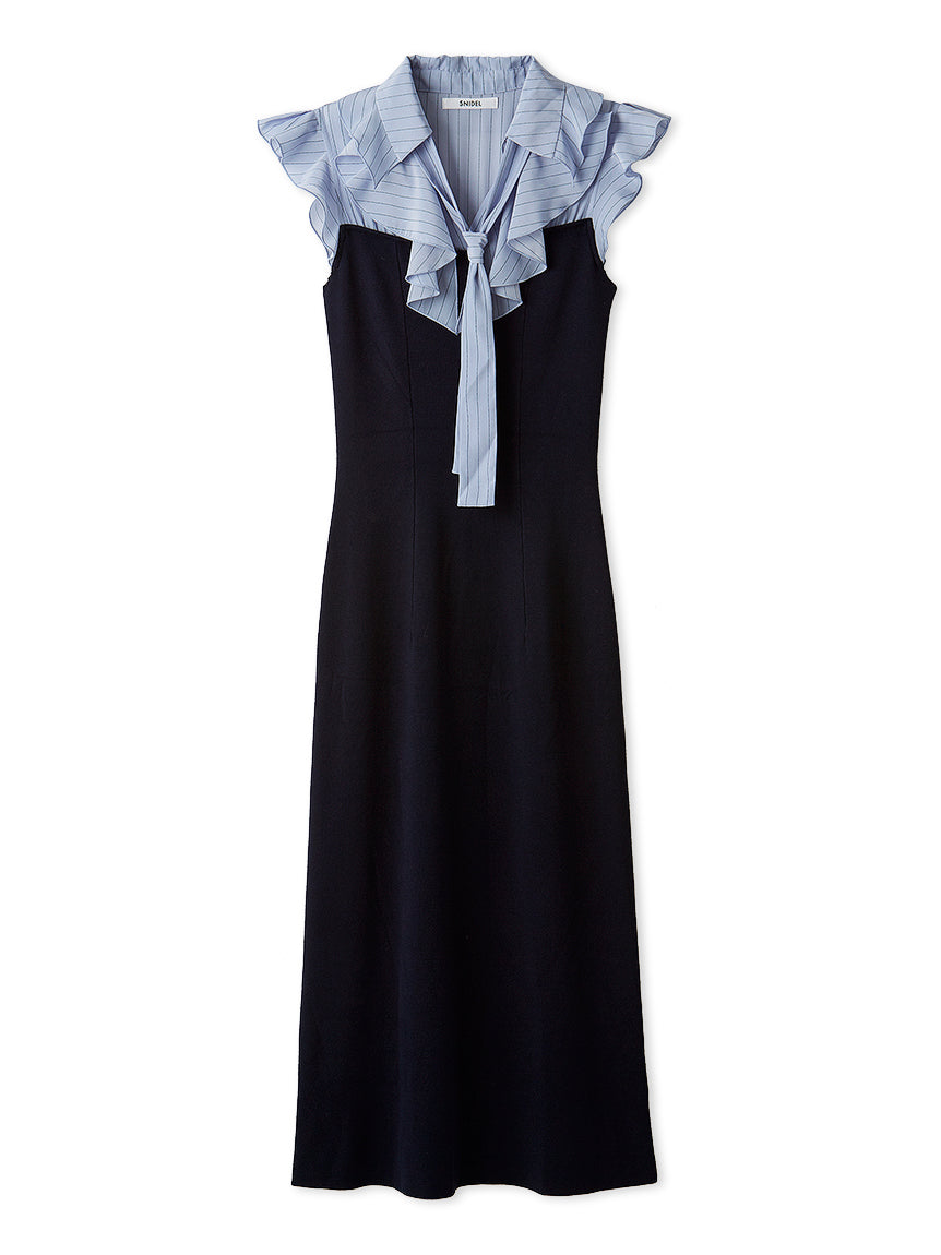 long knit dress features a bowtie blouse made of soft, lustrous material. The ruffled collar and bowtie, placed at the chest of the blouse's clean V-neck, create a gorgeous look. This sleeveless dress is packed with classic details and can be worn even in the warmer months. The knit body is made of eco-rayon, a smooth and comfortable material that provides a snug fit while still covering up any excess weight. The stretchy material allows for easy pull-on and easy removal. The curvy waist adds a flattering effect. The removable bowtie allows for customization to suit your style. Tying the tie in a necktie is trendy. A mini-length version (SWNO254253) made from the same material is also available.