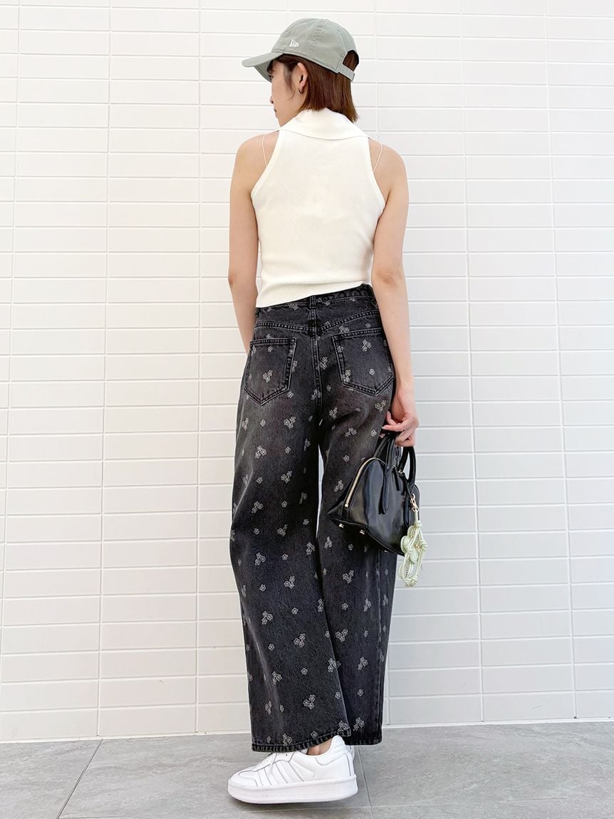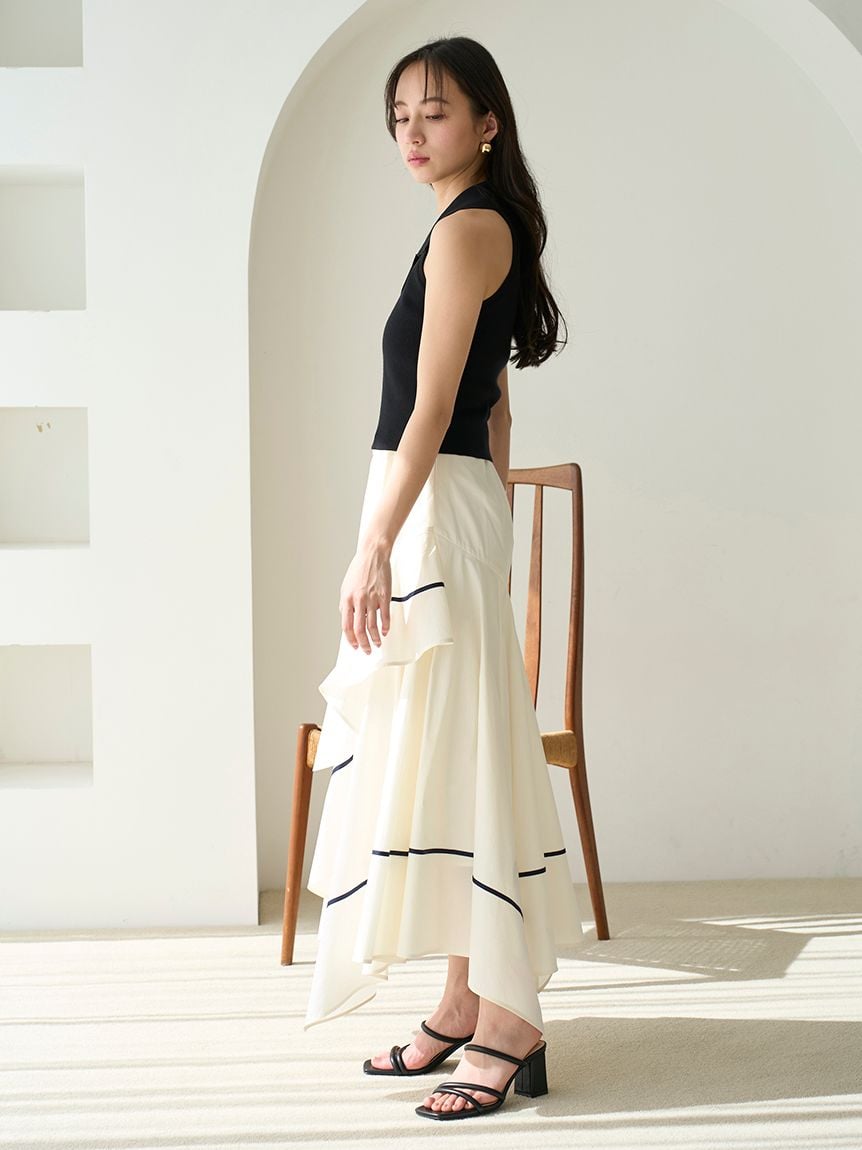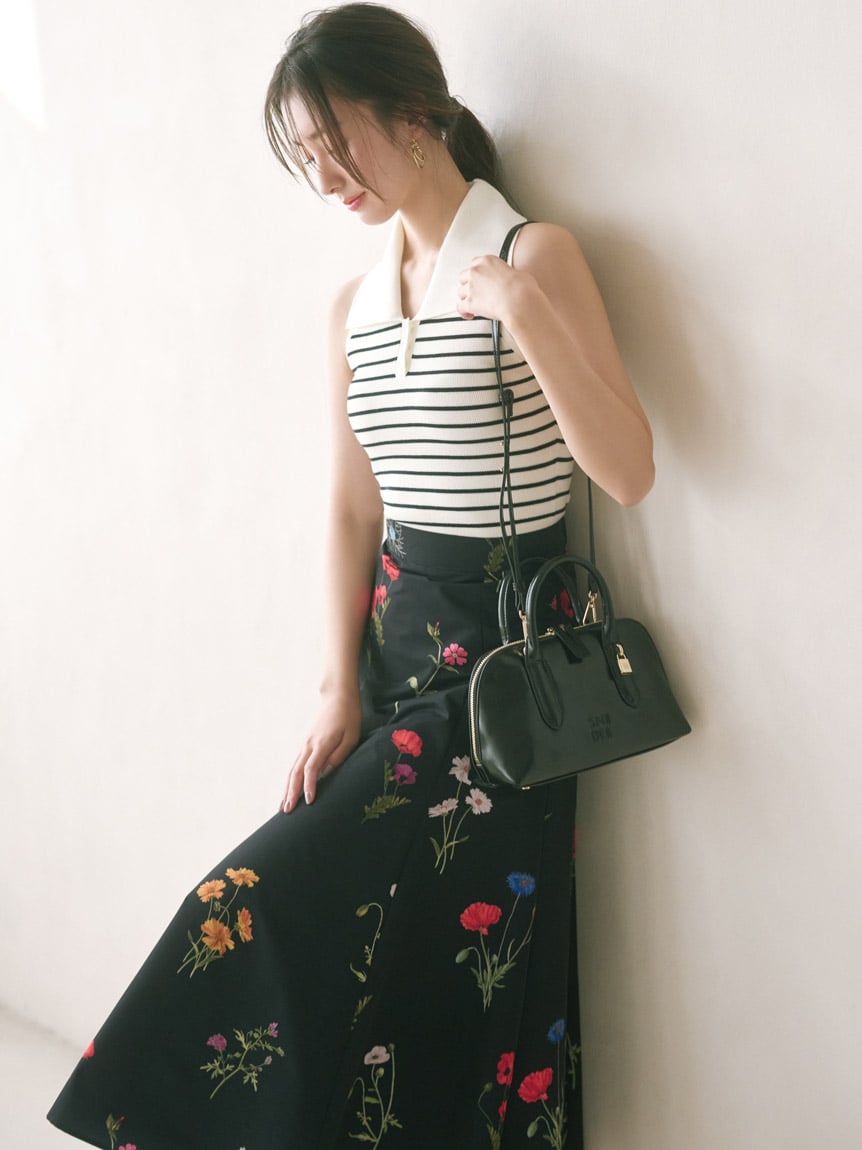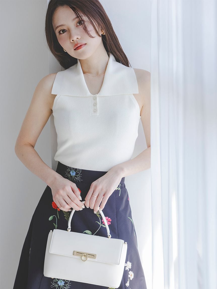 Available in four colors: ivory, black, lavender, and striped. Ivory, black, and lavender are one color. The striped part is black and white only on the body, and the collar is ivory. Made of rayon and polyester, it is a waffle-like knit fabric that feels smooth against the skin.