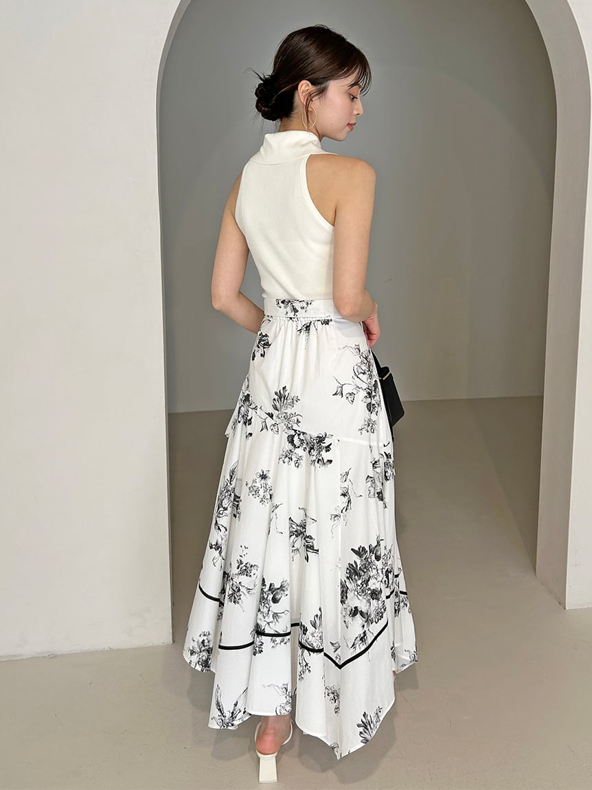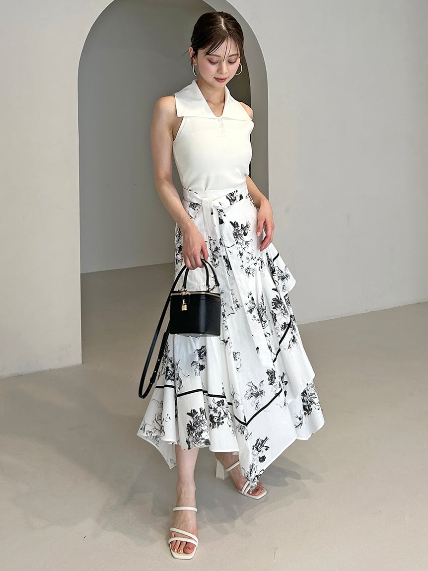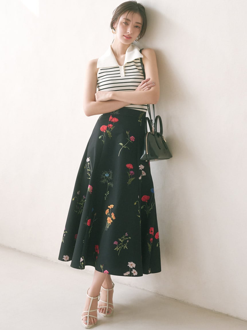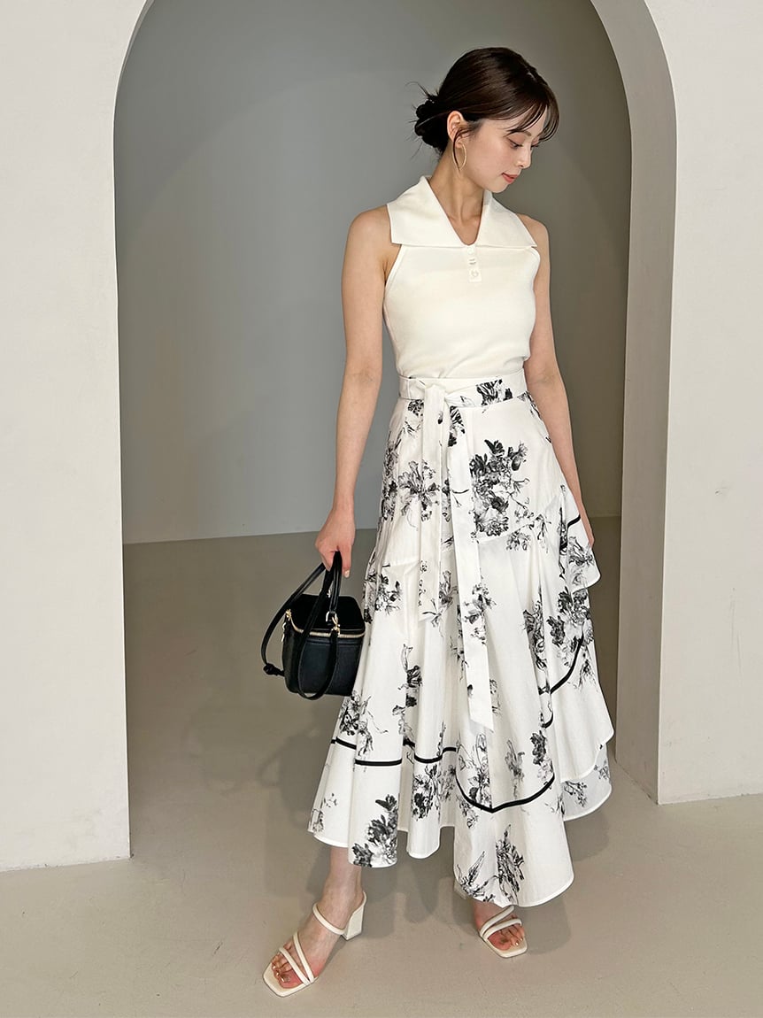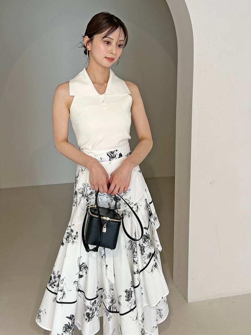 Available in four colors: ivory, black, lavender, and striped. Ivory, black, and lavender are one color. The striped part is black and white only on the body, and the collar is ivory. Made of rayon and polyester, it is a waffle-like knit fabric that feels smooth against the skin.